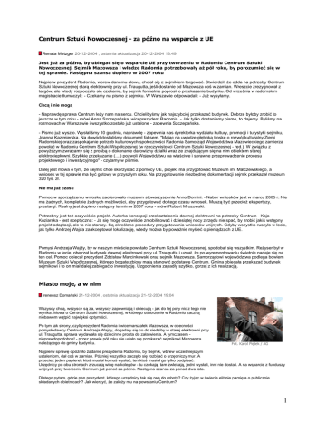 Centrum Sztuki Nowoczesnej - za późno na wsparcie z UE Renata Metzger 20-12-2004 , ostatnia aktualizacja 20-12-2004 18:49 Jest już za późno, by ubiegać się o wsparcie UE przy tworzeniu w Radomiu Centrum Sztuki Nowoczesnej. Sejmik Mazowsza i władze Radomia potrzebowały aż pół roku, by porozumieć się w tej sprawie. Następna szansa dopiero w 2007 roku Najpierw prezydent Radomia, wbrew danemu słowu, chciał się z sejmikiem targować. Stwierdził, że odda na potrzeby Centrum Sztuki Nowoczesnej starą elektrownię przy ul. Traugutta, jeśli dostanie od Mazowsza coś w zamian. Wreszcie zrezygnował z targów, ale wtedy rozpoczęło się czekanie, by sejmik formalnie poprosił o przekazanie budynku. Od września w radomskim magistracie tłumaczyli: - Czekamy na pismo z sejmiku. W Warszawie odpowiadali: - Już wysyłamy. Chcą i nie mogą - Naprawdę sprawa Centrum leży nam na sercu. Chcielibyśmy jak najszybciej przekazać budynek. Dobrze byłoby zrobić to jeszcze w tym roku - mówi Anna Szczepańska, wiceprezydent Radomia. - Jak tylko dostaniemy pismo, to dajemy. Byliśmy na rozmowach w Warszawie i wszystko zostało już ustalone - zapewnia Szczepańska. - Pismo już wyszło. Wysłaliśmy 10 grudnia, naprawdę - zapewnia nas dyrektorka wydziału kultury, promocji i turystyki sejmiku, Joanna Kazimierska. Na dowód dostaliśmy dokument faksem. "Mając na uwadze głęboką troskę o rozwój kulturalny Ziemi Radomskiej oraz zaspokajanie potrzeb kulturowych społeczności Radomia Samorząd Województwa Mazowieckiego zamierza powołać w Radomiu Centrum Sztuki Współczesnej (w rzeczywistości Centrum Sztuki Nowoczesnej - red.). W związku z powyższym zwracamy się z prośbą o dokonanie darowizny działki wraz ze znajdującym się na nim obiektem starej elektrociepłowni. Szybkie przekazanie (....) pozwoli Województwu na właściwe i sprawne przeprowadzenie procesu projektowego i inwestycyjnego" - czytamy w piśmie. Dalej jest mowa o tym, że sejmik chce skorzystać z pomocy UE, projekt ma przygotować Muzeum im. Malczewskiego, a wniosek w tej sprawie ma być gotowy w przyszłym roku. Na przygotowanie niezbędnej dokumentacji sejmik przekazał muzeum 320 tys. zł. Nie ma już czasu Pomoc w sporządzeniu wniosku zaoferowało muzeum stowarzyszenie Anno Domini. - Nabór wniosków jest w marcu 2005 r. Nie ma żadnych, kompletnie żadnych możliwości, aby przygotować do tego czasu wniosek. Muszą być przecież ekspertyzy, przetargi. Realny jest dopiero następny termin w 2007 roku - mówi Robert Mrozowski. Potrzebny jest też oczywiście projekt. Autorka koncepcji przekształcenia dawnej elektrowni na potrzeby Centrum - Kaja Koziarska - jest sceptyczna: - Ja się mogę oczywiście zmobilizować i dziesiątej nocy z rzędu nie spać, by zrobić jakiś wstępny projekt adaptacji, ale to nie starczy. Są określone procedury przygotowania wniosków unijnych. Gdyby wszystko ruszyło w lecie, jak tylko Andrzej Wajda zaakceptował lokalizację, wtedy można by poważnie myśleć o pieniądzach z UE. Pomysł Andrzeja Wajdy, by w naszym mieście powstało Centrum Sztuki Nowoczesnej, spodobał się wszystkim. Reżyser był w Radomiu w lecie, obejrzał budynek dawnej elektrowni przy ul. Traugutta i uznał, że po wyremontowaniu świetnie nadaje się na ten cel. Pomoc obiecał prezydent Zdzisław Marcinkowski oraz sejmik Mazowsza. Samorządowi województwa podlega bowiem Muzeum Sztuki Współczesnej, którego bogate zbiory mają stanowić podstawę Centrum. Gmina obiecała przekazać budynek sejmikowi i to on miał dalej zabiegać o inwestycję. Uzgodnienia zapadły szybko, gorzej z ich realizacją. Miasto moje, a w nim Ireneusz Domański 21-12-2004 , ostatnia aktualizacja 21-12-2004 19:04 Wszyscy chcą, wszyscy są za, wszyscy zapewniają i obiecują - jak do tej pory nic z tego nie wynika. Mowa o Centrum Sztuki Nowoczesnej, w którego utworzenie w Radomiu zaczną niebawem wątpić najwięksi optymiści. Po tym jak strony, czyli prezydent Radomia i wicemarszałek Mazowsza, w obecności pomysłodawcy Centrum Andrzeja Wajdy, dogadały się co do siedziby w starej elektrowni przy ul. Traugutta, sprawa wydawała się dziecinne prosta do załatwienia. A tymczasem nieprawdopodobne! - przez prawie pół roku nie udało się przekazać sejmikowi Mazowsza należącego do gminy budynku. Fot. Karol Piętek / AG Najpierw sprawę opóźniło żądanie prezydenta Radomia, by Sejmik, wbrew wcześniejszym ustaleniom, dał coś w zamian. Później wszystko zaczęło się rozbijać o urzędniczy mur. A przecież jeden papierek ktoś musiał komuś wysłać, ten ktoś musiał go tylko podpisać. Urzędnicy po obu stronach zrzucają winę na kolegów - tu czekają, tam zwlekają, jedni wysłali, inni nie dostali. A na wsparcie z funduszy unijnych przy tworzeniu Centrum już ponoć za późno. Następna szansa za ponad dwa lata. Dlatego pytam, gdzie pan prezydent, którego urzędnicy tak się rwą do roboty? Czy żyjąc w świecie elit nie pamięta o publicznie składanych obietnicach? Jak wierzyć, że zależy mu na powstaniu Centrum? 1 Czy pan wicemarszałek Mazowsza nie mógł spowodować, by jego podwładni szybciej wysłali jakieś tam dokumenty? Tych kilka miesięcy, przez urzędniczą bierność, jest już bezpowrotnie straconych. Jeśli zabawa w ciuciubabkę będzie trwać, jeśli nadal będą rzucane słowa na wiatr, stracimy kolejne miesiące i lata a Centrum Sztuki Nowoczesnej w Radomiu nie będzie. Zamienimy kolejną szansę na kolejną klęskę. Pozostanie nam wtedy zmienić urzędników. 2