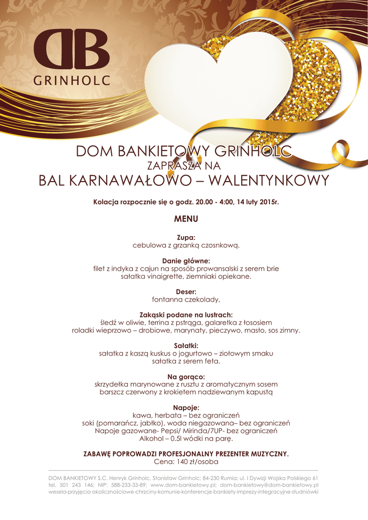 DOM BANKIETOWY GRINHOLC ZAPRASZA NA BAL KARNAWAÙOWO – WALENTYNKOWY Kolacja rozpocznie siæ o godz. 20.00 - 4:00, 14 luty 2015r. MENU Zupa: cebulowa z grzankà czosnkowà. Danie gùówne: filet z indyka z cajun na sposób prowansalski z serem brie saùatka vinaigrette, ziemniaki opiekane. Deser: fontanna czekolady, Zakàski podane na lustrach: úledê w oliwie, terrina z pstràga, galaretka z ùososiem roladki wieprzowo – drobiowe, marynaty, pieczywo, masùo, sos zimny. Saùatki: saùatka z kaszà kuskus o jogurtowo – zioùowym smaku saùatka z serem feta. Na goràco: skrzydeùka marynowane z rusztu z aromatycznym sosem barszcz czerwony z krokietem nadziewanym kapustà Napoje: kawa, herbata – bez ograniczeñ soki (pomarañcz, jabùko), woda niegazowana– bez ograniczeñ Napoje gazowane- Pepsi/ Mirinda/7UP- bez ograniczeñ Alkohol – 0.5l wódki na paræ. ZABAWÆ POPROWADZI PROFESJONALNY PREZENTER MUZYCZNY. Cena: 140 zù/osoba DOM BANKIETOWY S.C. Henryk Grinholc, Stanis³aw Grinholc; 84-230 Rumia; ul. I Dywizji Wojska Polskiego 61 tel. 501 243 146; NIP: 588-233-33-89; www.dom-bankietowy.pl; [email protected] wesela przyjêcia okolicznoœciowe chrzciny komunie konferencje bankiety imprezy integracyjne studniówki
