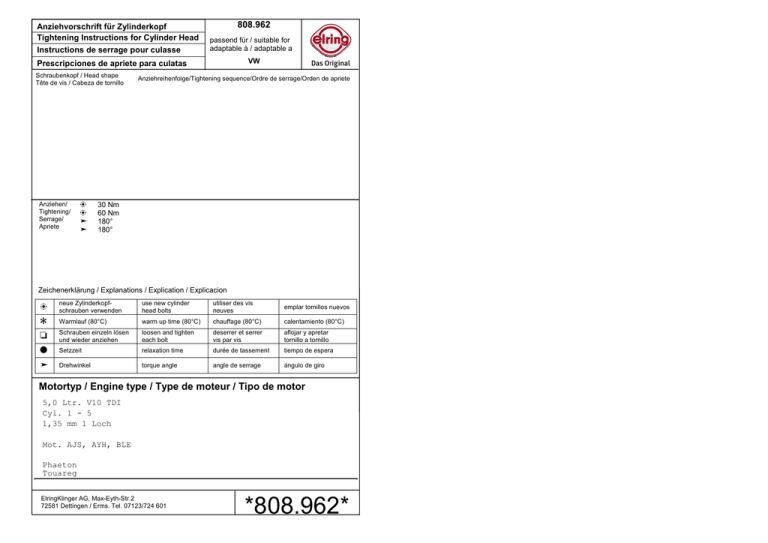 Anziehvorschrift für Zylinderkopf Tightening Instructions for Cylinder Head Instructions de serrage pour culasse 808.962 passend für / suitable for adaptable à / adaptable a VW Prescripciones de apriete para culatas Schraubenkopf / Head shape Tête de vis / Cabeza de tornillo Anziehen/ Tightening/ Serrage/ Apriete E E ³ ³ Anziehreihenfolge/Tightening sequence/Ordre de serrage/Orden de apriete 30 Nm 60 Nm 180° 180° Zeichenerklärung / Explanations / Explication / Explicacion E neue Zylinderkopfschrauben verwenden 4 Warmlauf (80°C) R Schrauben einzeln lösen und wieder anziehen O Setzzeit ³ Drehwinkel use new cylinder head bolts utiliser des vis neuves emplar tornillos nuevos warm up time (80°C) chauffage (80°C) calentamiento (80°C) loosen and tighten each bolt deserrer et serrer vis par vis aflojar y apretar tornillo a tornillo relaxation time durée de tassement tiempo de espera torque angle angle de serrage ángulo de giro Motortyp / Engine type / Type de moteur / Tipo de motor 5,0 Ltr. V10 TDI Cyl. 1 - 5 1,35 mm 1 Loch Mot. AJS, AYH, BLE Phaeton Touareg ElringKlinger AG, Max-Eyth-Str.2 72581 Dettingen / Erms. Tel. 07123/724 601 *808.962*