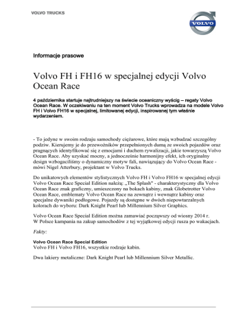 Informacje prasowe Volvo FH i FH16 w specjalnej edycji Volvo Ocean Race 4 października startuje najtrudniejszy na świecie oceaniczny wyścig – regaty Volvo Ocean Race. W oczekiwaniu na ten moment Volvo Trucks wprowadza na modele Volvo FH i Volvo FH16 w specjalnej, limitowanej edycji, inspirowanej tym właśnie wydarzeniem. - To jedyne w swoim rodzaju samochody ciężarowe, które mają wzbudzać szczególny podziw. Kierujemy je do przewoźników przepełnionych dumą ze swoich pojazdów oraz pragnących identyfikować się z emocjami i duchem rywalizacji, jakie towarzyszą Volvo Ocean Race. Aby uzyskać mocny, a jednocześnie harmonijny efekt, ich oryginalny design wzbogaciliśmy o dynamiczny motyw fali, nawiązujący do Volvo Ocean Race mówi Nigel Atterbury, projektant w Volvo Trucks. Do unikatowych elementów stylistycznych Volvo FH i Volvo FH16 w specjalnej edycji Volvo Ocean Race Special Edition należą: „The Splash" - charakterystyczny dla Volvo Ocean Race znak graficzny, umieszczony na bokach kabiny, znak Globetrotter Volvo Ocean Race, emblematy Volvo Ocean Race na zewnątrz i wewnątrz kabiny oraz specjalne dywaniki podłogowe. Pojazdy są dostępne w dwóch niepowtarzalnych kolorach do wyboru: Dark Knight Pearl lub Millennium Silver Graphics. Volvo Ocean Race Special Edition można zamawiać począwszy od wiosny 2014 r. W Polsce kampania na zakup samochodów z tej wyjątkowej edycji rusza po wakacjach. Fakty: Volvo Ocean Race Special Edition Volvo FH i Volvo FH16, wszystkie rodzaje kabin. Dwa lakiery metaliczne: Dark Knight Pearl lub Millennium Silver Metallic. Znak Globetrotter Volvo Ocean Race. Znaki graficzne „The Splash" na kabinie. Emblematy Volvo Ocean Race na zewnątrz i wewnątrz kabiny. Dywaniki podłogowe Volvo Ocean Race (w przypadku FH16 na dywanika znajduje się także oznaczenie modelu). Informacje o Volvo Ocean Race Regaty Volvo Ocean Race są jest jednym z najbardziej wyczerpujących oceanicznych wyścigów na świecie. Są rozgrywane po raz dwunasty. Start nastąpi 4 października 2014 r. w Alicante, w Hiszpanii, zaś zakończenie - 27 czerwca 2015 r. w Goeteborgu, w Szwecji. Przystanki etapowe przewidziano w następujących miastach: Kapsztad (Afryka Południowa), Abu Zabi (Zjednoczone Emiraty Arabskie), Sanya (Chiny), Auckland (Nowa Zelandia), Itajaí (Brazylia), Newport (Stany Zjednoczone), Lizbona (Portugalia), Lorient (Francja), i Haga (Holandia). Łączny dystans regat to 38 729 mil morskich. Współwłacicielami projektu Volvo Ocean Race są Grupa Volvo (do której należy Volvo Trucks) i Volvo Cars. W celu uzyskania dodatkowych informacji, prosimy o kontakt z: Ida Mattsson, Volvo Trucks Media Relations. Tel.: +46 31 323 63 42, e-mail: [email protected] Aby uzyskać dostęp do filmów o jakości telewizyjnej, związanych z niniejszą informacją prasową i nie tylko, odwiedź stronę http://www.thenewsmarket.com/volvotrucks Zdjęcia i filmy są dostępne w galerii zdjęć i filmów Volvo Trucks, pod adresem http://images.volvotrucks.com Koncern Volvo Trucks dostarcza kompletne rozwiązania transportowe dla profesjonalistów i wymagających klientów, oferując pełną gamę samochodów ciężarowych o średniej i dużej ładowności. Serwis zapewnia 2100 dealerów i stacji obsługi w ponad 140 krajach. Samochody ciężarowe są produkowane w 14 krajach. W 2013 r. dostarczono ponad 116 000 tych pojazdów. Koncern Volvo Trucks jest częścią Grupy Volvo, jednego z czołowych światowych producentów samochodów ciężarowych, autobusów, maszyn budowlanych oraz morskich i stacjonarnych układów napędowych. Grupa Volvo dostarcza również kompletne rozwiązania finansowe i serwisowe. Kluczowymi wartościami Volvo są jakość, bezpieczeństwo i troska o środowisko naturalne.