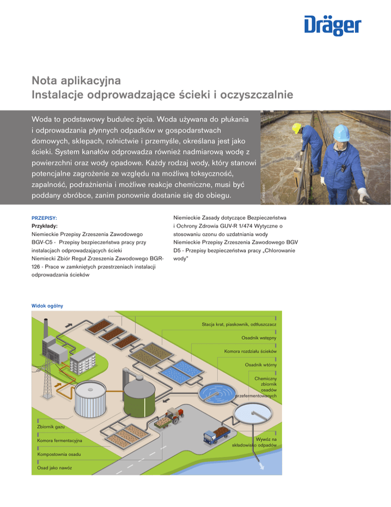 Woda to podstawowy budulec życia. Woda używana do płukania i odprowadzania płynnych odpadków w gospodarstwach domowych, sklepach, rolnictwie i przemyśle, określana jest jako ścieki. System kanałów odprowadza również nadmiarową wodę z powierzchni oraz wody opadowe. Każdy rodzaj wody, który stanowi potencjalne zagrożenie ze względu na możliwą toksyczność, zapalność, podrażnienia i możliwe reakcje chemiczne, musi być poddany obróbce, zanim ponownie dostanie się do obiegu. PRZEPISY: Przykłady: Niemieckie Przepisy Zrzeszenia Zawodowego BGV-C5 - Przepisy bezpieczeństwa pracy przy instalacjach odprowadzających ścieki Niemiecki Zbiór Reguł Zrzeszenia Zawodowego BGR126 - Prace w zamkniętych przestrzeniach instalacji odprowadzania ścieków ST-7412-2005 Nota aplikacyjna Instalacje odprowadzające ścieki i oczyszczalnie Niemieckie Zasady dotyczące Bezpieczeństwa i Ochrony Zdrowia GUV-R 1/474 Wytyczne o stosowaniu ozonu do uzdatniania wody Niemieckie Przepisy Zrzeszenia Zawodowego BGV D5 - Przepisy bezpieczeństwa pracy „Chlorowanie wody” Widok ogólny Stacja krat, piaskownik, odtłuszczacz Osadnik wstępny Komora rozdziału ścieków Osadnik wtórny Chemiczny zbiornik osadów przefermentowanych Zbiornik gazu Komora fermentacyjna Kompostownia osadu Osad jako nawóz Wywóz na składowisko odpadów 02 | INSTALACJE ODPROWADZAJĄCE ŚCIEKI I OCZYSZCZALNIE INSTALACJA ODPROWADZANIA ŚCIEKÓW Poprzez kanalizację, zanieczyszczone wody z gospodarstw domowych i przemysłu, podobnie jak wody opadowe i roztopowe, odprowadzane są do oczyszczalni, gdzie następnie poddawane są procesom oczyszczającym. Oprócz sieci kanałów, do kanalizacji zaliczają się również różne instalacje pomp, rozdziału czy czyszczenia mechanicznego. By utrzymać sprawność tych, często wielokilometrowych systemów, konieczne są obszerne prace inspekcyjne, oczyszczania i konserwacyjne. Prace te wymagają wejścia pracownika do kanałów czy szybów. Wtedy mówi się o pracach w pomieszczeniach zamkniętych instalacji odprowadzających ścieki. W nocie aplikacyjnej „Confined Space Entry” opisane są wymagania oraz zalecenia odnośnie osobistego wyposażenia ochronnego. OCZYSZCZANIE MECHANICZNE Ścieki podążają systemem kanałów do oczyszczalni. Pierwszym krokiem jest oczyszczanie z ciał stałych pływających i grubych zawiesin mineralnych oraz organicznych, przy pomocy stacji krat. Często stacje te znajdują się w budynkach, przez co stanowią zamknięte instalacje. Wraz ze ściekami do stacji krat mogą również trafić oleje opałowe, benzyna i inne substancje palne. Z tego powodu konieczny jest pomiar gazów palnych i par. W wielu oczyszczalniach pomieszczenia te są monitorowane przez stacjonarne systemy detekcji gazów. Jeżeli jednak tak nie jest, to przed wejściem do tych pomieszczeń konieczny jest pomiar za pomocą mobilnych urządzeń do pomiaru gazu. OCZYSZCZANIE BIOLOGICZNE Poprzez kolejne mechaniczne etapy oczyszczania z wykorzystaniem: piaskownika, odtłuszczacza i osadnika wstępnego, woda poddawana jest biologicznemu oczyszczaniu, podczas którego usuwanych jest 85 - 90 % substancji szkodliwych. Mieszanka złożona ze ścieków, bakterii i drobnoustrojów napowietrzana jest w tak zwanych komorach rozdziału ścieków. Tlen (proces aerobowy) przyśpiesza wzrost korzystnych drobnoustrojów, które wytwarzają substancje organiczne. Podczas procesu aerobowego, zwłaszcza jeżeli zbiorniki znajdują się wewnątrz budynków, pomiar dwutlenku węgla (CO2) i tlenu (O2 - ryzyko braku tlenu) może być konieczny. Jeżeli podczas procesu nastąpi awaria, to może być konieczny pomiar metanu (CH4) i siarkowodoru (H2S). Dlatego zaleca się noszenie osobistego przyrządu do pomiaru gazu. OCZYSZCZANIE CHEMICZNE Zanim oczyszczona woda ponownie wpłynie do rzek, jezior czy mórz, poddawana jest oczyszczaniu chemicznemu. Jako środek dezynfekcyjny używany jest chlor. Alternatywnie stosuje się również dwutlenek chloru, ozon lub światło UV. Ozonowanie (utlenianie ozonem) zyskuje w ostatnich latach coraz większe znaczenie. Jest to metoda wyjaławiania i dezynfekcji, którą stosuje się przy uzdatnianiu wody pitnej; znalazła ona również zastosowanie w czyszczeniu chemicznym ścieków. Tutaj chodzi głównie o usunięcie mikrozanieczyszczeń. Przez wydzieliny ciała lub stosowanie lekarstw, farmaceutyczne substancje aktywne dostają się do ścieków, co powoduje długotrwałe zagrożenie. Ze względu na to, że wszystkie stosowane środki dezynfekcyjne posiadają bardzo niską wartość graniczną, konieczny jest pomiar ekspozycji osobistej podczas chemicznego oczyszczania. Również dla monitorowania zbiorników pod kątem ich nieszczelności, można stosować mierniki gazu i odpowiednie pompki. Rurki wskaźnikowe Dräger doskonale nadają się do pomiarów tego rodzaju. KOMORA FERMENTACYJNA Powstały podczas oczyszczania osad doprowadzany jest do komory fermentacyjnej. W warunkach anaerobowych (beztlenowych) bakterie z kompostowni osadu przetwarzają go na osad pofermentacyjny, wytwarzając przy tym gaz pofermentacyjny. Gaz ten składa się w 60 – 70 % z metanu, 25 do 35 % z dwutlenku węgla i kilkuset ppm siarkowodoru. Obszary te określane są mianem stref zagrożenia wybuchem. Jak w przypadku wszystkich takich stref, także i tu obowiązują szczególne środki bezpieczeństwa. Jednym z takich środków jest noszenie osobistego wyposażenia alarmującego o wystąpieniu gazu. ZBIORNIK GAZU W większości oczyszczalni gaz pofermentacyjny gromadzony jest w zbiornikach gazu i, podobnie jak w przypadku instalacji biogazu, stosowany jest do wytwarzania prądu lub ciepła w tak zwanych agregatach kogeneracyjnych (tutaj obowiązuje oddzielna nota aplikacyjna). KOMPOSTOWNIA OSADU Osad przefermentowany zagęszczany jest w tak zwanych zagęszczaczach, by zmniejszyć ich objętość i ilość wody. Pozostały osad, jeżeli jest wolny od substancji szkodliwych, można