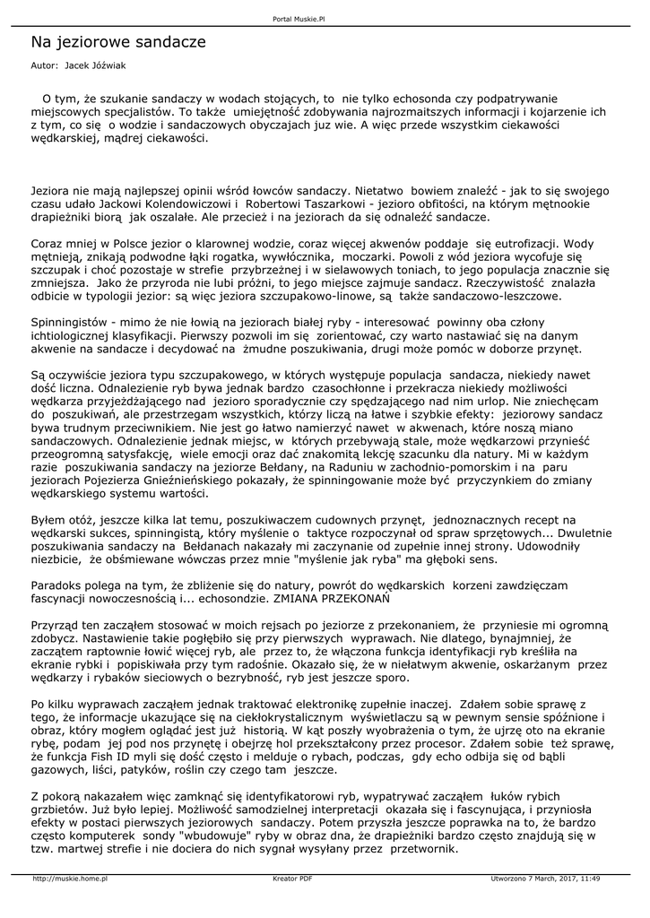 Portal Muskie.Pl Na jeziorowe sandacze Autor: Jacek Jóźwiak O tym, że szukanie sandaczy w wodach stojących, to nie tylko echosonda czy podpatrywanie miejscowych specjalistów. To także umiejętność zdobywania najrozmaitszych informacji i kojarzenie ich z tym, co się o wodzie i sandaczowych obyczajach juz wie. A więc przede wszystkim ciekawości wędkarskiej, mądrej ciekawości. Jeziora nie mają najlepszej opinii wśród łowców sandaczy. Nietatwo bowiem znaleźć - jak to się swojego czasu udało Jackowi Kolendowiczowi i Robertowi Taszarkowi - jezioro obfitości, na którym mętnookie drapieżniki biorą jak oszalałe. Ale przecież i na jeziorach da się odnaleźć sandacze. Coraz mniej w Polsce jezior o klarownej wodzie, coraz więcej akwenów poddaje się eutrofizacji. Wody mętnieją, znikają podwodne łąki rogatka, wywłócznika, moczarki. Powoli z wód jeziora wycofuje się szczupak i choć pozostaje w strefie przybrzeżnej i w sielawowych toniach, to jego populacja znacznie się zmniejsza. Jako że przyroda nie lubi próżni, to jego miejsce zajmuje sandacz. Rzeczywistość znalazła odbicie w typologii jezior: są więc jeziora szczupakowo-linowe, są także sandaczowo-leszczowe. Spinningistów - mimo że nie łowią na jeziorach białej ryby - interesować powinny oba człony ichtiologicznej klasyfikacji. Pierwszy pozwoli im się zorientować, czy warto nastawiać się na danym akwenie na sandacze i decydować na żmudne poszukiwania, drugi może pomóc w doborze przynęt. Są oczywiście jeziora typu szczupakowego, w których występuje populacja sandacza, niekiedy nawet dość liczna. Odnalezienie ryb bywa jednak bardzo czasochłonne i przekracza niekiedy możliwości wędkarza przyjeżdżającego nad jezioro sporadycznie czy spędzającego nad nim urlop. Nie zniechęcam do poszukiwań, ale przestrzegam wszystkich, którzy liczą na łatwe i szybkie efekty: jeziorowy sandacz bywa trudnym przeciwnikiem. Nie jest go łatwo namierzyć nawet w akwenach, które noszą miano sandaczowych. Odnalezienie jednak miejsc, w których przebywają stale, może wędkarzowi przynieść przeogromną satysfakcję, wiele emocji oraz dać znakomitą lekcję szacunku dla natury. Mi w każdym razie poszukiwania sandaczy na jeziorze Bełdany, na Raduniu w zachodnio-pomorskim i na paru jeziorach Pojezierza Gnieźnieńskiego pokazały, że spinningowanie może być przyczynkiem do zmiany wędkarskiego systemu wartości. Byłem otóż, jeszcze kilka lat temu, poszukiwaczem cudownych przynęt, jednoznacznych recept na wędkarski sukces, spinningistą, który myślenie o taktyce rozpoczynał od spraw sprzętowych... Dwuletnie poszukiwania sandaczy na Bełdanach nakazały mi zaczynanie od zupełnie innej strony. Udowodniły niezbicie, że obśmiewane wówczas przez mnie "myślenie jak ryba" ma głęboki sens. Paradoks polega na tym, że zbliżenie się do natury, powrót do wędkarskich korzeni zawdzięczam fascynacji nowoczesnością i... echosondzie. ZMIANA PRZEKONAŃ Przyrząd ten zacząłem stosować w moich rejsach po jeziorze z przekonaniem, że przyniesie mi ogromną zdobycz. Nastawienie takie pogłębiło się przy pierwszych wyprawach. Nie dlatego, bynajmniej, że zaczątem raptownie łowić więcej ryb, ale przez to, że włączona funkcja identyfikacji ryb kreśliła na ekranie rybki i popiskiwała przy tym radośnie. Okazało się, że w niełatwym akwenie, oskarżanym przez wędkarzy i rybaków sieciowych o bezrybność, ryb jest jeszcze sporo. Po kilku wyprawach zacząłem jednak traktować elektronikę zupełnie inaczej. Zdałem sobie sprawę z tego, że informacje ukazujące się na ciekłokrystalicznym wyświetlaczu są w pewnym sensie spóźnione i obraz, który mogłem oglądać jest już historią. W kąt poszły wyobrażenia o tym, że ujrzę oto na ekranie rybę, podam jej pod nos przynętę i obejrzę hol przekształcony przez procesor. Zdałem sobie też sprawę, że funkcja Fish ID myli się dość często i melduje o rybach, podczas, gdy echo odbija się od bąbli gazowych, liści, patyków, roślin czy czego tam jeszcze. Z pokorą nakazałem więc zamknąć się identyfikatorowi ryb, wypatrywać zacząłem łuków rybich grzbietów. Już było lepiej. Możliwość samodzielnej interpretacji okazała się i fascynująca, i przyniosła efekty w postaci pierwszych jeziorowych sandaczy. Potem przyszła jeszcze poprawka na to, że bardzo często komputerek sondy "wbudowuje" ryby w obraz dna, że drapieżniki bardzo często znajdują się w tzw. martwej strefie i nie dociera do nich sygnał wysyłany przez przetwornik. http://muskie.home.pl Kreator PDF Utworzono 7 March, 2017, 11:49 Portal Muskie.Pl Jednocześnie z działaniami praktycznymi, zawzięcie oddawałem się studiom teoretycznym i w jednym z artykułów z prasy amerykańskiej znalazłem określenie, które było dla mnie genialnym odkryciem. Otóż popełniłem błąd charakterystyczny dla neofitów echosondy - zawisłem na rybich grzbietach... Skoncentrowałem się na wypatrywaniu na ekranie wyłącznie ryb, przestałem zastanawiać się nad tym, o czym informuje mnie to niegłupie urządzenie. Jednym zdaniem - widziałem wyłącznie fragmenciki ekranu, przegapiając wszystko, co tak naprawdę okazało się niezmiernie istotne. Zdałem sobie sprawę, że do tej pory całe moje wędkowanie było takim wpatrzeniem się w rybi grzbiet, w pudełko z przynętami i w łożyska kołowrotka. Okazało się, że posługujący się echosondą wędkarz powinien obserwować i interpretować cały ekran, ze wszystkim szczegółami. Od tego wniosku do całkowitej zmiany poglądów było już bardzo blisko. WSZYSTKO SIĘ LICZY Zarówno obraz na ekranie echosondy, jak i informacje, które można zdobyć bez korzystania z wędkarskiej elektroniki... Dla poszukiwacza sandaczy liczy się całe jezioro. Nad nowym akwenem warto więc zdobyć kilka podstawowych informacji. Trochę łatwiej będzie nad jeziorem odwiedzanym od dawna, 