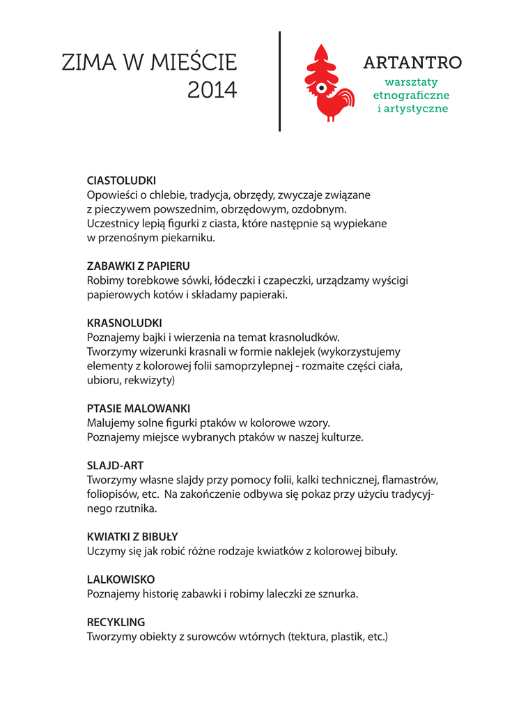 ZIMA W MIEŚCIE 2014 CIASTOLUDKI Opowieści o chlebie, tradycja, obrzędy, zwyczaje związane z pieczywem powszednim, obrzędowym, ozdobnym. Uczestnicy lepią figurki z ciasta, które następnie są wypiekane w przenośnym piekarniku. ZABAWKI Z PAPIERU Robimy torebkowe sówki, łódeczki i czapeczki, urządzamy wyścigi papierowych kotów i składamy papieraki. KRASNOLUDKI Poznajemy bajki i wierzenia na temat krasnoludków. Tworzymy wizerunki krasnali w formie naklejek (wykorzystujemy elementy z kolorowej folii samoprzylepnej - rozmaite części ciała, ubioru, rekwizyty) PTASIE MALOWANKI Malujemy solne figurki ptaków w kolorowe wzory. Poznajemy miejsce wybranych ptaków w naszej kulturze. SLAJD-ART Tworzymy własne slajdy przy pomocy folii, kalki technicznej, flamastrów, foliopisów, etc. Na zakończenie odbywa się pokaz przy użyciu tradycyjnego rzutnika. KWIATKI Z BIBUŁY Uczymy się jak robić różne rodzaje kwiatków z kolorowej bibuły. LALKOWISKO Poznajemy historię zabawki i robimy laleczki ze sznurka. RECYKLING Tworzymy obiekty z surowców wtórnych (tektura, plastik, etc.) ZIMA W MIEŚCIE 2014 ZABAWKI ODPUSTOWE Robimy piłeczki - zabawki charakterystyczne dla odpustowych kramów. Poznajemy tradycje odpustów. WYCINANKI Poznajemy różne rodzaje wycinanek oraz ich tradycję. Wykonujemy własne wycinanki. ZABAWKI OPTYCZNE Tworzymy zabawki, dzięki którym poznajemy tajemnice ruchomych obrazów. BIŻUTERIA Poznajemy ozdoby jakie noszono w dawnych czasach. Wykonujemy koraliki, bransoletki, breloczki, itp. koszt: 60 zł. za godzinę plus 4 zł. od osoby (materiały wliczone w cenę) Zajęcia odbywają się na terenie szkół, przedszkoli, ośrodków kultury oraz w galerii V9 (ul. Hoża 9, Warszawa) Zapraszamy na naszą stronę internetową: www.artantro.pl E-MAIL: [email protected] TELEFON: 501 671 453