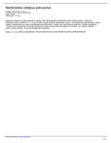 Nerkówka cielęca pieczona Dodano: 2009-07-28 11:19:14 Zmodyfikowano: 0000-00-00 00:00:00 Język: Polski Odwiedzono: 731 razy. Kawałek cielęciny od góry pieczeni z nerką, (tak zwana górka lub forszlak), jest bardzo kruchy i smaczny. Nerkówka waży zwykle od 1 ? -2 kg. Posolić ją pół godziny wcześniej, ułożyć na brytfannie, posmarować łyżką masła i wstawiwszy na ruszt do gorącego pieca polewać często, aby się ładnie zrumieniła. Zwykle wystarcza 1 ? godziny do upieczenia; za długo trzymana w piecu rozłazi się przy krajaniu. Pokrajać ją w równe kawałki wraz z nerką i podać z jarzyną, sałatą lub kompotem. NadesÅ‚aÅ‚(a): MARJA ŚLEŻAŃSKA "KUCHARZ POLSKI-1635 PRAKTYCZNYCH PRZEPISÓW" Wirtualna Kuchni@ Polska - http://kuchnia.now.pl przepis nr 8407, plik wygenerowano 2017.03.07 11:49 1z1