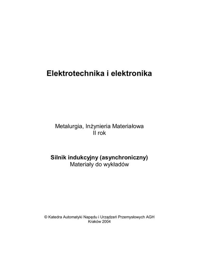 Elektrotechnika i elektronika Metalurgia, Inżynieria Materiałowa II rok Silnik indukcyjny (asynchroniczny) Materiały do wykładów © Katedra Automatyki Napędu i Urządzeń Przemysłowych AGH Kraków 2004 1. Wstęp Maszyny indukcyjne są maszynami prądu przemiennego. Następuje w nich przetwarzanie energii elektrycznej w energię mechaniczną (praca silnikowa maszyny) lub energii mechanicznej w elektryczną (praca generatorowa maszyny). Maszyny indukcyjne mają prostą budowę i w związku z tym charakteryzują się dużą niezawodnością, łatwością obsługi oraz małym kosztem. Z tych powodów są one szeroko stosowane w różnych dziedzinach techniki, najczęściej jako silniki, rzadziej jako prądnice. 2. Podstawy fizyczne działania silnika indukcyjnego. Podczas przepływu prądu elektrycznego przez przewodnik wytwarza si ę wokół niego pole magnetyczne. Kierunek linii sił tego pola wyznaczony może być zgodnie z regułą śruby prawoskrętnej, lub za pomocą prawej dłoni, której kciuk wskazuje kierunek przepływu prądu, zaś zagięte cztery pozostałe palce – kierunek linii pola magnetycznego. Sytuację tą przedstawia poniższy rysunek. Rys. 1 – Pole magnetyczne wokół przewodnika z prądem. Silnik indukcyjny – materiały do wykładów. 2 Schematycznie kierunek przepływu w przekroju przewodnika oznacza się krzyżykiem albo kropką. Rys. 2 – Schematyczne przedstawienie kierunku przepływu prądu w przewodniku. Jeżeli prąd będzie wpływał do przewodnika, od strony obserwatora, fakt ten b ędzie oznaczony krzyżykiem (na rysunku 1 – od strony ręki). Natomiast jeżeli będzie następował przepływ prądu w stronę obserwatora, to oznaczeniem będzie kropka. Załóżmy że do dwóch kawałków przewodnika tworzącego układ tak jak na rysunku 3a, przyłożone zostało napięcie U. W takim obwodzie popłynie zatem prąd I, wpływając do górnego przewodnika (punkt 1 – co umownie obrazuje krzy żyk) i wypływając (punkt 2, umowna kropka) z dolnego z powrotem do źródła napięcia U. Wokół obu przewodników – dolnego i górnego wytworzone zostanie pod wpływem przepływającego prądu pole magnetyczne. Kierunek linii sił tego pola, zgodny z przedstawioną wcześniej regułą, został zaznaczony czerwonymi strzałkami. W układzie takim wytworzone zostają zatem dwa bieguny magnetyczne (jedna para). a) b) I I 1 U N S 2 Rys. 3 – Pole magnetyczne w układzie dwóch równoległych przewodników z prądem. Na rysunku 3b pokazany został ten sam obwód w widoku z przodu. Widać iż pomiędzy przewodnikami, ze względu na zgodne kierunki linii sił pola wytworzone zostaną bieguny magnetyczne (S i N). Silnik indukcyjny – materiały do wykładów. 3 3. Budowa i zasada działania trójfazowego silnika indukcyjnego. Silnik indukcyjny (asynchroniczny) składa się z dwóch podstawowych części – nieruchomego stojana (inaczej zwanego statorem) i ruchomego wirnika (rotora). Działanie tego silnika oparte jest na zjawisku indukcji elektromagnetycznej. Pod wp ływem przyłożonego do uzwojeń stojana zmiennego napięcia i wywołanego tym przepływu prądu, wytworzone zostaje w stojanie wirujące pole magnetyczne. Dzięki temu w metalowym, przewodzącym wirniku indukuje się siła elektromotoryczna (napięcie) powodująca przepływ przez wirnik prądu, powstanie siły i ruch obrotowy wirnika. Szczegółowo zasada działania silnika asynchronicznego zostanie wyjaśniona w dalszej części instrukcji. Najpowszechniej w praktyce spotykaną odmianą tych silników są silniki trójfazowe. Od strony zasilania sieć trójfazową tworzą trzy źródła sinusoidalnego napięcia zasilającego, 2π przy czym przesunięcie fazowe między kolejnymi napięciami wynosi 120 0 ( ). 3 3.1 Stojan silnika indukcyjnego. Schematycznie budowę stojana w silniku trójfazowym można przestawić jako układ trzech przewodzących ramek, zwojów takich jak na rysunku 3. Początki tych ramek oznaczone są kolejno: U, V, V, zaś końce: X, Y i Z. Ramki te umieszczone są tworząc walec, tak jak na rysunku 5. Krawędzie podstaw tego walca zaznaczono fioletową przerywaną linią. Każda z tych ramek tworzy uzwojenie jednej fazy. Oczywi ście w praktyce nawinięte są one wielokrotnie drutem, lub – w przypadku większych mocy – taśmami lub nawet spawane z rur miedzianych. Jednak tu dla jasności opisu przestawione są one w uproszczeniu. Rys. 4 – Schematyczny układ uzwojeń stojana silnika asynchronicznego. Każdej parze przewodników, tworzących jedną ramkę odpowiada inny kolor. Ten układ przestrzenny widziany z przodu przedstawiony jest na rysunku 5. Jak wida ć, wszystkie zwoje są rozstawione na okręgu co 60 0. Silnik indukcyjny – materiały do wykładów. 4 U Y Z W V X Rys. 5. – Schematyczny przekrój stojana – układ uzwojeń stojana z rysunku 4 widziany z przodu. Do każdej z tych ramek dołączone zostaje jedno źródło napięcia sinusoidalnego, kolejno: UA, UB oraz UC, według odpowiednich oznaczeń końcówek, tak jak na rysunku 6. U V W UA UB UC Y Z X Rys. 6 – Symboliczne oznaczenia źródeł napięcia. Napięcie w każdym ze źródeł jest przesunięte względem poprzedniego o 120 o, tak jak na rysunku 7, tworząc układ trójfazowy. Rys. 7 – Przebieg napięć w układzie trójfazowym. Silnik indukcyjny – materiały do wykładów. 5 Podłączenie do tego układu wspomnianych napięć spowoduje przepływ prądu w każdym z przewodników i powstanie wewnątrz tego walca pola magnetycznego. Prześledźmy zwrot wypadkowego strumienia wewnątrz tego schematycznego stojana silnika dla chwili czasowe oznaczonej na rysunku 7 jako „1”. Widać, iż napięcie UA jest dodatnie, a zatem w przyłączonej do tego parze przewodników prąd będzie płynął następująco: wpłynie początkiem tego uzwojenia (końcówką U) i wypłynie końcówką X. A zatem na schematycznym przekroju kierunek prądu zostanie przedstawiony jako krzyżyk w punkcie „U” oraz 