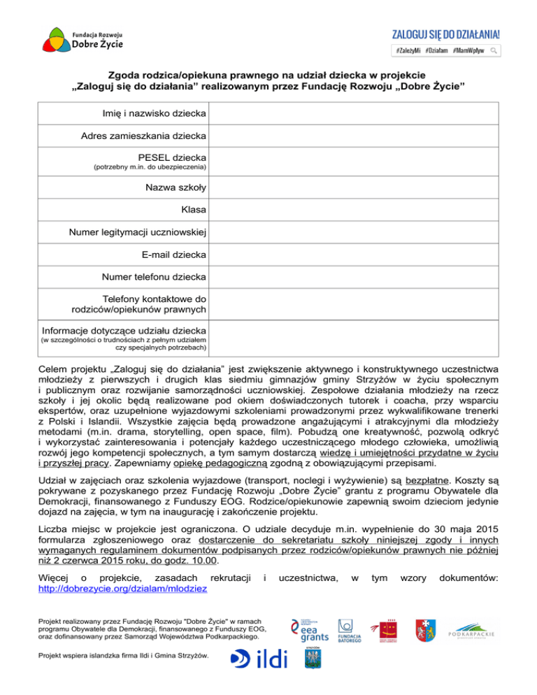 Zgoda rodzica/opiekuna prawnego na udział dziecka w projekcie „Zaloguj się do działania” realizowanym przez Fundację Rozwoju „Dobre Życie” Imię i nazwisko dziecka Adres zamieszkania dziecka PESEL dziecka (potrzebny m.in. do ubezpieczenia) Nazwa szkoły Klasa Numer legitymacji uczniowskiej E-mail dziecka Numer telefonu dziecka Telefony kontaktowe do rodziców/opiekunów prawnych Informacje dotyczące udziału dziecka (w szczególności o trudnościach z pełnym udziałem czy specjalnych potrzebach) Celem projektu „Zaloguj się do działania” jest zwiększenie aktywnego i konstruktywnego uczestnictwa młodzieży z pierwszych i drugich klas siedmiu gimnazjów gminy Strzyżów w życiu społecznym i publicznym oraz rozwijanie samorządności uczniowskiej. Zespołowe działania młodzieży na rzecz szkoły i jej okolic będą realizowane pod okiem doświadczonych tutorek i coacha, przy wsparciu ekspertów, oraz uzupełnione wyjazdowymi szkoleniami prowadzonymi przez wykwalifikowane trenerki z Polski i Islandii. Wszystkie zajęcia będą prowadzone angażującymi i atrakcyjnymi dla młodzieży metodami (m.in. drama, storytelling, open space, film). Pobudzą one kreatywność, pozwolą odkryć i wykorzystać zainteresowania i potencjały każdego uczestniczącego młodego człowieka, umożliwią rozwój jego kompetencji społecznych, a tym samym dostarczą wiedzę i umiejętności przydatne w życiu i przyszłej pracy. Zapewniamy opiekę pedagogiczną zgodną z obowiązującymi przepisami. Udział w zajęciach oraz szkolenia wyjazdowe (transport, noclegi i wyżywienie) są bezpłatne. Koszty są pokrywane z pozyskanego przez Fundację Rozwoju „Dobre Życie” grantu z programu Obywatele dla Demokracji, finansowanego z Funduszy EOG. Rodzice/opiekunowie zapewnią swoim dzieciom jedynie dojazd na zajęcia, w tym na inaugurację i zakończenie projektu. Liczba miejsc w projekcie jest ograniczona. O udziale decyduje m.in. wypełnienie do 30 maja 2015 formularza zgłoszeniowego oraz dostarczenie do sekretariatu szkoły niniejszej zgody i innych wymaganych regulaminem dokumentów podpisanych przez rodziców/opiekunów prawnych nie później niż 2 czerwca 2015 roku, do godz. 10.00. Więcej o projekcie, zasadach rekrutacji http://dobrezycie.org/dzialam/mlodziez i Projekt realizowany przez Fundację Rozwoju "Dobre Życie" w ramach programu Obywatele dla Demokracji, finansowanego z Funduszy EOG, oraz dofinansowany przez Samorząd Województwa Podkarpackiego. Projekt wspiera islandzka firma Ildi i Gmina Strzyżów. uczestnictwa, w tym wzory dokumentów: W ramach projektu „Zaloguj się do działania” odbędą się niżej wymienione aktywności – wszystkie obowiązkowe* dla osób zakwalifikowanych do pełnego udziału: 1. Inauguracja projektu: 9 czerwca 2015 r., w godz. 13.00-15.00, w Strzyżowie. 2. Wyjazdowy trening obywatelski: 21-24 sierpnia 2015 (szkoły z miejscowości: Dobrzechów, Godowa, Żarnowa, Żyznów) i 26-29 sierpnia 2015 (szkoły z miejscowości: Grodzisko, Strzyżów, Wysoka Strzyżowska), w Domaniewicach pod Wolbromiem, prowadzony w języku polskim i angielskim (z tłumaczem) – zapewniamy transport autokarowy spod szkoły, noclegi, wyżywienie i opiekę pedagogiczną (zgodnie z wymogami MEN), szkolenie (prowadzone przez trenerki z Polski i Islandii) oraz indywidualne sesje coachingowe. 3. Wyjazdowe szkolenie z metody projektowej: 23-25 października 2015, w Czudcu – zapewniamy transport autokarowy spod szkoły, noclegi, wyżywienie i opiekę pedagogiczną (zgodnie z wymogami MEN), szkolenie (prowadzone przez trenerki z Polski) oraz indywidualne sesje coachingowe. 4. Pozalekcyjne spotkania w zespole młodzieżowym z tutorką ze strony Fundacji Rozwoju „Dobre Życie” (nie mniej niż 20 godzin w okresie od września 2015 do lutego 2016). Zespoły młodzieżowe będą tworzyć własne inicjatywy na rzecz szkoły lub miejscowości, w której znajduje się szkoła. Zapewniamy wsparcie ekspertów, wydruki, zakup materiałów uzgodnionych przez zespół z tutorką. Młodzież wykona również indywidualne i zespołowe zadania pomiędzy spotkaniami. 5. Konferencja zamykająca: luty/marzec 2016, w Strzyżowie. Kontakt do kierownika projektu: Aleksandra Chodasz, 609-08-13-13, [email protected] * Ze względu na założenia projektu, który zawiera kilka aktywności składających się na proces edukacyjny, osoby zakwalifikowane nie mogą wybierać jego poszczególnych części. Więcej informacji znajduje się w regulaminie rekrutacji i uczestnictwa w projekcie na stronie http://dobrezycie.org/dzialam/mlodziez ___________________________________________________________________________________ Potwierdzam, iż przeczytałam/-em powyższe informacje o projekcie, zapoznałam/em się z regulaminem rekrutacji i uczetnictwa, potwierdzam poprawność wyżej wpisanych danych i wyrażam zgodę na: • udział mojego dziecka w projekcie „Zaloguj się do działania”, realizowanym przez Fundację Rozwoju „Dobre Życie” w okresie czerwiec 2015 roku – marzec 2016 roku. • wykorzystanie zdjęć oraz nagrań video i audio zrobionych podczas projektu na stronie internetowej i funpagu Fundacji na Facebooku oraz w materiałach promujących statutową działalność Fundacji oraz partnerów projektu, grantodawców i operatorów grantu. • przetwarzanie moich i i mojego dziecka danych osobowych zawartych w niniejszym formularzu na potrzeby organizacji i prowadzenia zajęć i działalności statutowej Fundacji, zgodnie z ustawą z dnia 29.08.1997 r. o ochronie danych osobowych (Dz.U. z 1997 nr 133, poz. 883). ____________________________________ ____________________________________ (czytelny podpis uczestniczki/uczestnika) (czytelny podpis rodzica/opiekuna prawnego) ________________________________ (miejscowość i data)