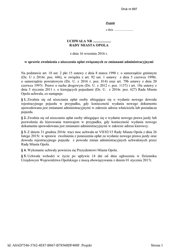 Druk nr 697 Projekt z dnia ......................... UCHWAŁA NR .................... RADY MIASTA OPOLA z dnia 16 września 2016 r. w sprawie zwolnienia z uiszczenia opłat związanych ze zmianami administracyjnymi Na podstawie art. 18 ust. 2 pkt 15 ustawy z dnia 8 marca 1990 r. o samorządzie gminnym (Dz. U z 2016r. poz. 446), w związku z art. 92 ust. 1 ustawy z dnia 5 czerwca 1998r. o samorządzie powiatowym (Dz. U. z 2016 r. poz. 814) oraz art. 79b ustawy z dnia 20 czerwca 1997r. Prawo o ruchu drogowym (Dz. U. z 2012 r. poz. 1137) i art. 18a ustawy z dnia 5 stycznia 2011 r. o kierujących pojazdami (Dz. U. z 2016r. poz. 627) Rada Miasta Opola uchwala, co następuje: § 1. Zwalnia się od uiszczania opłat osoby ubiegające się o wydanie nowego dowodu rejestracyjnego pojazdu w przypadku, gdy konieczność wydania nowego dokumentu spowodowana jest zmianami administracyjnymi w zakresie adresu właściciela lub posiadacza pojazdu. § 2. Zwalnia się od uiszczania opłat osoby ubiegające się o wydanie nowego prawa jazdy lub pozwolenia do kierowania tramwajem w przypadku, gdy konieczność wydania nowego dokumentu spowodowana jest zmianami administracyjnymi w zakresie adresu kierowcy. § 3. Z dniem 31 grudnia 2016r. traci moc uchwała nr VII/82/15 Rady Miasta Opola z dnia 26 lutego 2015r. w sprawie zwolnienia z ponoszenia opłat za wydanie nowego prawa jazdy oraz dowodu rejestracyjnego pojazdu z powodu zmian administracyjnych uchwalonych przez Radę Miasta Opola. § 4. Wykonanie uchwały powierza się Prezydentowi Miasta Opola. § 5. Uchwała wchodzi w życie po upływie 14 dni od dnia ogłoszenia w Dzienniku Urzędowym Województwa Opolskiego z mocą obowiązywania z dniem 01 stycznia 2017r. Id: A0AD7546-3762-4E87-B867-B78560DF400F. Projekt Strona 1 UZASADNIENIE Na podstawie art. 79b. ustawy z dnia 20 czerwca 1997r. Prawo o ruchu drogowym (Dz. U. z 2012 r. poz. 1137) i art. 18a. ustawy z dnia 5 stycznia 2011 r. o kierujących pojazdami (Dz. U. z 2016r. poz. 627) rada powiatu może, w drodze uchwały, zmniejszyć opłatę lub zwolnić od jej uiszczenia osoby obowiązane do ubiegania się o wydanie nowych dokumentów, w przypadku gdy zmiana stanu faktycznego w zakresie adresu właściciela lub posiadacza pojazdu, wymagająca wydania nowych dokumentów spowodowana została zmianami administracyjnymi. Podjęcie przedmiotowej uchwały jest uzasadnione ze względu na konieczność ustanowienia prawa miejscowego dla obszarów włączonych do dotychczasowego miasta Opola na podstawie Rozporządzenia Rady Ministrów z dnia 19 lipca 2016r. w sprawie ustalenia granic niektórych gmin i miast, nadania niektórym miejscowościom statusu miasta oraz zmiany nazwy gminy (Dz. U. 2016 poz. 1134). Uchwała wywołuje skutki finansowe. W związku z tym, iż wymiana dokumentów będzie przebiegała sukcesywnie, skutki finansowe będą rozkładać się na kilka lat (ok.6) i w sumie mogą wynieść ok. 900 tysięcy złotych. W świetle powyżej przytoczonych argumentów przyjęcie uchwały w proponowanym kształcie jest uzasadnione. Zakres zwolnień nie obejmuje opłaty ewidencyjnej. Opłata ewidencyjna jest pobierana od każdego wydanego dokumentu w wysokości 0,50 zł. i co miesiąc jest przekazywana na rachunek bankowy Funduszu - Centralna Ewidencja Pojazdów i Kierowców. Id: A0AD7546-3762-4E87-B867-B78560DF400F. Projekt Strona 1