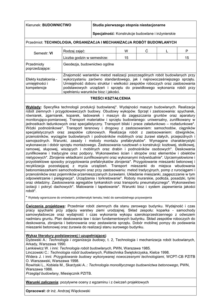 Kierunek: BUDOWNICTWO Studia pierwszego stopnia niestacjonarne Specjalność: Konstrukcje budowlane i inŜynierskie Przedmiot: TECHNOLOGIA, ORGANIZACJA I MECHANIZACJA ROBÓT BUDOWLANYCH Semestr: VI Przedmioty poprzedzające: Efekty kształcenia umiejętności i kompetencje Rodzaj zajęć: W Liczba godzin w semestrze: 15 Ć L P 15 Geodezja, budownictwo ogólne Znajomość wariantów metod realizacji poszczególnych robót budowlanych przy wykorzystaniu zarówno standardowego, jak i najnowocześniejszego sprzętu. Umiejętność doboru struktur i wielkości zespołów roboczych oraz zastosowania podstawowych urządzeń i sprzętu do prawidłowego wykonania robót przy spełnieniu warunków bioz i jakości. TREŚCI KSZTAŁCENIA Wykłady: Specyfika technologii produkcji budowlanej*. Wydajności maszyn budowlanych. Realizacja robót ziemnych i przygotowawczych budowy. Obudowy wykopów. Sprzęt i zastosowania: spycharek, równiarek, zgarniarek, koparek, ładowarek i maszyn do zagęszczania gruntów oraz aparatury monitorująco-pomiarowej. Transport materiałów i sprzętu budowlanego: uniwersalny, zunifikowany w jednostkach ładunkowych oraz specjalistyczny. Transport bliski i prace załadunkowo – rozładunkowe*. Wózki podnośnikowe*. Transport terenowy i drogowy z zastosowaniem: samochodów, ciągników specjalistycznych oraz zespołów członowych. Realizacja robót z zastosowaniem: dźwigników, przenośników, wyciągów budowlanych i podnośników mobilnych oraz Ŝurawi stałych, przejezdnych i samojezdnych. Warunki, zasady i metody montaŜu prefabrykatów*. Wymagane charakterystyki wykonawcze i dobór sprzętu montaŜowego. Zastosowania rusztowań o konstrukcji: kozłowej, stolikowej, ramowej, słupowej, wiszących i mobilnych oraz drabin i podnośników osobowych*. Deskowania zunifikowane i tradycyjne oraz podpory. Wykonawstwo ścian i stropów oraz elementów i obiektów nietypowych*. Zbrojenie wkładkami zunifikowanymi oraz wykonanymi indywidualnie*. Uprzemysłowione i przyobiektowe sposoby przygotowania prefabrykatów zbrojenia*. Przygotowanie mieszanki betonowej i recyklizacja pozostającej z mycia urządzeń. Transport mieszanki do miejsca wbudowania betonomieszarkami samochodowymi oraz przy zastosowaniu: metod tradycyjnych, pomp z rurociągami i przenośników oraz pojemników przemieszczanych Ŝurawiami. Układanie mieszanki, zagęszczanie w tym odpowietrzanie i pielęgnacja*. Urządzenia i torkretowanie*. Roboty murarskie, podłoŜa, posadzki, tynki oraz okładziny. Zastosowania agregatów tynkarskich oraz transportu pneumatycznego*. Wykonawstwo izolacji i pokryć dachowych*. Malowanie i tapetowanie*. Warunki bioz i system zapewnienia jakości robót*. * Wykłady ograniczone do omówienia problematyki tematu; treść do samodzielnego przyswojenia Ćwiczenia projektowe: Przedmiar robót ziemnych dla stanu zerowego budynku. Wydajność i czas pracy spycharki przy zdjęciu warstwy ziemi urodzajnej. Skład zespołu: koparka - samochody samowyładowcze oraz wydajność i czas wykonania wykopu szerokoprzestrzennego z odwozem nadmiaru gruntu. Plan deskowania ław i ścian fundamentowych budynku. Skład zespołów roboczych do deskowania, zbrojenia i betonowania oraz zestawienie sprzętu. Dobór mobilnej pompy do podawania mieszanki betonowej oraz Ŝurawia do realizacji stanu surowego budynku. Wykaz literatury podstawowej i uzupełniającej: DyŜewski A.: Technologia i organizacja budowy, t. 2, Technologia i mechanizacja robót budowlanych, Arkady, Warszawa 1990. Lenkiewicz W. i inni: Technologia robót budowlanych, PWN, Warszawa 1985. Linczowski C.: Technologia robót budowlanych, Politechnika Świętokrzyska, Kielce 1998. Widera J. i inni: Przygotowanie budowy wykonywanej nowoczesnymi technologiami, WCPT-CB PZITB O. Warszawski, Warszawa 1998. Rowiński L., Kobiela M., SkarŜyski A..: Technologia monolitycznego budownictwa betonowego, PWN, Warszawa 1986. Przegląd budowlany, Miesięcznik PZITB. Warunki zaliczenia: pozytywne oceny z egzaminu i z ćwiczeń projektowych Opracował: dr inŜ. Andrzej Więckowski