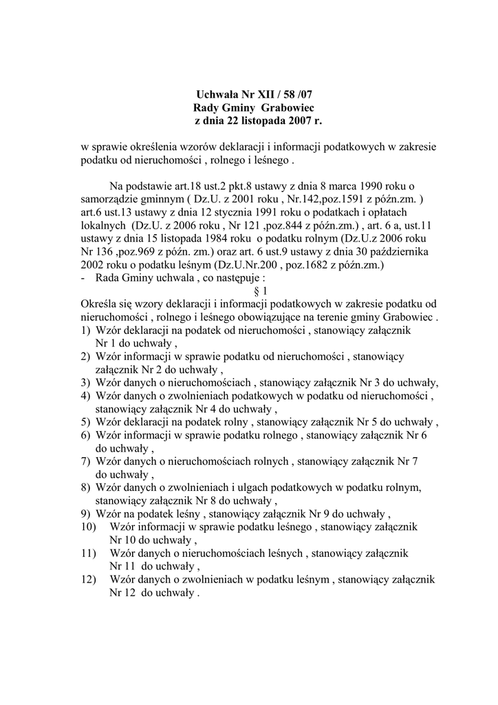 Uchwała Nr XII / 58 /07 Rady Gminy Grabowiec z dnia 22 listopada 2007 r. w sprawie określenia wzorów deklaracji i informacji podatkowych w zakresie podatku od nieruchomości , rolnego i leśnego . Na podstawie art.18 ust.2 pkt.8 ustawy z dnia 8 marca 1990 roku o samorządzie gminnym ( Dz.U. z 2001 roku , Nr.142,poz.1591 z późn.zm. ) art.6 ust.13 ustawy z dnia 12 stycznia 1991 roku o podatkach i opłatach lokalnych (Dz.U. z 2006 roku , Nr 121 ,poz.844 z późn.zm.) , art. 6 a, ust.11 ustawy z dnia 15 listopada 1984 roku o podatku rolnym (Dz.U.z 2006 roku Nr 136 ,poz.969 z późn. zm.) oraz art. 6 ust.9 ustawy z dnia 30 października 2002 roku o podatku leśnym (Dz.U.Nr.200 , poz.1682 z późn.zm.) - Rada Gminy uchwala , co następuje : §1 Określa się wzory deklaracji i informacji podatkowych w zakresie podatku od nieruchomości , rolnego i leśnego obowiązujące na terenie gminy Grabowiec . 1) Wzór deklaracji na podatek od nieruchomości , stanowiący załącznik Nr 1 do uchwały , 2) Wzór informacji w sprawie podatku od nieruchomości , stanowiący załącznik Nr 2 do uchwały , 3) Wzór danych o nieruchomościach , stanowiący załącznik Nr 3 do uchwały, 4) Wzór danych o zwolnieniach podatkowych w podatku od nieruchomości , stanowiący załącznik Nr 4 do uchwały , 5) Wzór deklaracji na podatek rolny , stanowiący załącznik Nr 5 do uchwały , 6) Wzór informacji w sprawie podatku rolnego , stanowiący załącznik Nr 6 do uchwały , 7) Wzór danych o nieruchomościach rolnych , stanowiący załącznik Nr 7 do uchwały , 8) Wzór danych o zwolnieniach i ulgach podatkowych w podatku rolnym, stanowiący załącznik Nr 8 do uchwały , 9) Wzór na podatek leśny , stanowiący załącznik Nr 9 do uchwały , 10) Wzór informacji w sprawie podatku leśnego , stanowiący załącznik Nr 10 do uchwały , 11) Wzór danych o nieruchomościach leśnych , stanowiący załącznik Nr 11 do uchwały , 12) Wzór danych o zwolnieniach w podatku leśnym , stanowiący załącznik Nr 12 do uchwały . §2 Tracą moc uchwały : 1) Uchwała Nr II/13/02 Rady Gminy Grabowiec z dnia 17 grudnia 2002 roku w sprawie określenia wzorów formularzy niezbędnych do wymiaru i poboru podatku rolnego (Dz.Urz.W.L.Nr 8 poz.540 z dn.24.01.03 ) 2) Uchwała Nr II/14/02 Rady Gminy Grabowiec z dnia 17 grudnia 2002 roku w sprawie określenia wzorów formularzy niezbędnych do wymiaru i poboru podatku leśnego ( Dz.Urz.W.L.Nr.8 poz. 541 z dn. 24.01.03 r.) . 3) Uchwała Nr II/15/02 Rady Gminy Grabowiec z dnia 17 grudnia 2002 roku w sprawie określenia wzorów formularzy niezbędnych do wymiaru i poboru podatku od nieruchomości (Dz.Urz.W.L.Nr8 poz.542 z dn.24.01.03 ) §3 Wykonanie uchwały powierza się Wójtowi Gminy . §4 Uchwała podlega ogłoszeniu w Dzienniku Urzędowym Województwa Lubelskiego . § 5 Uchwała wchodzi w Ŝycie po upływie 14 dni od dnia ogłoszenia i ma zastosowanie do podatków naleŜnych od 2008 roku . Przewodniczący Rady Gminy Jadwiga Pijajko