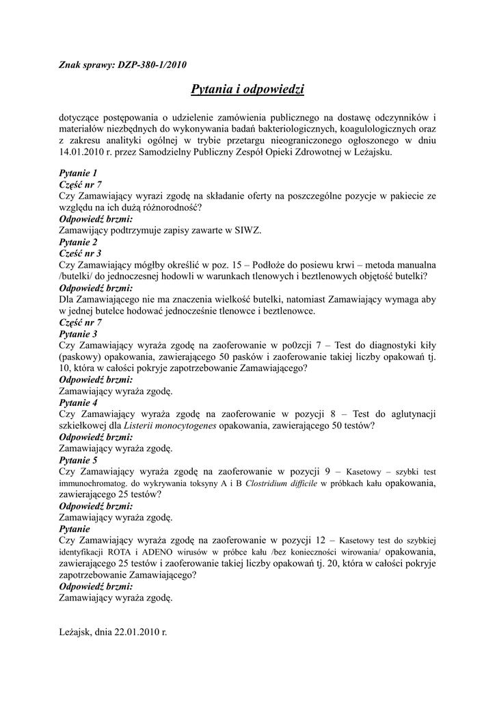 Znak sprawy: DZP-380-1/2010 Pytania i odpowiedzi dotyczące postępowania o udzielenie zamówienia publicznego na dostawę odczynników i materiałów niezbędnych do wykonywania badań bakteriologicznych, koagulologicznych oraz z zakresu analityki ogólnej w trybie przetargu nieograniczonego ogłoszonego w dniu 14.01.2010 r. przez Samodzielny Publiczny Zespół Opieki Zdrowotnej w LeŜajsku. Pytanie 1 Część nr 7 Czy Zamawiający wyrazi zgodę na składanie oferty na poszczególne pozycje w pakiecie ze względu na ich duŜą róŜnorodność? Odpowiedź brzmi: Zamawijący podtrzymuje zapisy zawarte w SIWZ. Pytanie 2 Cześć nr 3 Czy Zamawiający mógłby określić w poz. 15 – PodłoŜe do posiewu krwi – metoda manualna /butelki/ do jednoczesnej hodowli w warunkach tlenowych i beztlenowych objętość butelki? Odpowiedź brzmi: Dla Zamawiającego nie ma znaczenia wielkość butelki, natomiast Zamawiający wymaga aby w jednej butelce hodować jednocześnie tlenowce i beztlenowce. Część nr 7 Pytanie 3 Czy Zamawiający wyraŜa zgodę na zaoferowanie w po0zcji 7 – Test do diagnostyki kiły (paskowy) opakowania, zawierającego 50 pasków i zaoferowanie takiej liczby opakowań tj. 10, która w całości pokryje zapotrzebowanie Zamawiającego? Odpowiedź brzmi: Zamawiający wyraŜa zgodę. Pytanie 4 Czy Zamawiający wyraŜa zgodę na zaoferowanie w pozycji 8 – Test do aglutynacji szkiełkowej dla Listerii monocytogenes opakowania, zawierającego 50 testów? Odpowiedź brzmi: Zamawiający wyraŜa zgodę. Pytanie 5 Czy Zamawiający wyraŜa zgodę na zaoferowanie w pozycji 9 – Kasetowy – szybki test immunochromatog. do wykrywania toksyny A i B Clostridium difficile w próbkach kału opakowania, zawierającego 25 testów? Odpowiedź brzmi: Zamawiający wyraŜa zgodę. Pytanie Czy Zamawiający wyraŜa zgodę na zaoferowanie w pozycji 12 – Kasetowy test do szybkiej identyfikacji ROTA i ADENO wirusów w próbce kału /bez konieczności wirowania/ opakowania, zawierającego 25 testów i zaoferowanie takiej liczby opakowań tj. 20, która w całości pokryje zapotrzebowanie Zamawiającego? Odpowiedź brzmi: Zamawiający wyraŜa zgodę. LeŜajsk, dnia 22.01.2010 r.