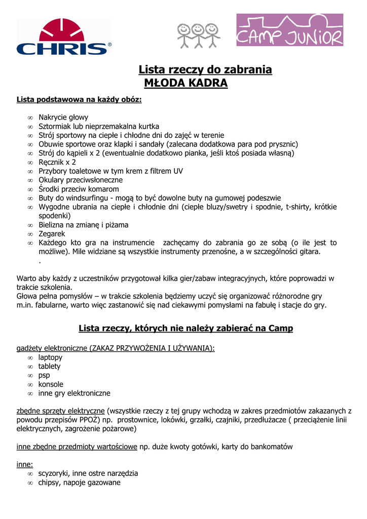 Lista rzeczy do zabrania MŁODA KADRA Lista podstawowa na każdy obóz: • • • • • • • • • • • • • • Nakrycie głowy Sztormiak lub nieprzemakalna kurtka Strój sportowy na ciepłe i chłodne dni do zajęć w terenie Obuwie sportowe oraz klapki i sandały (zalecana dodatkowa para pod prysznic) Strój do kąpieli x 2 (ewentualnie dodatkowo pianka, jeśli ktoś posiada własną) Ręcznik x 2 Przybory toaletowe w tym krem z filtrem UV Okulary przeciwsłoneczne Środki przeciw komarom Buty do windsurfingu - mogą to być dowolne buty na gumowej podeszwie Wygodne ubrania na ciepłe i chłodnie dni (ciepłe bluzy/swetry i spodnie, t-shirty, krótkie spodenki) Bielizna na zmianę i piżama Zegarek Każdego kto gra na instrumencie zachęcamy do zabrania go ze sobą (o ile jest to możliwe). Mile widziane są wszystkie instrumenty przenośne, a w szczególności gitara. . Warto aby każdy z uczestników przygotował kilka gier/zabaw integracyjnych, które poprowadzi w trakcie szkolenia. Głowa pełna pomysłów – w trakcie szkolenia będziemy uczyć się organizować różnorodne gry m.in. fabularne, warto więc zastanowić się nad ciekawymi pomysłami na fabułę i stacje do gry. Lista rzeczy, których nie należy zabierać na Camp gadżety elektroniczne (ZAKAZ PRZYWOŻENIA I UŻYWANIA): • laptopy • tablety • psp • konsole • inne gry elektroniczne zbędne sprzęty elektryczne (wszystkie rzeczy z tej grupy wchodzą w zakres przedmiotów zakazanych z powodu przepisów PPOŻ) np. prostownice, lokówki, grzałki, czajniki, przedłużacze ( przeciążenie linii elektrycznych, zagrożenie pożarowe) inne zbędne przedmioty wartościowe np. duże kwoty gotówki, karty do bankomatów inne: • scyzoryki, inne ostre narzędzia • chipsy, napoje gazowane Przypominamy o wprowadzonym ograniczeniu w korzystaniu z telefonów komórkowych przez dzieci i młodzież na terenie Campu Junior. Z telefonów komórkowych uczestnicy będą mogli korzystać w każdą środę i sobotę w trakcie przerwy obiadowej. Poza tym czasem telefony będą zdeponowane w campowym sejfie. Z racji ograniczonego miejsca w lukach bagażowy bardzo prosimy o zabieranie bagażu o wadze około 20 kg i walizek o maksymalnych wymiarach 45x25x65. Adres: Ośrodek Wypoczynkowy Kruklanki, ul. Wczasowa 54, 11 -612 Kruklanki telefon: (87) 429 11 83 Kontakt z dzieckiem: telefoniczny - najlepiej w porze posiłków. Godziny podane będą na stronie internetowej www.chris.com.pl w pierwszy poniedziałek po rozpoczęciu turnusu. Zakwaterowanie: prosimy o podanie nazwisk dzieci do wspólnego zakwaterowania na karcie kwalifikacyjnej lub poprzez kontakt mailowy lub telefoniczny z BOK, nie później niż na dwa tygodnie przed rozpoczęciem obozu. Przy realizacji zakwaterowania bierzemy pod uwagę datę przyjęcia zgłoszenia. Informujemy również, że w miarę możliwości staramy się zrealizować w tym zakresie wszystkie Państwa prośby.