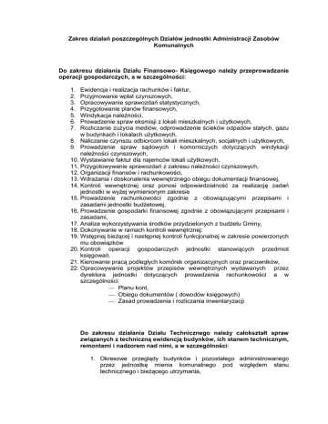 Zakres działań poszczególnych Działów jednostki Administracji Zasobów Komunalnych Do zakresu działania Działu Finansowo- Księgowego należy przeprowadzanie operacji gospodarczych, a w szczególności: Ewidencja i realizacja rachunków i faktur, Przyjmowanie wpłat czynszowych, Opracowywanie sprawozdań statystycznych, Przygotowanie planów finansowych, Windykacja należności, Prowadzenie spraw eksmisji z lokali mieszkalnych i użytkowych, Rozliczanie zużycia mediów, odprowadzenie ścieków odpadów stałych, gazu w budynkach i lokalach użytkowych, 8. Naliczanie czynszu odbiorcom lokali mieszkalnych, socjalnych i użytkowych, 9. Prowadzenie spraw sądowych i komorniczych dotyczących windykacji należności czynszowych, 10. Wystawianie faktur dla najemców lokali użytkowych, 11. Przygotowywanie sprawozdań z zakresu należności czynszowych, 12. Organizacji finansów i rachunkowości, 13. Wdrażania i doskonalenia wewnętrznego obiegu dokumentacji finansowej, 14. Kontroli wewnętrznej oraz ponosi odpowiedzialność za realizację zadań jednostki w wyżej wymienionym zakresie 15. Prowadzenie rachunkowości zgodnie z obowiązującymi przepisami i zasadami jednostki budżetowej, 16. Prowadzenie gospodarki finansowej zgodnie z obowiązującymi przepisami i zasadami, 17. Analiza wykorzystywania środków przydzielonych z budżetu Gminy, 18. Dokonywanie w ramach kontroli wewnętrznej: 19. Wstępnej bieżącej i następnej kontroli funkcjonalnej w zakresie powierzonych mu obowiązków 20. Kontroli operacji gospodarczych jednostki stanowiących przedmiot księgowań. 21. Kierowanie pracą podległych komórek organizacyjnych oraz pracowników, 22. Opracowywanie projektów przepisów wewnętrznych wydawanych przez dyrektora jednostki dotyczących prowadzenia rachunkowości a w szczególności: Planu kont, Obiegu dokumentów ( dowodów księgowych) Zasad prowadzenia i rozliczania inwentaryzacji 1. 2. 3. 4. 5. 6. 7. Do zakresu działania Działu Technicznego należy całokształt spraw związanych z techniczną ewidencją budynków, ich stanem technicznym, remontami i nadzorem nad nimi, a w szczególności: 1. Okresowe przeglądy budynków i pozostałego administrowanego przez jednostkę mienia komunalnego pod względem stanu technicznego i bieżącego utrzymania, 2. Przyjmowanie i wyjaśnianie interwencji użytkowników w zakresie stanu technicznego i bieżącego utrzymania budynków, lokali i urządzeń, 3. Kwalifikowanie obiektów do remontu, 4. Kwalifikowanie remontów bieżących, średnich i kapitalnych, 5. Nadzór nad prowadzonymi remontami, 6. Sprawdzanie kosztorysów, 7. Kwalifikowanie poszczególnych robót dla celów dowartościowania budynków, 8. Typowanie budynków do przeprowadzenia konserwacji i nadzór nad tymi robotami, 9. Prowadzenie książek obiektów, 10. Kosztorysowanie, Do zakresu działania działu Administracji należy całokształt gospodarki lokalami mieszkalnymi i użytkowymi, a w szczególności: 1. Przygotowanie założeń polityki mieszkaniowej Gminy w tym zasad najmu lokali, 2. Opracowywanie programów gospodarowania zasobem lokalowym Gminy, 3. Prowadzenie ewidencji lokali mieszkalnych, socjalnych i użytkowych, 4. Przygotowywanie umów najmu i zamian lokali mieszkalnych, 5. Obsługa najemców- użytkowników lokali, 6. Prowadzenie dokumentacji dotyczącej spraw lokalowych, 7. Organizowanie przetargów na lokale użytkowe 8. Nadzór i kontrola utrzymania porządku i czystości na administrowanych mieszkaniach, 9. Bieżące i roczne rozliczanie wywozu odpadów z nieruchomości i zużycia mediów w lokalach użytkowych. Do zakresu działania samodzielnego stanowiska ds. zamówień publicznych i inwestycji należy: 1. Przygotowanie i przeprowadzanie postępowań o udzielenie zamówienia publicznego, 2. Sporządzanie umów na roboty budowlano-montażowe, usługi i dostawy z zachowaniem przepisów ustawy o zamówieniach publicznych. Do zakresu działania samodzielnego stanowiska ds. składowania odpadów należy: 1. Sprawowanie bieżącego nadzoru oraz kontroli nad prawidłowym funkcjonowaniem składowiska, 2. Monitorowanie danych o rodzajach i ilości odpadów oraz sposobu gospodarowania nimi na składowisku, 3. Koordynacja prac związanych z rekultywacją składowiska odpadów, 4. Nadzór nad bieżącym funkcjonowaniem wind i podnośników platformowych dla osób niepełnosprawnych. Do zakresu działania samodzielnego stanowiska ds. programu ograniczenia niskiej emisji i budownictwa mieszkaniowego należy: 1. Koordynowanie programu ograniczenia niskiej jednorodzinnych w Gminie Czechowice-Dziedzice, emisji w budynkach 2. Współpraca z Wojewódzkim Funduszem Ochrony Środowiska i Gospodarki Wodnej w sprawach pożyczek i dotacji na realizację PONE, 3. Opracowywanie projektów programów budownictwa lokali mieszkalnych i socjalnych, 4. Bieżąca obsługa cmentarza komunalnego, 5. Prowadzenie obsługi magazynów jednostki, Do zakresu działania samodzielnego stanowiska ds. bhp i ppoż. należy: 1. Wypełnianie funkcji służby bhp jednostki i w zakresie administrowanego zasobu, 2. Wypełnianie funkcji inspektora ochrony ppoż. dla jednostki i w zakresie administrowanego zasobu. Do zakresu działania samodzielnego stanowiska ds. obsługi sekretariatu należy obsługa sekretarska jednostki, ewidencja korespondencji, przyjmowanie skarg a w szczególności : 1. Obsługa sekretariatu, 2. Przyjmowanie interesantów i rozmów telefonicznych, 3. Nadzór nad funkcjonowaniem biuletynu informacji publicznej i strony internetowej jednostki, 4. Prowadzenie ewidencji korespondencji przychodzącej i wychodzącej, 5. Nadawanie i pobieranie korespondencji, 6. Załatwianie skarg i wniosków. Do zakresu działania samodzielnego stanowiska ds. osobowych należy prowadzenie spraw pracowniczych w tym: 1. 2. 3. 4. 5. 6. 7. 8. Sporządzanie umów o pracę, Prowadzenie ewidencji zatrudnionych pracowników, Aktualizowanie dokumentacji zatrudnionych pracowników, Kontrola dyscypliny p