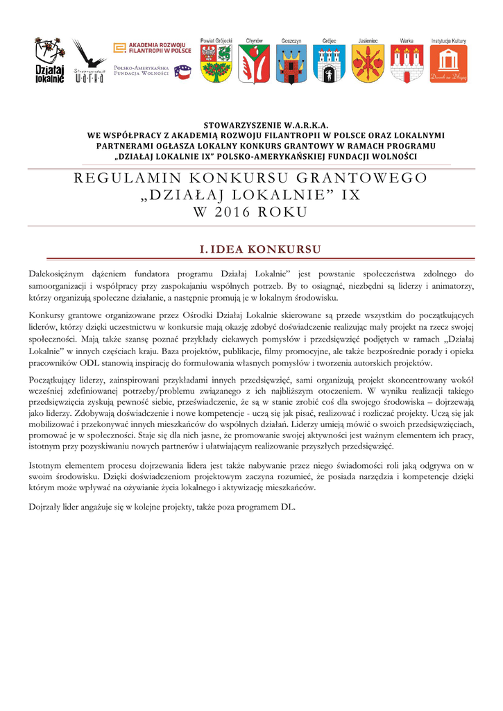 STOWARZYSZENIE W.A.R.K.A. WE WSPÓŁPRACY Z AKADEMIĄ ROZWOJU FILANTROPII W POLSCE ORAZ LOKALNYMI PARTNERAMI OGŁASZA LOKALNY KONKURS GRANTOWY W RAMACH PROGRAMU 1. „DZIAŁAJ LOKALNIE IX” POLSKO-AMERYKAŃSKIEJ FUNDACJI WOLNOŚCI REGULAMIN KONKURSU GRANTOWEGO „DZIAŁAJ LOKALNIE” IX W 2016 ROKU I. IDEA KONKURSU Dalekosiężnym dążeniem fundatora programu Działaj Lokalnie” jest powstanie społeczeństwa zdolnego do samoorganizacji i współpracy przy zaspokajaniu wspólnych potrzeb. By to osiągnąć, niezbędni są liderzy i animatorzy, którzy organizują społeczne działanie, a następnie promują je w lokalnym środowisku. Konkursy grantowe organizowane przez Ośrodki Działaj Lokalnie skierowane są przede wszystkim do początkujących liderów, którzy dzięki uczestnictwu w konkursie mają okazję zdobyć doświadczenie realizując mały projekt na rzecz swojej społeczności. Mają także szansę poznać przykłady ciekawych pomysłów i przedsięwzięć podjętych w ramach „Działaj Lokalnie” w innych częściach kraju. Baza projektów, publikacje, filmy promocyjne, ale także bezpośrednie porady i opieka pracowników ODL stanowią inspirację do formułowania własnych pomysłów i tworzenia autorskich projektów. Początkujący liderzy, zainspirowani przykładami innych przedsięwzięć, sami organizują projekt skoncentrowany wokół wcześniej zdefiniowanej potrzeby/problemu związanego z ich najbliższym otoczeniem. W wyniku realizacji takiego przedsięwzięcia zyskują pewność siebie, przeświadczenie, że są w stanie zrobić coś dla swojego środowiska – dojrzewają jako liderzy. Zdobywają doświadczenie i nowe kompetencje - uczą się jak pisać, realizować i rozliczać projekty. Uczą się jak mobilizować i przekonywać innych mieszkańców do wspólnych działań. Liderzy umieją mówić o swoich przedsięwzięciach, promować je w społeczności. Staje się dla nich jasne, że promowanie swojej aktywności jest ważnym elementem ich pracy, istotnym przy pozyskiwaniu nowych partnerów i ułatwiającym realizowanie przyszłych przedsięwzięć. Istotnym elementem procesu dojrzewania lidera jest także nabywanie przez niego świadomości roli jaką odgrywa on w swoim środowisku. Dzięki doświadczeniom projektowym zaczyna rozumieć, że posiada narzędzia i kompetencje dzięki którym może wpływać na ożywianie życia lokalnego i aktywizację mieszkańców. Dojrzały lider angażuje się w kolejne projekty, także poza programem DL. II.Założenia ORAZ cel konkursu W IX edycji Programu „Działaj Lokalnie” wspierane będą projekty, które inicjują współpracę mieszkańców na rzecz dobra wspólnego i które służą pobudzaniu aspiracji rozwojowych, poprawie jakości życia. W rezultacie podejmowane działania mają przyczyniać się do budowania lokalnego kapitału społecznego. Program jest prowadzony z myślą o organizacjach pozarządowych oraz grupach nieformalnych, które podejmują wspólny wysiłek, aby w ich społecznościach żyło się lepiej. W ramach konkursu przewidywane jest przyznanie dotacji na 3-6 miesięczne projekty, które: o zakładają współdziałanie mieszkańców, dzięki któremu możliwe jest osiąganie celów o charakterze dobra wspólnego, o wynikają z konkretnych potrzeb danej społeczności, o mają jasno określony cel, dobrze zaplanowane działania, mierzalne rezultaty i rozsądne koszty realizacji, o przewidują takie działania, które będą kierowane do określonej grupy odbiorców, a jednocześnie będą służyć całej społeczności, o będą realizowane wspólnymi siłami mieszkańców i instytucji życia lokalnego – samorządów, przedsiębiorców i organizacji społecznych, o będą umiejętnie i w sposób przemyślany angażowały zasoby lokalne – naturalne, społeczne, ludzkie i finansowe. W konkursie nie będą finansowane działania akcyjne i jednorazowe wydarzenia (trwające krócej niż 3 miesiące). Natomiast wysoko oceniane będą projekty, które proponują nowe działania lub nową ofertę dla mieszkańców, albo włączają nowe środowiska w prowadzone wcześniej działania. Zatem od wnioskodawców oczekujemy nowych pomysłów, nowych ofert, które mogą być adaptacją działań podejmowanych przez inne środowiska lub zupełnie nową propozycją. Składane do konkursu projekty mogą być natomiast rozwinięciem wcześniej podjętych działań. Organizacje oraz grupy nieformalne, które poszukują inspiracji do działania, mogą skorzystać z doświadczeń poprzednich grantobiorców Programu. Program „Działaj Lokalnie” to już niemal 7 tysięcy zrealizowanych projektów oraz ponad 26 milionów złotych przekazanych w postaci grantów. Wszystkie dotychczas dofinansowane inicjatywy opisane są na stronie www.dzialajlokalnie.pl w zakładce pod nazwą „Baza projektów”, a także w publikacjach dostępnych w zakładce „Mediateka”. Część z nich to uniwersalne rozwiązania, które z powodzeniem mogą być zastosowane w każdej polskiej gminie, dlatego gorąco zachęcamy do odwiedzenia strony i zapoznania się z dobrymi praktykami Programu. III. KTO MOŻE UBIEGAĆ SIĘ O DOTACJE? Program adresowany jest do: o organizacji pozarządowych posiadających osobowość prawną (tj. fundacji, stowarzyszeń, oddziałów Caritas zarejestrowanych w KRS lub klubów sportowych zarejestrowanych w ewidencji Starosty Powiatowego), z wyłączeniem fundacji skarbu państwa i ich oddziałów, fundacji utworzonych przez partie polityczne, spółdzielni socjalnych i mieszkaniowych, stowarzyszeń samorządów lokalnych, Lokalnych Grup Działania i Lokalnych Grup Rybackich, Lokalnych Organizacji Turystycznych oraz związków stowarzyszeń. o grup nieformalnych (w tym także oddziałów terenowych organizacji nieposiadających osobowości prawnej), w których imieniu wniosek złoży organizacja pozarządowa (jak wyżej) lub jedna z następujących instytucji publicznych: przedszkole public