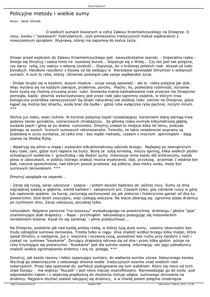 Portal Muskie.Pl Policyjne metody i wielkie sumy Autor: Jacek Jóźwiak O wielkich sumach łowionych w cofce Zalewu Krzemieńczuckiego na Dnieprze. O nocy, kwoku i "zestawach" hybrydalnych, czyli pomieszaniu tradycyjnych metod wędkarskich z nowoczesnym sprzętem. Wyprawa, której nie zapomnę do końca życia. Dniepr przed wejściem do Zalewu Krzemieńczuckiego jest niewyobrażalnie szeroki. - Imperialna rzeka śmieje się Dmytryj i sadza mnie na wysokiej burcie... Dopytuje się o Wisłę... Czy też jest tak potężna, czy darzy rybą, czy walczy o własną czystość... Dopytuje, bo o królowej polskich rzek słyszał od ludzi bywałych. Handlowi rezydenci z Kijowa od lat siedzący w Warszawie opowiadali Dmytrowi o wiślanych sumach. A sum to ryba, której Ukrainiec poświęcił całe swoje wędkarskie życie. - Dniepr brudzi się w każdym, dużym mieście - snuje swoją opowieść - ale to rzeka potężna jak dzik. Więc wyciera się na każdym zakręcie, przełomie, porohu. Piachy, iły, podwodna roślinność, korzenie łozin żywią się chemią zrzucaną przez ludzi. Sowiecka mania kaskadowania rzek przecież nie Dnieprowi pomogła, każdy zbiornik wykorzystywany jest przez rzek jako ogromny osadnik, w którym trwa biologiczna przeróbka zanieczyszczeń Są dzięki naturalnej sile wielkiej rzeki odcinki na Dnieprze, gdzie kąpać się można bez strachu, wodę brać dla bydła i gdzie ryba wyłącznie ryba pachnie, niczym innym. *** Słońce już nisko, wiatr cichnie. W koronie potężnej topoli rozsadzającej korzeniami starą ostrogę trwa godowy taniec guniaków, czerwcowych chrabąszczy. Za główką rzeka wymyła kilkumetrową głębię, wydarła piach i glinę aż po skalne rumowisko. Dmytryj znalazł to miejsce kilka lat temu, podczas jednego ze swoich licznych sumowych rekonesansów. Twierdzi, że takie zwiadowcze wyprawy są podstawą w życiu sumiarza, że tylko one - bez wędki niekiedy, czasem z mocnym spinningiem - dają szanse na Wielką Rybę. - Wpatruję się pilnie w mapę i wybieram kilkukilometrowy odcinek brzegu. Najlepiej po zewnętrznym łuku rzeki, tam, gdzie nurt napiera na burty. Biorę ze sobą lornetkę, mocny spining, kilka wielkich płytko schodzących woblerów z grzechotką i idę śledzić sumy. Interesuje mnie każdy dół śródrzeczny, każde ploso w zatoczkach, w pobliżu którego znaleźć można wypłycenie, blat, przykosę, przemiał. I właśnie ten blat, rzeczne spowolnienie, nad którym powoli przelewa się półtora, dwa metry wody, może być sumowym żerowiskiem. *** Dmytryj spogląda na zegarek... - Zaraz się ruszą, zaraz usłyszysz - szepce - i potem słyszeć będziesz do późnej nocy. Sumy za dnia najczęściej siedzą w głębinie, wśród kamieni i zatopionych pni. Czasem tylko, gdy ciśnienie ruszy w górę lub raptownie spadnie na burzę, zaczynają zachowywać się jak piskorze i histerycznie ganiać od dna ku powierzchni. Dziś dzień zwyczajny, więc czekają wieczora. Na blacie zbierają się ogromne stada drobnicy po ruchliwym dniu. Zaraz usłyszysz, poczekaj tylko. Usłyszałem. Najpierw paniczne "rra-szszszuu" wyskakującego na powierzchnię drobiazgu i głośne "ppa" znamionujące atak drapieżcy. - Rapa - prychnąłem lekceważąco posługując się mazowieckim określeniem bolenia. Kazał mi się zamknąć i pilnie podsłuchiwać... Na Dnieprze, podobnie jak nad każdą polską rzeką, w której żyją duże sumy, uważny obserwator bez trudu odnajdzie sumowe żerowiska. Trzeba tylko w ciągu dnia znaleźć wzdłuż brzegu kilka miejsc, które opisał Dmytro, a następnie, już z wieczora i wczesną nocą, posiedzieć bez ruchu przy każdym z nich i czekać na sumowe "kwokanie". Żerujący drapieżca odrywa się od dna i przez kilka godzin poluje na ryby trzymające się powierzchni. "Kwokanie" jest dla sumów ważną informacją: oto jego pobratymcy znaleźli wielkie zgromadzenie drobnicy i żrą na potęgę. *** Dmytryj, jak każdy rasowy i lekko szpanujący sumiarz, do wabienia sumów używa klasycznego kwoka. Wyrżnął go własnoręcznie z osikowego drewna wedle tradycyjnych wzorów znad wielkich rzek syberyjskich. Przez lata opanował do perfekcji posługiwanie się tym wabikiem. Różni się nieco od tych znad Dunaju - ma większy "tłuczek" i jest nieco inaczej wyprofilowany. Wprowadzając go do wody pod odpowiednim kątem i z właściwą prędkością do złudzenia imituje odgłos sumowego żerowania na drobnicy. Najpierw słychać szelest ratującej się drobnicy, a w chwilę potem potężne cmoknięcie. http://muskie.home.pl Kreator PDF Utworzono 7 March, 2017, 11:49 Portal Muskie.Pl Niekiedy Dmytryj uderza o wodę drugą stroną szerokiego tłoka. Mocno, z całej siły. I wówczas słychać to, co można usłyszeć na sumowych żerowiskach całego świata - jakby ktoś na płask wrzucił do wody płytę chodnikową. Sumiarze wiedzą, co to znaczy - oto wielki drapieżnik rozpoczął intensywny żer... Sumy, nawet z wielkich odległości słyszą i to kwokanie, i wywalenie się na powierzchnię. A gdzie pożywi się jeden, znajdzie się żarcie dla kolejnego... Ale "kwok" nie jest niezbędny, choć zastąpić go trudno. Kwok wprawnemu ędkarzowi pozwala wabić dumy i przez cała noc. Tak jest zbudowany, tak jest wygięty i wyprofilowany, że można go całkiem nieźle zastąpić zwykłym słoikiem - na przykład litrowym twistem. Wystarczy trzymać go do góry dnem i otworem naczynia uderzać niezbyt mocno o powierzchnię wody. Kilkunastominutowa praktyka wystarczy do tego, by dobrze opanować sztukę "kwokania". A później trzeba serię "kwoknięć" powtarzać co kilka minut. I choć to nie to samo, co kwok syberyjski czy dunajski, to i on może wabić czarnych drapieżców. *** - Nie ma siły - zapewnia Dmytryj. - Jeśli sumy są w pobliżu, nadciągną bardzo szybko. I pozostaną przez kilka godzin, jeśli na blacie nocują ukleje, krąpie i płoteczki. Tylko łowić, łowić, łowić... Machnia pod