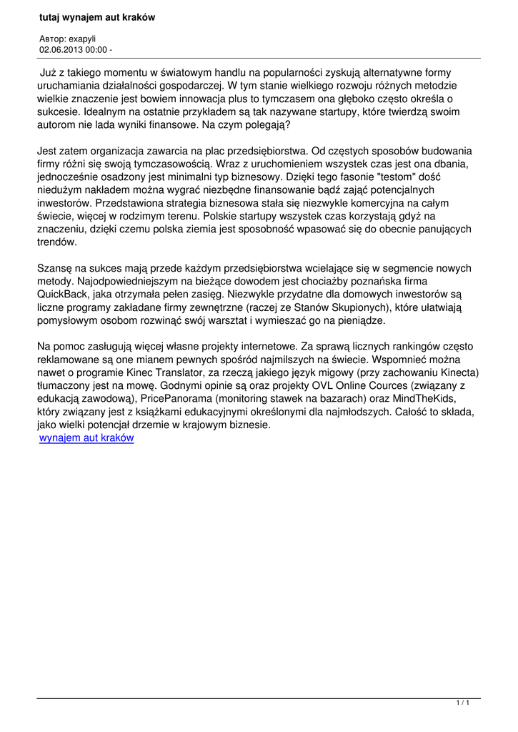tutaj wynajem aut kraków Автор: exapyli 02.06.2013 00:00 - Już z takiego momentu w światowym handlu na popularności zyskują alternatywne formy uruchamiania działalności gospodarczej. W tym stanie wielkiego rozwoju różnych metodzie wielkie znaczenie jest bowiem innowacja plus to tymczasem ona głęboko często określa o sukcesie. Idealnym na ostatnie przykładem są tak nazywane startupy, które twierdzą swoim autorom nie lada wyniki finansowe. Na czym polegają? Jest zatem organizacja zawarcia na plac przedsiębiorstwa. Od częstych sposobów budowania firmy różni się swoją tymczasowością. Wraz z uruchomieniem wszystek czas jest ona dbania, jednocześnie osadzony jest minimalni typ biznesowy. Dzięki tego fasonie "testom" dość niedużym nakładem można wygrać niezbędne finansowanie bądź zająć potencjalnych inwestorów. Przedstawiona strategia biznesowa stała się niezwykle komercyjna na całym świecie, więcej w rodzimym terenu. Polskie startupy wszystek czas korzystają gdyż na znaczeniu, dzięki czemu polska ziemia jest sposobność wpasować się do obecnie panujących trendów. Szansę na sukces mają przede każdym przedsiębiorstwa wcielające się w segmencie nowych metody. Najodpowiedniejszym na bieżące dowodem jest chociażby poznańska firma QuickBack, jaka otrzymała pełen zasięg. Niezwykle przydatne dla domowych inwestorów są liczne programy zakładane firmy zewnętrzne (raczej ze Stanów Skupionych), które ułatwiają pomysłowym osobom rozwinąć swój warsztat i wymieszać go na pieniądze. Na pomoc zasługują więcej własne projekty internetowe. Za sprawą licznych rankingów często reklamowane są one mianem pewnych spośród najmilszych na świecie. Wspomnieć można nawet o programie Kinec Translator, za rzeczą jakiego język migowy (przy zachowaniu Kinecta) tłumaczony jest na mowę. Godnymi opinie są oraz projekty OVL Online Cources (związany z edukacją zawodową), PricePanorama (monitoring stawek na bazarach) oraz MindTheKids, który związany jest z książkami edukacyjnymi określonymi dla najmłodszych. Całość to składa, jako wielki potencjał drzemie w krajowym biznesie. wynajem aut kraków 1/1
