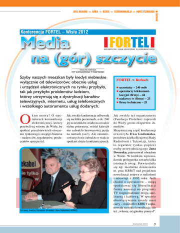 teletemat SIECI KABLOWE N MEDIA N BIZNES N TELEKOMUNIKACJA N NOWE TECHNOLOGIE Konferencja FORTEL – Wisła 2012 Media na (gór) szczycie Danuta Harenda Fot. A.Konaszewski, T. Marczewski Szyby naszych mieszkaƒ były kiedyÊ niebieskie wyłàcznie od telewizorów; obecnie usług i urzàdzeƒ elektronicznych na rynku przybyło, tak jak przybyło problemów ludziom, którzy utrzymujà si´ z dystrybucji kanałów telewizyjnych, internetu, usług telefonicznych i wszelkiego autoramentu usług dodanych. O k im mowa? O operatorach komunikacji elektronicznej, którzy przybyli tej wiosny do Wisły, by spotkać przedstawicieli otoczenia rynkowego swojego biznesu – nadawców, regulatorów, producentów sprzętu itd. Jak zwykle konferencja odbywała się na kilku poziomach, a ok. 240 jej uczestników miało na uwadze różne priorytety, wśród których nie zabrakło brawurowej jazdy na nartach (sic!). Ale zainteresowanych nie zabrakło w trakcie spotkań stricte konferencyjnych. Od lewej: Andrzej Ostrowski (Protelko) i Ewa Gadomska (KRRiT) FORTEL w liczbach l uczestnicy – 240 osób l operatorzy telekomuni- kacyjni (firmy) – 44 l nadawcy tv (firmy) – 25 l firmy techniczne – 25 Jak zwykle też organizatorzy (Fundacja Protelko) zaprosili do Wisły grono ekspertów ds. mediów. Merytoryczną część konferencji otworzyła Ewa Gadomska, przedstawicielka Krajowej Rady Radiofonii i Telewizji, który to regulator rynku, poprzez osobę przewodniczącego Jana Dworaka, patronował obradom w Wiśle. W krótkim wprowadzeniu prelegentka zawarła kilka istotnych uwag. Potwierdziły się np. medialne doniesienia nt. prac KRRiT nad projektem nowelizacji ustawy o radiofonii i telewizji z 1992 roku. Jeśli chodzi o operatorów – mogą spodziewać się liberalizacji formy koncesji na programy TV rozprowadzane drogą satelitarną i kablową. W sprawie obowiązywania zasady must carry – must offer KRRiT zaplanowała szerokie konsultacje, ale też „własny, oryginalny pomysł”. Kwiecieƒ 2012 teletemat E. Gadomska potwierdziła, że polscy regulatorzy przyglądają się możliwości regulacji usługi VoD – nie ma jednak ustaleń podziału kompetencji między ministerstwami; być może ciężar tych rozwiązań weźmie na siebie Ministerstwo Administracji i Cyfryzacji na czele z Michałem Bonim. Jednym z poruszanych tematów była sprawa koncesji kanałów telewizyjnych obecnych na multipleksie telewizji naziemnej. Skargi podmiotów, które nie uzyskały koncesji w tym procesie ( Fundacji Lux Veritatis i Media Sat (nadawcy Tele 5) rozstrzygnąć ma Wojewódzki Sąd Administracyjny. Teoretycznie nie jest wykluczone, że po orzeczeniu sądu pozytywne orzeczenia koncesyjne mogą zostać przez KRRiT cofnięte, jednak bardziej prawdopodobne jest, że zainteresowane stacje kolejne koncesje otrzymają. Już w pierwszych godzinach konferencyjnych spotkań wypłynął na powierzchnię powracający potem jak bumerang temat nowego mobilnego multipleksu telewizji naziemnej, który to projekt sygnowany przez Cyfrowy Polsat ujrzy światło dzienne na przełomie kwietnia i maja br. Jak zapewniła E. Gadomska – gospodarzem tego konkursu nie jest KRRiT, ale Urząd Komunikacji Elektronicznej. Prelegentkę zasypano gradem pytań: o status prawny nadawania programów telewizji Bridget Cosgrave w trakcie konferencyjnego wykładu lokalnej w internecie, o status prawny nadawania l masowa obecność w Europie programów telewizji lokalnej produktów z rynków azjatyckich w sieci internetu bezprzewodo- oferowanych po bardzo konkurenwego Wi-MAX, o przyszłość cyjnych cenach; analogowych sieci kablowych, l ryzyko podejmowania medialo kwestię ściągalności abona- nych inicjatyw na terenie Europy mentu itp. ze względu na dużą różnorodność oczekiwań odbiorców (co utrudnia też konsolidację tego rynku); Bridget Cosgrave, reprezentu- l rozwój nowych obszarów temająca organizację Every European tycznych, takich jak monitorowaDigital z Brukseli, przedstawiła nie zdrowia za pośrednictwem gościom konferencji trendy w roz- sieci oraz serwisy bankowości woju mediów elektronicznych elektronicznej; w naszej części Europy progno- l zwiększone zapotrzebowanie na zowane przez agendy Komisji serwisy wymagające szerokiego Europejskiej. Jej zdaniem są to pasma; m.in.: l duży, dwucyfrowy wzrost l rynkowa eksplozja liczby urzą- zysków pochodzących z transferu dzeń przyłączanych do sieci; danych; Perspektywy Panel dyskusyjny „Plany inwestycyjne w szerokopasmowe sieci dost´powe” Kwiecieƒ 2012 teletemat SIECI KABLOWE N MEDIA N BIZNES N TELEKOMUNIKACJA N NOWE TECHNOLOGIE Panel dyskusyjny „Konsolidacja platform cyfrowych vs rozproszony rynek kablowy” l coraz większe różnicowanie ofert operatorów. Rozwój czy dreptanie w miejscu? O planach inwestycji w szerokopasmowe sieci dostępowe opowiadał zebranym dr Krzysztof Heller, przedstawiając interesujące mapy Polski z uwzględnieniem rozwoju infrastruktury telekomunikacyjnej w ostatnich latach. Z prelekcji wynikało, że tego typu projektów Państwa opartych na funduszach europejskich jest w sferze publicznej dużo, choć są to „działania rozproszone”. Jednak, jeśli chodzi nie o fazę projektów, a o konkretne inwestycje – sytuacja nie wygląda różowo. O tym m.in. mówili zaproszeni przez K. Hellera do dyskusji paneliści. „Jaki model biznesowy miałby zwrócić poniesione na infrastrukturę telekomunikacyjną nakłady” – pytał Stefan Kamiński, prezes KIGEiT. Robert Kwiatkowski prezes zarządu Spółki Hyperion, teledostawcy usług multimedialnych, powątpiewał w sens rozbuchanych inwestycji. Czy potrzeby (m.in. szybkość przesyłu pasma) są rzeczywiście tak duże jak sugerują urzędnicy? Czy w sytuacji, gdy na rynku pojawiła się technologia LTE, nie warto zacząć rozmawiać pomiędzy podmiotami rynkowymi o współdzieleniu infrastruktury? – dywagował. Dowodził też nie bez racji, że tzw. megaustawa dotknie dopiero pozw