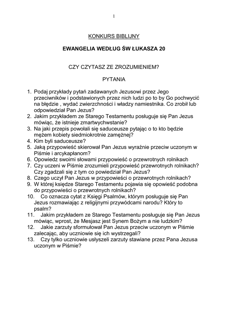 1 KONKURS BIBLIJNY EWANGELIA WEDŁUG ŚW ŁUKASZA 20 CZY CZYTASZ ZE ZROZUMIENIEM? PYTANIA 1. Podaj przykłady pytań zadawanych Jezusowi przez Jego przeciwników i podstawionych przez nich ludzi po to by Go pochwycić na błędzie , wydać zwierzchności i władzy namiestnika. Co zrobił lub odpowiedział Pan Jezus? 2. Jakim przykładem ze Starego Testamentu posługuje się Pan Jezus mówiąc, że istnieje zmartwychwstanie? 3. Na jaki przepis powołali się saduceusze pytając o to kto będzie mężem kobiety siedmiokrotnie zamężnej? 4. Kim byli saduceusze? 5. Jaką przypowieść skierował Pan Jezus wyraźnie przeciw uczonym w Piśmie i arcykapłanom? 6. Opowiedz swoimi słowami przypowieść o przewrotnych rolnikach 7. Czy uczeni w Piśmie zrozumieli przypowieść przewrotnych rolnikach? Czy zgadzali się z tym co powiedział Pan Jezus? 8. Czego uczył Pan Jezus w przypowieści o przewrotnych rolnikach? 9. W której księdze Starego Testamentu pojawia się opowieść podobna do przypowieści o przewrotnych rolnikach? 10. Co oznacza cytat z Księgi Psalmów, którym posługuje się Pan Jezus rozmawiając z religijnymi przywódcami narodu? Który to psalm? 11. Jakim przykładem ze Starego Testamentu posługuje się Pan Jezus mówiąc, wprost, że Mesjasz jest Synem Bożym a nie ludzkim? 12. Jakie zarzuty sformułował Pan Jezus przeciw uczonym w Piśmie zalecając, aby uczniowie się ich wystrzegali? 13. Czy tylko uczniowie usłyszeli zarzuty stawiane przez Pana Jezusa uczonym w Piśmie? 2 KONKURS BIBLIJNY EWANGELIA WEDŁUG ŚW ŁUKASZA CZY CZYTASZ ZE ZROZUMIENIEM? KLUCZ DO ODPOWIEDZI 1. Pewnego dnia, kiedy nauczał lud w świątyni i głosił Dobrą Nowinę, podeszli arcykapłani i uczeni w Piśmie wraz ze starszymi i zapytali Go: "Powiedz nam, jakim prawem to czynisz albo kto Ci dał tę władzę?"( Odpowiedział im: "Ja też zadam wam pytanie. Powiedzcie Mi: Czy chrzest Janowy pochodził z nieba, czy też od ludzi?" Oni zastanawiali się i mówili między sobą: "Jeśli powiemy: "Z nieba", zarzuci nam: "Dlaczego nie uwierzyliście mu?" A jeśli powiemy: "Od ludzi", cały lud nas ukamienuje, bo jest przekonany, że Jan był prorokiem". Odpowiedzieli więc, że nie wiedzą, skąd pochodził. Wtedy Jezus im rzekł: "To i Ja wam nie powiem, jakim prawem to czynię Czy wolno nam płacić podatek Cezarowi, czy nie?"( On przejrzał ich podstęp i rzekł do nich: "Pokażcie Mi denara. Czyj nosi obraz i napis?" Odpowiedzieli: "Cezara". Wówczas rzekł do nich: "Oddajcie więc Cezarowi to, co należy do Cezara, a Bogu to, co należy do Boga".) Czyją żoną będzie po zmartwychwstaniu kobieta, która na tym świecie miała siedmiu mężów?( Jezus im odpowiedział: "Dzieci tego świata żenią się i za mąż wychodzą. Lecz ci, którzy uznani zostaną za godnych udziału w świecie przyszłym i w powstaniu z martwych, ani się żenić nie będą, ani za mąż wychodzić. Już bowiem umrzeć nie mogą, gdyż są równi aniołom i są dziećmi Bożymi, będąc uczestnikami zmartwychwstania) 2. A że umarli zmartwychwstają, to i Mojżesz zaznaczył tam, gdzie jest mowa "O krzaku", gdy Pana nazywa Bogiem Abrahama, Bogiem Izaaka i Bogiem Jakuba. Bóg nie jest [Bogiem] umarłych, lecz żywych; wszyscy bowiem dla Niego żyją". 3. Prawo lewiratu :” "Nauczycielu, Mojżesz tak nam przepisał: Jeśli umrze czyjś brat, który miał żonę, a był bezdzietny, niech jego brat weźmie wdowę i niech wzbudzi potomstwo swemu bratu” 4. Członkami żydowskiego stronnictwa religijno – politycznego. Ugodowi względem Rzymu. Nieprawowierni w poglądach religijnych: odrzucali nieśmiertelność duszy, zmartwychwstanie ciał, Opatrzność, istnienie 3 świata duchów. Kłócili się z faryzeuszami, ale tak samo jak oni nie cierpieli Chrystusa. 5. Przypowieść o przewrotnych rolnikach 6. "Pewien człowiek założył winnicę, oddał ją w dzierżawę rolnikom i wyjechał na dłuższy czas. W odpowiedniej porze wysłał sługę do rolników, aby mu oddali jego część z plonu winnicy. Lecz rolnicy obili go i odesłali z niczym. Ponownie posłał drugiego sługę. Lecz i tego obili, znieważyli i odesłali z niczym. Posłał jeszcze trzeciego; tego również pobili do krwi i wyrzucili. Wówczas rzekł pan winnicy: "Co mam począć? Poślę mojego syna ukochanego, chyba go uszanują". Lecz rolnicy, zobaczywszy go, naradzali się między sobą mówiąc: "To jest dziedzic, zabijmy go, a dziedzictwo stanie się nasze". I wyrzuciwszy go z winnicy, zabili. Co więc uczyni z nimi właściciel winnicy? Przyjdzie i wytraci tych rolników, a winnicę da innym” 7. Oczywiście zrozumieli, ale gdy to usłyszeli, zawołali: "Nie, nigdy!" 8. Pan Jezus potępia złą wolę zwierzchników religijnych Oświadcza, że jest Synem Bożym (Wówczas rzekł pan winnicy: "Co mam począć? Poślę mojego syna ukochanego, chyba go uszanują) 9. W księdze proroka Izajasza 10. To Psalm 118.Jezus mówi, że jest kamieniem odrzuconym przez Żydów, a przez Boga użytym jako fundament całej budowli ( tzw. kamień węgielny) 11. Natomiast On rzekł do nich: "Jak można twierdzić, że Mesjasz jest synem Dawida?( tzn „ synem ludzkim”, synem człowieka) Przecież sam Dawid mówi w Księdze Psalmów: Rzekł Pan do Pana mego: Siądź po prawicy mojej, aż położę nieprzyjaciół Twoich jako podnóżek pod Twoje stopy. Dawid nazywa Go Panem: jak zatem może On być [tylko] jego synem?" 12. "Strzeżcie się uczonych w Piśmie, którzy z upodobaniem chodzą w powłóczystych szatach, lubią pozdrowienia na rynku, pierwsze krzesła w synagogach i zaszczytne miejsca na ucztach. Objadają oni domy wdów i dla pozoru długo się modlą. Ci tym surowszy dostaną wyrok". 13. Słuchał tego „cały lud’