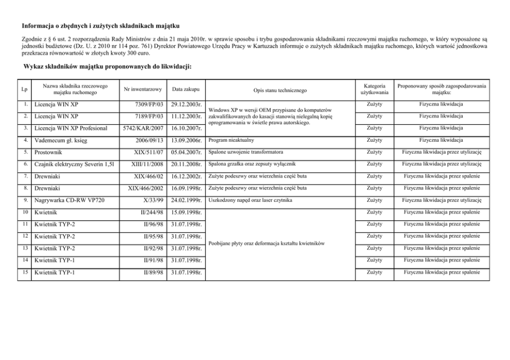 Informacja o zbędnych i zużytych składnikach majątku Zgodnie z § 6 ust. 2 rozporządzenia Rady Ministrów z dnia 21 maja 2010r. w sprawie sposobu i trybu gospodarowania składnikami rzeczowymi majątku ruchomego, w który wyposażone są jednostki budżetowe (Dz. U. z 2010 nr 114 poz. 761) Dyrektor Powiatowego Urzędu Pracy w Kartuzach informuje o zużytych składnikach majątku ruchomego, których wartość jednostkowa przekracza równowartość w złotych kwoty 300 euro. Wykaz składników majątku proponowanych do likwidacji: Lp 1. Nazwa składnika rzeczowego majątku ruchomego Nr inwentarzowy Data zakupu Opis stanu technicznego Kategoria użytkowania Proponowany sposób zagospodarowania majątku: Zużyty Fizyczna likwidacja Windows XP w wersji OEM przypisane do komputerów zakwalifikowanych do kasacji stanowią nielegalną kopię oprogramowania w świetle prawa autorskiego. Zużyty Fizyczna likwidacja Zużyty Fizyczna likwidacja 13.09.2006r. Program nieaktualny Zużyty Fizyczna likwidacja XIX/511/07 05.04.2007r. Spalone uzwojenie transformatora Zużyty Fizyczna likwidacja przez utylizację XIII/11/2008 20.11.2008r. Spalona grzałka oraz zepsuty wyłącznik Zużyty Fizyczna likwidacja przez utylizację Drewniaki XIX/466/02 16.12.2002r. Zużyte podeszwy oraz wierzchnia część buta Zużyty Fizyczna likwidacja przez spalenie 8. Drewniaki XIX/466/2002 16.09.1998r. Zużyte podeszwy oraz wierzchnia część buta Zużyty Fizyczna likwidacja przez spalenie 9. Nagrywarka CD-RW VP720 X/33/99 24.02.1999r. Uszkodzony napęd oraz laser czytnika Zużyty Fizyczna likwidacja przez utylizację 10 Kwietnik II/244/98 15.09.1998r. Zużyty Fizyczna likwidacja przez spalenie 11 Kwietnik TYP-2 II/96/98 31.07.1998r. Zużyty Fizyczna likwidacja przez spalenie 12 Kwietnik TYP-2 II/95/98 31.07.1998r. Zużyty Fizyczna likwidacja przez spalenie Zużyty Fizyczna likwidacja przez spalenie Licencja WIN XP 7309/FP/03 29.12.2003r. 2. Licencja WIN XP 7189/FP/03 11.12.2003r. 3. Licencja WIN XP Profesional 5742/KAR/2007 16.10.2007r. 4. Vademecum gł. księg 2006/09/13 5. Prostownik 6. Czajnik elektryczny Severin 1,5l 7. Poobijane płyty oraz deformacja kształtu kwietników 13 Kwietnik TYP-2 II/92/98 31.07.1998r. 14 Kwietnik TYP-1 II/91/98 31.07.1998r. Zużyty Fizyczna likwidacja przez spalenie 15 Kwietnik TYP-1 II/89/98 31.07.1998r. Zużyty Fizyczna likwidacja przez spalenie