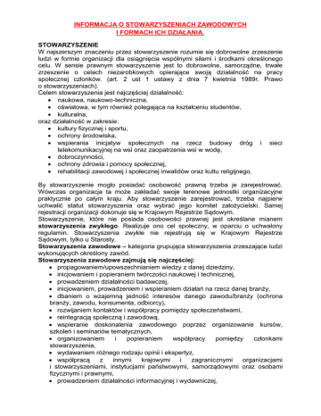 INFORMACJA O STOWARZYSZENIACH ZAWODOWYCH I FORMACH ICH DZIAŁANIA. STOWARZYSZENIE W najszerszym znaczeniu przez stowarzyszenie rozumie się dobrowolne zrzeszenie ludzi w formie organizacji dla osiągnięcia wspólnymi siłami i środkami określonego celu. W sensie prawnym stowarzyszenie jest to dobrowolne, samorządne, trwałe zrzeszenie o celach niezarobkowych opierające swoją działalność na pracy społecznej członków. (art. 2 ust 1 ustawy z dnia 7 kwietnia 1989r. Prawo o stowarzyszeniach). Celem stowarzyszenia jest najczęściej działalność:  naukowa, naukowo-techniczna,  oświatowa, w tym również polegająca na kształceniu studentów,  kulturalna, oraz działalność w zakresie:  kultury fizycznej i sportu,  ochrony środowiska,  wspierania inicjatyw społecznych na rzecz budowy dróg i sieci telekomunikacyjnej na wsi oraz zaopatrzenia wsi w wodę,  dobroczynności,  ochrony zdrowia i pomocy społecznej,  rehabilitacji zawodowej i społecznej inwalidów oraz kultu religijnego. By stowarzyszenie mogło posiadać osobowość prawną trzeba je zarejestrować. Wówczas organizacja ta może zakładać swoje terenowe jednostki organizacyjne praktycznie po całym kraju. Aby stowarzyszenie zarejestrować, trzeba najpierw uchwalić statut stowarzyszenia oraz wybrać jego komitet założycielski. Samej rejestracji organizacji dokonuje się w Krajowym Rejestrze Sądowym. Stowarzyszenie, które nie posiada osobowości prawnej jest określane mianem stowarzyszenia zwykłego. Realizuje ono cel społeczny, w oparciu o uchwalony regulamin. Stowarzyszenia zwykłe nie rejestrują się w Krajowym Rejestrze Sądowym, tylko u Starosty. Stowarzyszenia zawodowe – kategoria grupująca stowarzyszenia zrzeszające ludzi wykonujących określony zawód. Stowarzyszenia zawodowe zajmują się najczęściej:  propagowaniem/upowszechnianiem wiedzy z danej dziedziny,  inicjowaniem i popieraniem twórczości naukowej i technicznej,  prowadzeniem działalności badawczej,  inicjowaniem, prowadzeniem i wspieraniem działań na rzecz danej branży,  dbaniem o wzajemną jedność interesów danego zawodu/branży (ochrona branży, zawodu, konsumenta, odbiorcy),  rozwijaniem kontaktów i współpracy pomiędzy społeczeństwami,  reintegracją społeczną i zawodową,  wspieranie doskonalenia zawodowego poprzez organizowanie kursów, szkoleń i seminariów tematycznych,  organizowaniem i popieraniem współpracy pomiędzy członkami stowarzyszenia,  wydawaniem różnego rodzaju opinii i ekspertyz,  współpracą z innymi krajowymi i zagranicznymi organizacjami i stowarzyszeniami, instytucjami państwowymi, samorządowymi oraz osobami fizycznymi i prawnymi,  prowadzeniem działalności informacyjnej i wydawniczej,  wspieraniem inicjatyw społecznych i kulturalnych włączając się w ich realizację. Stowarzyszenie „Między Prosną a Wartą” Lokalna Grupa Działania ul. Rynek 1-7 98-400 Wieruszów tel. (62) 78-13-929, (62) 78-13-928 tel. kom.: 601-616-560, 601-861-060 www.Igd-wieruszow.pl e-mail: [email protected] Działalność wspomagająca rozwój wspólnot i społeczności lokalnych. JMR Edukacja I Praca ul. Rynek 14 98-400 Wieruszów tel./fax.: (62) 58-10-383 Głównymi celami Stowarzyszenia są: 1. działanie na rzecz promocji zatrudnienia i aktywizacji zawodowej osób pozostających bez pracy i zagrożonych marginalizacją społeczną, 2. promocja i wspomaganie edukacji, edukacja ekologiczna i ekonomiczna, 3. pomoc w zdobywaniu wiedzy i kwalifikacji umożliwiających mieszkańcom wsi i małych miast spełnienie funkcji społecznych i zawodowych, 4. promowanie pozaszkolnych form edukacji, 5. kształcenie kadr pracowniczych, tworzenie lokalnych systemów informacyjnych i informatycznych, 6. organizowanie wszelkich form edukacji informatycznej, 7. upowszechnianie nowoczesnych rozwiązań teleinformatycznych, 8. wspieranie zrównoważonego rozwoju obszarów wiejskich, 9. wspieranie przedsiębiorczości, 10. pomoc w pozyskiwaniu środków na rozwój małych i średnich przedsiębiorstw oraz gospodarstw rolnych, 11. propagowanie kultury fizycznej, sportu i turystyki. Stowarzyszenie "JMR Edukacja i Praca" m.in. organizuje szkolenia, kursy oraz inne formy edukacyjne, wspiera inicjatywy społeczne oraz zawodowe, prowadzi działalności informacyjne, współpracuje z organizacjami, osobami i instytucjami o podobnych celach statutowych. Obszary działań: 1. Przeciwdziałanie bezrobociu, rozwój gospodarczy; - Działalność wspomagająca rozwój gospodarczy, w tym rozwój przedsiębiorczości; - Promocja zatrudnienia i aktywizacji zawodowej osób pozostających bez pracy i zagrożonych zwolnieniem z pracy; 2. Nauka, kultura, ekologia; - Nauka, szkolnictwo wyższe, edukacja, oświata i wychowanie; 3. Sport, turystyka, wypoczynek; - Wspieranie i upowszechnianie kultury fizycznej i sportu. Stowarzyszenie Integracyjne „Klub Otwartych Serc” ul. Sportowa 7 98-400 Wieruszów tel. (62) 78-41-331 tel./fax. (62) 78-42-535 e-mail: [email protected] www.sikos.org.pl Celem Stowarzyszenia jest: 1. wyrównywanie szans rozwojowych dzieci i młodzieży niezależnie od ich sprawności fizycznej, psychicznej, patologii, wyznania, czy statusu finansowego; 2. animowanie zorganizowanej aktywności lokalnej na rzecz rozwoju i promocji idei europejskiego społeczeństwa obywatelskiego, którego integralną częścią są organizacje pozarządowe. Obszary działań: 1. Przezwyciężanie trudnych sytuacji życiowych, działalność wspierająca; - Pomoc społeczna, w tym pomoc rodzinom i osobom w trudnej sytuacji życiowej oraz wyrównywanie ich szans; - Działalność na rzecz osób niepełnosprawnych; 2. Przeciwdziałanie bezrobociu, rozwój gospodarczy; - Promocja zatrudnienia i aktywizacji zawodowej osób pozostających bez pracy i zagrożonych zwolnieniem z pracy; 3. Doradztwo zawodowe, poradnictwo; - odbiorcy: osoby niepracujące; 4. Szkolenia, podnoszenie kwalifikacji; - odbiorcy: osoby niepracujące, osoby niepracujące 
