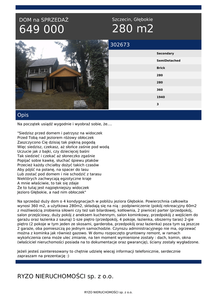 Szczecin, Głębokie DOM na SPRZEDAŻ 280 m2 649 000 302673 Secondary SemiDetached Brick 280 280 360 1940 3 Opis Na początek usiądź wygodnie i wyobraź sobie, że.... "Siedzisz przed domem i patrzysz na widoczek Przed Tobą nad jeziorem różowy obłoczek Zaszczycono Cię dzisiaj tak piękną pogodą Więc siedzisz, czekasz, aż słońce zaśnie pod wodą Uczucie jak z bajki, czy dziecięcej baśni Tak siedzieć i czekać aż słoneczko zgaśnie Popijać sobie kawkę, słuchać śpiewu ptaków Przecież każdy chciałby dożyć takich czasów Aby pójść na polanę, na spacer do lasu Lub zostać pod domem i nie schodzić z tarasu Niektórych zachwycają egzotyczne kraje A mnie właściwie, to tak się zdaje Że to tutaj jest najpiękniejszy widoczek Jezioro Głębokie, a nad nim obłoczek" Na sprzedaż duży dom o 4 kondygnacjach w pobliżu jeziora Głębokie. Powierzchnia całkowita wynosi 360 m2, a użytkowa 280m2, składają się na nią : podpiwniczenie (pokój rekreacyjny 60m2 z możliwością zrobienia siłowni czy też sali bilardowej, kotłownia, 2 piwnice) parter (przedpokój, salon przejściowy, duży pokój z aneksem kuchennym, salon kominkowy, przedpokój z wejściem do garażu oraz łazienka z sauną) 1-sze piętro (przedpokój, 4 pokoje, łazienka, obszerny taras) 2-gie piętro (2 pokoje w tym jeden ze skosami, garderoba, przedpokój oraz łazienka) poza tym są jeszcze 2 garaże, oba pomieszczą po jednym samochodzie. Czynszu administracyjnego nie ma, ogrzewać można z kominka jak również gazowo. W domu rozpoczęto gruntowny remont, w ramach wykończenia cena może ulec zmianie, na ten moment wymienione zostały : dach, komin, okna (właściciel nieruchomości posiada na to dokumentacje oraz gwarancję), ściany zostały wygładzone. Jeżeli jesteś zainteresowany to chętnie udzielę wiecęj informacji telefonicznie, serdecznie zapraszam na prezentację :) RYZO NIERUCHOMOŚCI sp. z o.o. RYZO NIERUCHOMOŚCI sp. z o.o. tel. 91 484 22 84 email: [email protected] RYZO NIERUCHOMOŚCI sp. z o.o. Powered by TCPDF (www.tcpdf.org)