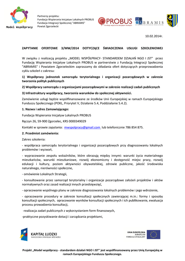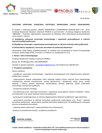 Partnerzy projektu: Fundacja Wspierania Inicjatyw Lokalnych PROBUS Fundacja Integracji Społecznej "ABRAMIS" Powiat Zgorzelecki 10.02.2014r. ZAPYTANIE OFERTOWE 3/MW/2014 DOTYCZĄCE ŚWIADCZENIA USŁUGI SZKOLENIOWEJ W związku z realizacją projektu „MODEL WSPÓŁPRACY- STANDARDEM DZIAŁAŃ NGO I JST" przez Fundację Wspierania Inicjatyw Lokalnych PROBUS w partnerstwie z Fundacją Integracji Społecznej "ABRAMIS" i Powiatem Zgorzeleckim zapraszamy do składania ofert dotyczących przeprowadzenia cyklu szkoleń z zakresu: 1) Współpracy jednostek samorządu terytorialnego i organizacji pozarządowych w zakresie tworzenia polityk publicznych 2) Współpracy samorządu z organizacjami pozarządowymi w zakresie realizacji zadań publicznych 3) Infrastruktury współpracy, tworzenia warunków do społecznej aktywności. Zamówienie usługi będzie współfinansowane ze środków Unii Europejskiej w ramach Europejskiego Funduszu Społecznego (POKL, Priorytet V, Działanie 5.4, Poddziałanie 5.4.2). 1. Nazwa i adres Zamawiającego: Fundacja Wspierania Inicjatyw Lokalnych PROBUS Ręczyn 26, 59-900 Zgorzelec, KRS 0000349029 Kontakt w sprawie zapytania: [email protected] lub telefonicznie 786 854 875. 2. Przedmiot zamówienia: Zakres szkolenia: - współpraca samorządu terytorialnego i organizacji pozarządowych przy diagnozowaniu lokalnych problemów i wyzwań, - wypracowanie zespołu wskaźników, które obrazują między innymi: warunki życia materialnego mieszkańców, warunki mieszkaniowe, rozwój ekonomiczny i dostępność miejsc pracy, rozwój edukacji i kultury, poziom aktywności obywatelskiej, zdrowie publiczne, jakość środowiska naturalnego, nierówności społeczne, - omówienie Lokalnych Strategii, - konsultowanie przez samorząd terytorialny i organizacje pozarządowe założeń projektów i aktów normatywnych oraz zasad realizacji innych przedsięwzięć, - opracowanie wspólnego planu w zakresie diagnozowania lokalnych problemów i jego wdrożenie, - opracowanie procedury w zakresie konsultacji społecznych zawierającej m.in.: formy i sposoby konsultacji społecznych, opracowanie wyników konsultacji społecznych i ich publikowanie, ewaluacja procesu prowadzenia konsultacji, -realizacja zadań publicznych z wykorzystaniem form finansowych, -praktyczne pozyskiwanie dotacji i zarządzania projektami, Projekt „Model współpracy - standardem działań NGO i JST" jest współfinansowany przez Unię Europejską w ramach Europejskiego Funduszu Społecznego. Partnerzy projektu: Fundacja Wspierania Inicjatyw Lokalnych PROBUS Fundacja Integracji Społecznej "ABRAMIS" Powiat Zgorzelecki -zasady inicjatyw lokalnych, -stosowania klauzul społecznych przy zamówieniach publicznych -zasad tworzenia programów współpracy -partnerstwa projektowe w realizacji zadań publicznych, -procedury oceny efektywności i równej dostępności realizowanych zadań przez jednostki samorządu terytorialnego i organizacje pozarządowe, - systemy wspierania inicjatyw obywatelskich i organizacji pozarządowych. Szkolenia obejmują 360 godz. 3. Termin i miejsce szkolenia: 27.02.2014r. - 02.03.2014r. 27.03.2014r. - 30.03.2014r. 24.04.2014r. – 27.04.2014r. Informacje dotyczące kolejnych terminów będą udzielane w późniejszym czasie. 4. Wymagania wobec Oferenta: - wykształcenie średnie lub wyższe w zakresie administracji publicznej, ekonomii społecznej lub pokrewnych, - doświadczenie w prowadzeniu szkoleń/warsztatów z zakresu współpracy NGO i JST, konsultacji społecznych, diagnozowaniu lokalnych problemów, opracowywania procedur, planów lub Lokalnych Strategii, -znajomość Lokalnego Indeksu Współpracy, -znajomość Ustawy z dnia 8 marca 1990 r. o samorządzie terytorialnym, Ustawy z dnia 24 kwietnia 2003 r. o działalności pożytku publicznego i o wolontariacie (Dz.U. z 2010 r., Nr 234, poz. 1536 z późn. zm.), -umiejętność pracy pod presją czasu, terminowość, sumienność. Na potwierdzenie spełniania powyższych warunków Oferent przedłoży: list motywacyjny, kserokopie dokumentów potwierdzających wykształcenie oraz doświadczenie zawodowe, cv oraz oświadczenie o wyrażeniu zgody na przetwarzanie danych osobowych. Należy podać cenę brutto za 1 godz. szkolenia. 5. Kryteria wyboru: kwalifikacje i doświadczenie 50%, cena 50% 6. Termin płatności – do 21 dni od daty przeprowadzenia ostatniego dnia szkolenia. Projekt „Model współpracy - standardem działań NGO i JST" jest współfinansowany przez Unię Europejską w ramach Europejskiego Funduszu Społecznego. Partnerzy projektu: Fundacja Wspierania Inicjatyw Lokalnych PROBUS Fundacja Integracji Społecznej "ABRAMIS" Powiat Zgorzelecki 7. Data, miejsce i forma nadsyłania ofert Wymagane dokumenty można przesłać: - drogą elektroniczną na adres: [email protected] - pocztą, przesyłką kurierską lub dostarczyć osobiście na adres: Fundacja Wspierania Inicjatyw Lokalnych PROBUS, Ręczyn 26, 59-900 Zgorzelec do dnia 20 lutego 2014r. do godziny 17.00 (liczy się data dostarczenia oferty, a nie jej nadania). W przypadku przekazania oferty drogą elektroniczną winna być ona podpisana i opieczętowana, a następnie przesłana w formie skanu. 8. Informacje dodatkowe: Ocena wyboru trenera dokonana przez Komisję na charakter ostateczny. Dokumenty aplikacyjne, w których nie zostanie podana cena brutto za godz. szkolenia nie będą rozpatrywane. Zamawiający nie dopuszcza składania ofert częściowych. Zamawiający może unieważnić postępowanie na każdym jego etapie. Zamawiający nie zwraca Oferentowi kosztów dojazdu do miejsca świadczenia usługi. W przypadku nie wybrania Wykonawcy, w szczególności w przypadku braku ofert Zamawiający dopuszcza możliwość ponownego rozpoczęcia procedury zapytania ofertowego. Niniejsze zapytanie nie jest zamówieniem i otrzymane od Oferentów oferty nie powodują żadnych zobowiązań wobec Stron. Projekt „Model współpracy - standardem działań NGO i JST" jest wsp