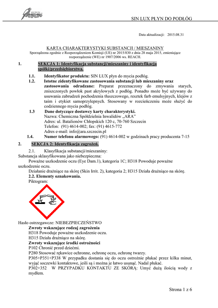 SIN LUX PŁYN DO PODŁÓG Data aktualizacji: 2015.08.31 KARTA CHARAKTERYSTYKI SUBSTANCJI / MIESZANINY Sporządzona zgodnie z Rozporządzeniem Komisji (UE) nr 2015/830 z dnia 28 maja 2015, zmieniające rozporządzenie (WE) nr 1907/2006 ws. REACH. 1. SEKCJA 1: Identyfikacja substancji/mieszaniny i identyfikacja spółki/przedsiębiorstwa. 1.1. 1.2. 1.3 1.4. 2. Identyfikator produktu: SIN LUX płyn do mycia podłóg. Istotne zidentyfikowane zastosowania substancji lub mieszaniny oraz zastosowania odradzane: Preparat przeznaczony do zmywania starych, zniszczonych powłok past akrylowych z podłóg. Ponadto może być używany do usuwania zabrudzeń pochodzenia tłuszczowego, resztek farb emulsyjnych, klejów z taśm i etykiet samoprzylepnych. Stosowany w rozcieńczeniu może służyć do codziennego mycia podłóg. Dane dotyczące dostawcy karty charakterystyki. Nazwa: Chemiczna Spółdzielnia Inwalidów „ARA” Adres: ul. Batalionów Chłopskich 120 c, 70-760 Szczecin Telefon: (91) 4614-002; fax: (91) 4615-772 Adres e-mail: [email protected] Numer telefonu alarmowego: (91) 4614-002 w godzinach pracy producenta 7-15 SEKCJA 2: Identyfikacja zagrożeń. 2.1. Klasyfikacja substancji/mieszaniny: Substancja sklasyfikowana jako niebezpieczna: Poważne uszkodzenie oczu (Eye Dam.1), kategoria 1C; H318 Powoduje poważne uszkodzenie oczu. Działanie drażniące na skórę (Skin Irrit. 2), kategoria 2; H315 Działa drażniąco na skórę. 2.2. Elementy oznakowania. Piktogram: Hasło ostrzegawcze: NIEBEZPIECZEŃSTWO Zwroty wskazujące rodzaj zagrożenia H318 Powoduje poważne uszkodzenie oczu. H315 Działa drażniąco na skórę. Zwroty wskazujące środki ostrożności P102 Chronić przed dziećmi. P280 Stosować rękawice ochronne, ochronę oczu, ochronę twarzy. P305+P351+P338 W przypadku dostania się do oczu ostrożnie płukać przez kilka minut, wyjąć soczewki kontaktowe, jeśli są i można je łatwo usunąć. Nadal płukać. P302+352 W PRZYPADKU KONTAKTU ZE SKÓRĄ: Umyć dużą ilością wody z mydłem. Strona 1 z 6 SIN-LUX Płyn do podłóg P501 Zawartość/ pojemnik usunąć do firmy posiadającej odpowiednie uprawnienia zgodnie z krajowymi przepisami. Zawiera monoetanoloaminę. 2.3. Inne zagrożenia. Mieszanina nie spełnia kryteriów PBT lub vPvB zgodnie z załącznikiem XIII. 3. SEKCJA 3: Skład/informacja o składnikach. Klasyfikacja mieszaniny zgodna z Rozporządzeniem (WE) nr 1272/2008 Stężenie Nr WE / Nazwa wg IUPAC (zakres CAS %) <4 205-483-3/ monoetanoloamina 141-53-5 Nr rejestracji <3 Nie dotyczy polimer/ Etoksylowany 68131-39-5 alkohol tłuszczowy <10 4. 203-9616/112-34-5 Eter butylowy glikolu dwuetylenowego 01211948645528-xxxx 01211947510444-xxxx Klasa zagrożenia Kod kategorii Toksyczność ostra (Acute Tox H302, 4), Działanie żrące na skórę H312, (Skin Corr. 1B), Działanie H314, toksyczne na nażądy H332, docelowe, narażenie H335, jednorazowe (STOT SE 3) Toksyczność ostra (Acute Tox H302 4), Poważne uszkodzenie oczu (Eye Dam. 1) H318 Drażni oczy (Eye Irrit.2) H319 SEKCJA 4: Środki pierwszej pomocy. 4.1. Opis środków pierwszej pomocy. Inhalacja. Wyprowadzić poszkodowanego z miejsca narażenia, zapewnić spokój w dowolnej pozycji, ułatwić dostęp świeżego powietrza, wezwać pomoc lekarską. Kontakt ze skórą. W razie kontaktu ze skórą zdjąć odzież, zmyć skórę dużą ilością wody. Skażenie oczu. W razie kontaktu z oczami przemyć obficie wodą, skontaktować się z lekarzem. Połknięcie. Po połknięciu natychmiast wypłukać jamę ustną i popić dużą ilością wody. Skontaktować się z lekarzem. Powinny być przestrzegane zwykłe środki ostrożności jak przy pracy z chemikaliami. Jeżeli wystąpią jakiekolwiek niepokojące objawy, wezwać lekarza. 4.2. Najważniejsze ostre i opóźnione skutki narażenia: brak dostępnych dalszych danych. 4.3. Wskazania dotyczące wszelkiej natychmiastowej pomocy lekarskiej i szczególnego postępowania z poszkodowanym: brak dostępnych dalszych danych 5. SEKCJA 5: Postępowanie w przypadku pożaru. 5.1. Środki gaśnicze. Odpowiednie dla palących się materiałów. 5.2. Szczególne zagrożenia związane z substancją lub mieszaniną.: brak danych. Strona 2 z 6 SIN-LUX Płyn do podłóg 5.3.Informacje dla straży pożarnej: brak. 6. SEKCJA 6: Postępowanie w przypadku niezamierzonego uwolnienia do środowiska. 6.1. Indywidualne środki ostrożności, wyposażenie ochronne i procedury w sytuacjach awaryjnych: Stosować środki ochrony osobistej: rękawice ochronne, gogle ochronne, odzież ochronną. 6.2. Środki ostrożności w zakresie ochrony środowiska: Zlikwidować przecieki. Absorbować lub ograniczyć preparat piaskiem, ziemią lub innym materiałem ograniczającym wyciek. Zebrać łopatą i umieścić w oznakowanym i uszczelnionym pojemniku w celu bezpiecznego usunięcia. Oczyścić wodą skażone powierzchnie. Małe ilości spłukać wodą. 6.3. Metody i materiały zapobiegające rozprzestrzenianiu się skażenia i służące do usuwania skażenia: Ze względu na zastosowanie mieszaniny istnieje znikome prawdopodobieństwo wystąpienia zagrożeń dla środowiska na dużą skalę. 6.4. Odniesienie do innych sekcji: Środki kontroli ryzyka i sposób obchodzenia się z produktem opisane są w sekcjach 7 i 8. Postępowanie z odpadami w sekcji 13. 7. SEKCJA 7: Postępowanie z substancjami i mieszaninami oraz ich magazynowanie. 7.1. Środki ostrożności dotyczące bezpiecznego postępowania. 7.1.1. Stosować zgodnie z przeznaczeniem i według instrukcji podanej na opakowaniu. 7.1.2. Podczas pracy z mieszaniną zachowywać ogólne zasady BHP. 7.2. Warunki bezpiecznego magazynowania, łącznie z informacjami dotyczącymi wszelkich wzajemnych niezgodności. Przechowywać w szczelnie zamkniętych, oryginalnych opakowaniach. Chronić przed bezpośrednim nasłonecznieniem. Preparat niepalny. Brak danych na temat substancji/mieszanin niezgodnych. 7.3. Szczególne zastosowanie końcowe: do użytku konsume