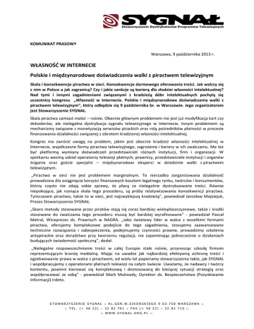 KOMUNIKAT PRASOWY Warszawa, 9 października 2013 r. WŁASNOŚĆ W INTERNECIE Polskie i międzynarodowe doświadczenia walki z piractwem telewizyjnym Skala i konsekwencje piractwa w sieci. Konsekwencje darmowego oferowania treści. Jak walczy się z nim w Polsce a jak zagranicą? Czy i jakie sankcje są barierą dla złodziei własności intelektualnej? Nad tymi i innymi zagadnieniami związanymi z kradzieżą dóbr intelektualnych pochylą się uczestnicy kongresu „Własność w Internecie. Polskie i międzynarodowe doświadczenia walki z piractwem telewizyjnym”, który odbędzie się 9 października br. w Warszawie. Jego organizatorem jest Stowarzyszenie SYGNAŁ. Skala piractwa zamiast maleć – rośnie. Obecnie głównym problemem nie jest już modyfikacja kart czy dekoderów, ale nielegalna dystrybucja sygnału telewizyjnego w Internecie. Innym problemem są mechanizmy związane z monetyzacją serwisów pirackich oraz rolą pośredników płatności w procesie finansowania działalności związanej z obrotem kradzionej własności intelektualnej. Kongres ma zwrócić uwagę na problem, jakim jest obecnie kradzież własności intelektualnej w Internecie, współczesne formy piractwa telewizyjnego, zagrożenia i bariery w ich zwalczaniu. Ma też być platformą wymiany doświadczeń przedstawicieli różnych instytucji, firm i organizacji. W spotkaniu wezmą udział operatorzy telewizji płatnych, prawnicy, przedstawiciele instytucji i organów ścigania oraz goście specjalni – międzynarodowi eksperci w dziedzinie walki z piractwem telewizyjnym. „Piractwo w sieci nie jest problemem marginalnym. To nierzadko zorganizowana działalność prowadzona dla osiągnięcia korzyści finansowych kosztem legalnego rynku, twórców i konsumentów, którzy często nie zdają sobie sprawy, że płacą za nielegalnie dystrybuowane treści. Równie niepokojące, jak rosnąca skala tego procederu, są próby relatywizowania konsekwencji piractwa. Tymczasem piractwo, także to w sieci, jest najzwyklejszą kradzieżą”, powiedział Jarosław Mojsiejuk, Prezes Stowarzyszenia SYGNAŁ. „Skoro metody stosowane przez piratów stają się coraz bardziej wielopłaszczyznowe, także i środki stosowane do zwalczania tego procederu muszą być bardziej wyrafinowane” - powiedział Pascal Metral, Wiceprezes ds. Prawnych w NAGRA. „Jako światowy lider w walce z wszelkimi formami piractwa, oferujemy kompleksowe podejście do tego zagadnienia, stosujemy zaawansowane techniczne rozwiązania i zabezpieczenia, podejmujemy czynności prawne, prowadzimy szkolenia antypirackie oraz doradztwo przy tworzeniu regulacji, nie zapominając jednocześnie o działaniach budujących świadomość społeczną”, dodał. „Nielegalne rozpowszechnianie treści w całej Europie stale rośnie, przynosząc szkodę firmom reprezentującym branżę medialną. Mając na uwadze jak najbardziej efektywną ochronę treści i egzekwowanie prawa w walce z piractwem, od wielu lat popieramy stowarzyszenia takie, jak SYGNAŁ i współpracujemy z operatorami płatnych telewizji na całym świecie. Uważamy, że nadawcy i twórcy kontentu, powinni kierować się kompleksową i dostosowaną do bieżącej sytuacji strategią oraz współpracować ze sobą” - powiedział Mark Mulready, Dyrektor ds. Bezpieczeństwa (Pozyskiwanie Informacji) Irdeto. STOWARZYSZENIE SYGNAŁ □ AL.GEN.W.SIKORSKIEGO 9 02-758 WARSZAWA □ □ TEL. (+ 48 22) – 32 82 701 □ FAX (+ 48 22) – 32 82 710 □ □ WWW.SYGNAL.ORG.PL □ Program kongresu W programie konferencji znajdą się prezentacje dotyczące walki z piractwem telewizyjnym zagranicą (ABC pirackich strategii sharingu, Piractwo internetowe 2.0) i w Polsce (Piractwo telewizyjne z perspektywy informatyka, Zagrożenia dla własności intelektualnej w Internecie). Panel „Piractwo w Internecie: wyzwania dla branży mediów i twórców kultury” będzie poświęcony skali procederu, konsekwencjom ekonomicznym i stratom biznesu spowodowanym piractwem, problemowi darmowego oferowania treści w Internecie, aspektom prawnym i zagrożeniom wynikającym z transgraniczności zjawiska. Prelegenci i paneliści Gośćmi specjalnymi kongresu będą: Mark Mulready, Dyrektor ds. Bezpieczeństwa (Pozyskiwanie Informacji) Irdeto (Holandia) oraz Pascal Metral, Wiceprezes ds. Prawnych NAGRA (Szwajcaria), członek Komisji Wywiadowczej Europejskiego Stowarzyszenia na Rzecz Ochrony Kodowanych Treści i Usług (AEPOC/AAPA). W kongresie wezmą też udział przedstawiciele Ministerstwa Administracji i Cyfryzacji, Prokuratury Generalnej, MSW, Anti Piracy Protection, ZAIKS, Stowarzyszenia SYGNAŁ oraz IAB Polska. Patronat nad wydarzeniem objął Minister Kultury i Dziedzictwa Narodowego. *** Stowarzyszenie Dystrybutorów Programów Telewizyjnych SYGNAŁ SDPT SYGNAŁ, którego celem jest przeciwdziałanie kradzieży sygnału telewizyjnego, służy ochronie własności intelektualnej, tym samym praw nadawców, dystrybutorów, licencjodawców i konsumentów programów telewizyjnych. Powstało w 2001 roku. Obecnie należą do niego: telewizja nc+, Cyfrowy Polsat, HBO Polska, VIMN Polska, Orange Polska, UPC Polska, Lege Artis Service, Telewizja Polsat, Redefine, Nagravision, Irdeto, TVN, Kino Polska, FOX, Sony Spe, Discovery, Disney i BBC. Współpracuje z innymi organizacjami mającymi podobne cele, a także organami ścigania. Przez 12 lat działalności Stowarzyszenie przeprowadziło łącznie 250 szkoleń dla ponad 15 000 przedstawicieli organów ścigania. Wśród nich znalazły się szkolenia dla policjantów z Wydziałów do Walki z Przestępczością Gospodarczą, prokuratury oraz szkół policji. SYGNAŁ zrealizował do tej pory cztery kampanie edukacyjne budujące świadomość negatywnych skutków piractwa, przygotowuje raporty i stanowiska w sprawach dotyczących konieczności poszanowania własności intelektualnej. Kontakt Dorota Zawadzka, tel. 692 186 083, [email protected] STOWARZYSZENIE SYGNAŁ □ AL.GEN.