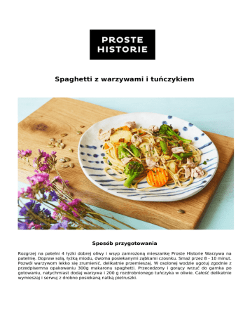 Spaghetti z warzywami i tuńczykiem Sposób przygotowania Rozgrzej na patelni 4 łyżki dobrej oliwy i wsyp zamrożoną mieszankę Proste Historie Warzywa na patelnię. Dopraw solą, łyżką miodu, dwoma posiekanymi ząbkami czosnku. Smaż przez 8 - 10 minut. Pozwól warzywom lekko się zrumienić, delikatnie przemieszaj. W osolonej wodzie ugotuj zgodnie z przedpisemna opakowaniu 300g makaronu spaghetti. Przecedzony i gorący wrzuć do garnka po gotowaniu, natychmiast dodaj warzywa i 200 g rozdrobnionego tuńczyka w oliwie. Całość delikatnie wymieszaj i serwuj z drobno posiekaną natką pietruszki. Zastosowany produkt WARZYWA NA PATELNIĘ klasyczne Powered by TCPDF (www.tcpdf.org)
