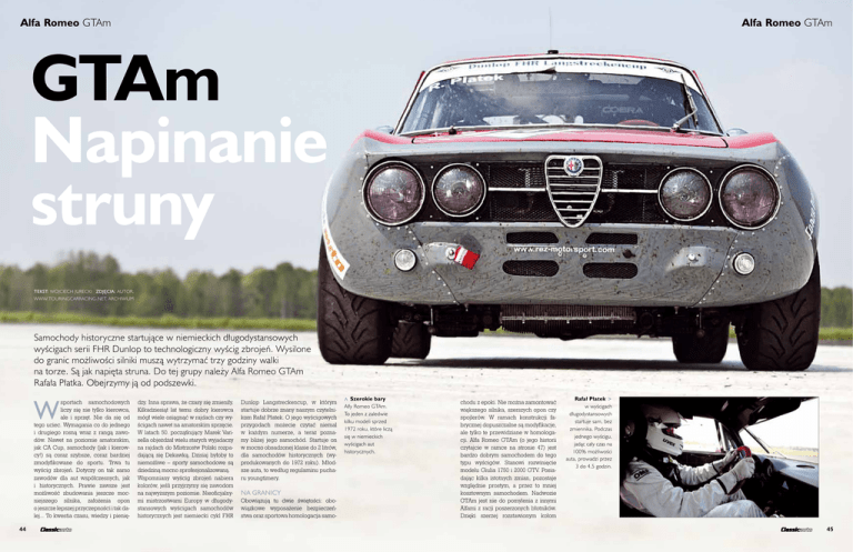 Alfa Romeo GTAm Alfa Romeo GTAm GTAm Napinanie struny TEKST: WOJCIECH JURECKI ZDJĘCIA: AUTOR, www.touringcarracing.net, archiwum Samochody historyczne startujące w niemieckich długodystansowych wyścigach serii FHR Dunlop to technologiczny wyścig zbrojeń. Wysilone do granic możliwości silniki muszą wytrzymać trzy godziny walki na torze. Są jak napięta struna. Do tej grupy należy Alfa Romeo GTAm Rafała Płatka. Obejrzymy ją od podszewki. W sportach samochodowych liczy się nie tylko kierowca, ale i sprzęt. Nie da się od tego uciec. Wymagania co do jednego i drugiego rosną wraz z rangą zawodów. Nawet na poziomie amatorskim, jak CA Cup, samochody (jak i kierowcy!) są coraz szybsze, coraz bardziej zmodyfikowane do sportu. Trwa tu wyścig zbrojeń. Dotyczy on tak samo zawodów dla aut współczesnych, jak i historycznych. Prawie zawsze jest możliwość zbudowania jeszcze mocniejszego silnika, założenia opon o jeszcze lepszej przyczepności i tak dalej... To kwestia czasu, wiedzy i pienię44 dzy. Inna sprawa, że czasy się zmieniły. Kilkadziesiąt lat temu dobry kierowca mógł wiele osiągnąć w rajdach czy wyścigach nawet na amatorskim sprzęcie. W latach 50. początkujący Marek Varisella objeżdżał wielu starych wyjadaczy na rajdach do Mistrzostw Polski rozpadającą się Dekawką. Dzisiaj byłoby to niemożliwe – sporty samochodowe są dziedziną mocno sprofesjonalizowaną. Wspomniany wyścig zbrojeń nabiera kolorów, jeśli przyjrzymy się zawodom na najwyższym poziomie. Nieoficjalnymi mistrzostwami Europy w długodystansowych wyścigach samochodów historycznych jest niemiecki cykl FHR Dunlop Langstreckencup, w którym startuje dobrze znany naszym czytelnikom Rafał Płatek. O jego wyścigowych przygodach możecie czytać niemal w każdym numerze, a teraz poznamy bliżej jego samochód. Startuje on w mocno obsadzonej klasie do 2 litrów, dla samochodów historycznych (wyprodukowanych do 1972 roku). Młodsze auta, to według regulaminu pucharu youngtimery. NA GRANICY Obowiązują tu dwie świętości: obowiązkowe wyposażenie bezpieczeństwa oraz sportowa homologacja samo- Szerokie bary Alfy Romeo GTAm. To jeden z zaledwie kilku modeli sprzed 1972 roku, które liczą się w niemieckich wyścigach aut historycznych. chodu z epoki. Nie można zamontować większego silnika, szerszych opon czy spojlerów. W ramach konstrukcji fabrycznej dopuszczalne są modyfikacje, ale tylko te przewidziane w homologacji. Alfa Romeo GTAm (o jego historii czytajcie w ramce na stronie 47) jest bardzo dobrym samochodem do tego typu wyścigów. Stanowi rozwinięcie modelu Giulia 1750 i 2000 GTV. Posiadając kilka istotnych zmian, pozostaje względnie prostym, a przez to mniej kosztownym samochodem. Nadwozie GTAm jest nie do pomylenia z innymi Alfami z racji poszerzonych błotników. Dzięki szerzej rozstawionym kołom Rafał Płatek > w wyścigach długodystansowych startuje sam, bez zmiennika. Podczas jednego wyścigu, jadąc cały czas na 100% możliwości auta, prowadzi przez 3 do 4,5 godzin. 45