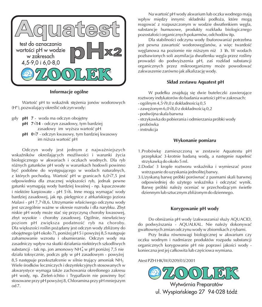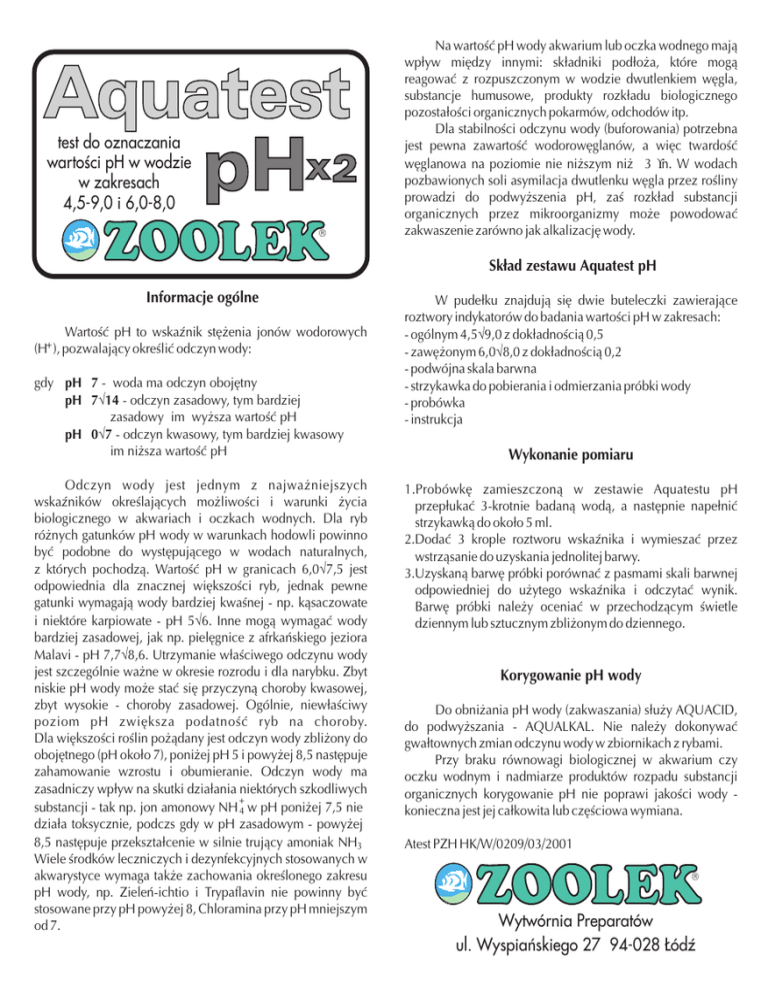 Aquatest pHx 2 test do oznaczania wartoœci pH w wodzie w zakresach 4,5-9,0 i 6,0-8,0 Na wartoœæ pH wody akwarium lub oczka wodnego maj¹ wp³yw miêdzy innymi: sk³adniki pod³o¿a, które mog¹ reagowaæ z rozpuszczonym w wodzie dwutlenkiem wêgla, substancje humusowe, produkty rozk³adu biologicznego pozosta³oœci organicznych pokarmów, odchodów itp. Dla stabilnoœci odczynu wody (buforowania) potrzebna jest pewna zawartoœæ wodorowêglanów, a wiêc twardoœæ wêglanowa na poziomie nie ni¿szym ni¿ 3 °n. W wodach pozbawionych soli asymilacja dwutlenku wêgla przez roœliny prowadzi do podwy¿szenia pH, zaœ rozk³ad substancji organicznych przez mikroorganizmy mo¿e powodowaæ zakwaszenie zarówno jak alkalizacjê wody. Sk³ad zestawu Aquatest pH Informacje ogólne Wartoœæ pH to wskaŸnik stê¿enia jonów wodorowych (H+ ), pozwalaj¹cy okreœliæ odczyn wody: gdy pH 7 - woda ma odczyn obojêtny pH 7÷14 - odczyn zasadowy, tym bardziej zasadowy im wy¿sza wartoœæ pH pH 0÷7 - odczyn kwasowy, tym bardziej kwasowy im ni¿sza wartoœæ pH Odczyn wody jest jednym z najwa¿niejszych wskaŸników okreœlaj¹cych mo¿liwoœci i warunki ¿ycia biologicznego w akwariach i oczkach wodnych. Dla ryb ró¿nych gatunków pH wody w warunkach hodowli powinno byæ podobne do wystêpuj¹cego w wodach naturalnych, z których pochodz¹. Wartoœæ pH w granicach 6,0÷7,5 jest odpowiednia dla znacznej wiêkszoœci ryb, jednak pewne gatunki wymagaj¹ wody bardziej kwaœnej - np. k¹saczowate i niektóre karpiowate - pH 5÷6. Inne mog¹ wymagaæ wody bardziej zasadowej, jak np. pielêgnice z afrkañskiego jeziora Malavi - pH 7,7÷8,6. Utrzymanie w³aœciwego odczynu wody jest szczególnie wa¿ne w okresie rozrodu i dla narybku. Zbyt niskie pH wody mo¿e staæ siê przyczyn¹ choroby kwasowej, zbyt wysokie - choroby zasadowej. Ogólnie, niew³aœciwy poziom pH zwiêksza podatnoœæ ryb na choroby. Dla wiêkszoœci roœlin po¿¹dany jest odczyn wody zbli¿ony do obojêtnego (pH oko³o 7), poni¿ej pH 5 i powy¿ej 8,5 nastêpuje zahamowanie wzrostu i obumieranie. Odczyn wody ma zasadniczy wp³yw na skutki dzia³ania niektórych szkodliwych substancji - tak np. jon amonowy NH A w pH poni¿ej 7,5 nie dzia³a toksycznie, podczs gdy w pH zasadowym - powy¿ej 8,5 nastêpuje przekszta³cenie w silnie truj¹cy amoniak NHF Wiele œrodków leczniczych i dezynfekcyjnych stosowanych w akwarystyce wymaga tak¿e zachowania okreœlonego zakresu pH wody, np. Zieleñ-ichtio i Trypaflavin nie powinny byæ stosowane przy pH powy¿ej 8, Chloramina przy pH mniejszym od 7. W pude³ku znajduj¹ siê dwie buteleczki zawieraj¹ce roztwory indykatorów do badania wartoœci pH w zakresach: - ogólnym 4,5÷9,0 z dok³adnoœci¹ 0,5 - zawê¿onym 6,0÷8,0 z dok³adnoœci¹ 0,2 - podwójna skala barwna - strzykawka do pobierania i odmierzania próbki wody - probówka - instrukcja Wykonanie pomiaru 1.Probówkê zamieszczon¹ w zestawie Aquatestu pH przep³ukaæ 3-krotnie badan¹ wod¹, a nastêpnie nape³niæ strzykawk¹ do oko³o 5 ml. 2.Dodaæ 3 krople roztworu wskaŸnika i wymieszaæ przez wstrz¹sanie do uzyskania jednolitej barwy. 3.Uzyskan¹ barwê próbki porównaæ z pasmami skali barwnej odpowiedniej do u¿ytego wskaŸnika i odczytaæ wynik. Barwê próbki nale¿y oceniaæ w przechodz¹cym œwietle dziennym lub sztucznym zbli¿onym do dziennego. Korygowanie pH wody Do obni¿ania pH wody (zakwaszania) s³u¿y AQUACID, do podwy¿szania - AQUALKAL. Nie nale¿y dokonywaæ gwa³townych zmian odczynu wody w zbiornikach z rybami. Przy braku równowagi biologicznej w akwarium czy oczku wodnym i nadmiarze produktów rozpadu substancji organicznych korygowanie pH nie poprawi jakoœci wody konieczna jest jej ca³kowita lub czêœciowa wymiana. Atest PZH HK/W/0209/03/2001 Wytwórnia Preparatów ul. Wyspiañskiego 27 94-028 £ódŸ