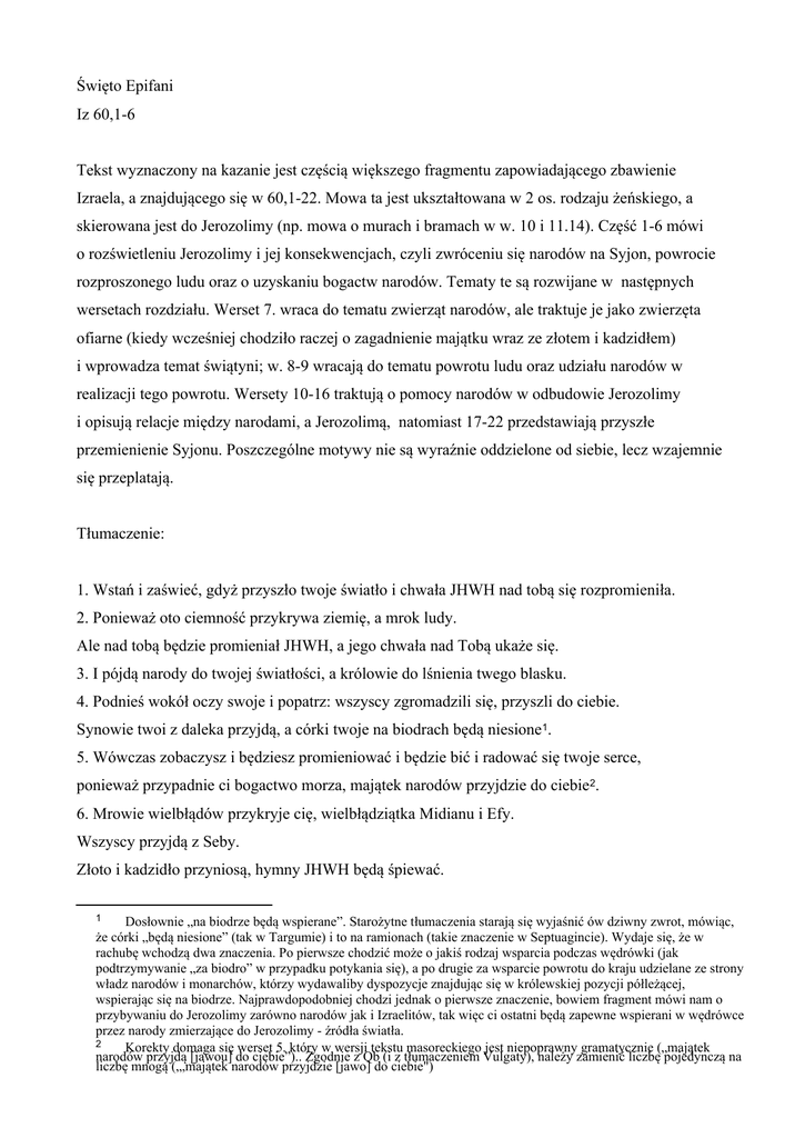 Święto Epifani Iz 60,1-6 Tekst wyznaczony na kazanie jest częścią większego fragmentu zapowiadającego zbawienie Izraela, a znajdującego się w 60,1-22. Mowa ta jest ukształtowana w 2 os. rodzaju żeńskiego, a skierowana jest do Jerozolimy (np. mowa o murach i bramach w w. 10 i 11.14). Część 1-6 mówi o rozświetleniu Jerozolimy i jej konsekwencjach, czyli zwróceniu się narodów na Syjon, powrocie rozproszonego ludu oraz o uzyskaniu bogactw narodów. Tematy te są rozwijane w następnych wersetach rozdziału. Werset 7. wraca do tematu zwierząt narodów, ale traktuje je jako zwierzęta ofiarne (kiedy wcześniej chodziło raczej o zagadnienie majątku wraz ze złotem i kadzidłem) i wprowadza temat świątyni; w. 8-9 wracają do tematu powrotu ludu oraz udziału narodów w realizacji tego powrotu. Wersety 10-16 traktują o pomocy narodów w odbudowie Jerozolimy i opisują relacje między narodami, a Jerozolimą, natomiast 17-22 przedstawiają przyszłe przemienienie Syjonu. Poszczególne motywy nie są wyraźnie oddzielone od siebie, lecz wzajemnie się przeplatają. Tłumaczenie: 1. Wstań i zaświeć, gdyż przyszło twoje światło i chwała JHWH nad tobą się rozpromieniła. 2. Ponieważ oto ciemność przykrywa ziemię, a mrok ludy. Ale nad tobą będzie promieniał JHWH, a jego chwała nad Tobą ukaże się. 3. I pójdą narody do twojej światłości, a królowie do lśnienia twego blasku. 4. Podnieś wokół oczy swoje i popatrz: wszyscy zgromadzili się, przyszli do ciebie. Synowie twoi z daleka przyjdą, a córki twoje na biodrach będą niesione1. 5. Wówczas zobaczysz i będziesz promieniować i będzie bić i radować się twoje serce, ponieważ przypadnie ci bogactwo morza, majątek narodów przyjdzie do ciebie2. 6. Mrowie wielbłądów przykryje cię, wielbłądziątka Midianu i Efy. Wszyscy przyjdą z Seby. Złoto i kadzidło przyniosą, hymny JHWH będą śpiewać. 1 Dosłownie „na biodrze będą wspierane”. Starożytne tłumaczenia starają się wyjaśnić ów dziwny zwrot, mówiąc, że córki „będą niesione” (tak w Targumie) i to na ramionach (takie znaczenie w Septuagincie). Wydaje się, że w rachubę wchodzą dwa znaczenia. Po pierwsze chodzić może o jakiś rodzaj wsparcia podczas wędrówki (jak podtrzymywanie „za biodro” w przypadku potykania się), a po drugie za wsparcie powrotu do kraju udzielane ze strony władz narodów i monarchów, którzy wydawaliby dyspozycje znajdując się w królewskiej pozycji półleżącej, wspierając się na biodrze. Najprawdopodobniej chodzi jednak o pierwsze znaczenie, bowiem fragment mówi nam o przybywaniu do Jerozolimy zarówno narodów jak i Izraelitów, tak więc ci ostatni będą zapewne wspierani w wędrówce przez narody zmierzające do Jerozolimy - źródła światła. 2 Korekty domaga się werset 5. który w wersji tekstu masoreckiego jest niepoprawny gramatycznie („majątek narodów przyjdą [jawou] do ciebie”).. Zgodnie z Qb (i z tłumaczeniem Vulgaty), należy zamienić liczbę pojedynczą na liczbę mnogą („,majątek narodów przyjdzie [jawo] do ciebie") Werset 1. stanowi wstęp wprowadzając temat światłości Jerozolimy i chwały JHWH. Werset 2. przeciwstawia światłość Izraela ciemności, w której tkwią narody. Owa ciemność nad narodami będzie prowadzić je do zwrócenia się w kierunku rozświetlonej Jerozolimy, o czym mówi w. 3. W. 4. traktuje o powrocie i zgromadzeniu ludu z diaspory, natomiast wersety 5 i 6 mówią o bogactwie narodów, które ma się stać udziałem Jerozolimy, co skutkować ma radością (w. 5a) oraz wychwalaniem JHWH (w. 6b). W wersecie 1 znajduje się zaadresowanie w 2 os. sg fem. skierowane do Syjonu rozpoczynające się od wezwania „powstań” (hebr. kumi). Jest to typowe zawołanie Boga kierowane do ludu w Księdze Izajasza (51,17; 52,2; 59). Możliwe, że mamy tu do czynienia z aluzją do wypowiedzi, wedle których lud pogrążony jest mroku, w którym się potyka (Iz 59,10). Syjon wzywany jest następnie do rozświecenia się. Metafora światła jest częsta w Księdze Izajasza i w Starym Testamencie. Światło kojarzy się ze szczęściem, ratunkiem, podobnie jak przejście z ciemności w światłość oznaczać może wyzwolenie ze stanu udręki (por. Iz 9,1). Światło kojarzone jest z Bogiem i jego zbawczym działaniem (np. Ps 27,1). W Iz 60,1 rozświetlenie Syjonu nie jest własną zasługą Jerozolimy, ale wyłącznym dziełem Boga, bowiem objawić ma się Boża chwała (hebr. kawod). W Księdze Izajasza pojęcie chwały Bożej asocjowane jest z Bożym zbawieniem Izraela, a także narodów (Iz 24,23; 40,5; 66,18nn). Jest to również techniczny termin kapłański, ponieważ najpierw przybytek, a następnie świątynia były szczególnymi miejscami objawienia się chwały Bożej. Chwała JHWH jest Bożym majestatem, sposobem, w jaki Bóg objawia się ludziom (np. Ez 1,28; 3,23; 8,4). Pojęcie ma również znaczenie dynamiczne, oznacza Boże działanie (Iz 40,5; 42,8; 43,7). Związane jest ono także z wyobrażeniami dotyczącymi teofanii, która skutkować ma przemianą całego świata (np. Ag 2,6-9). Iz 60,1 nie konkretyzuje, jakie zmiany powodować będzie objawienie się Bożej chwały. Ważne jest, że dotyczyć będzie Jerozolimy/Syjonu i będzie mieć pozytywne skutki dla narodów. Werset 2. przeciwstawia światło objawionej chwały, ciemności w której tkwią narody. Stanowi więc on zarazem uzasadnienie wersetów następnych. Dlatego, że chwała JHWH ukaże się na Syjonie, co będzie widoczne dla wszystkich (czas. raah w nifal), to narody zwrócą się w kierunku Jerozolimy. Owo zwrócenie się narodów będzie powiązane z zebraniem rozproszonych i powrotem na Syjon (w. 4), co stanie się przy pomocy i współudziale narodów. W wersecie 5.a znajduje się zapowiedź radości Jerozolimy, a w wersecie 5b mowa o przybyciu bogactwa narodów, werset 6. mówi natomiast o przybywaniu narodów do Jerozolimy. Midian to krain