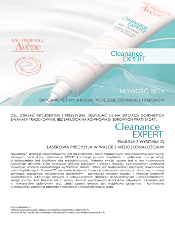 NOWOŚĆ 2014 ORYGINALNE I WYJĄTKOWE PODEJŚCIE DO WALKI Z TRĄDZIKIEM CEL: DZIAŁAĆ INTELIGENTNIE I PREZYZYJNIE, SKUPIAJĄC SIĘ NA STREFACH DOTKNIĘTYCH ZMIANAMI TRĄDZIKOWYMI, BEZ ZAKŁÓCANIA RÓWNOWAGI ZDROWYCH PARTII SKÓRY. EMULSJA Z WYSOKIM IQ LASEROWA PRECYZYJA W WALCE Z NIEDOSKONAŁOŚCIAMI Nowatorska strategia skoncentrowana jest na zwalczaniu zmian trądzikowych, bez zakłócania równowagi zdrowych partii skóry. Cleanance EXPERT kontroluje poziom nawilżenia i skutecznie matuje skórę, a jednocześnie jest bezlitosny dla niedoskonałości. Formuła emulsji oparta jest o trzy innowacyjne substancje aktywne, które zwalczają główne przyczyny i objawy trądziku. Monolaurynian skutecznie rozwiązuje problem nadmiernego wydzielania sebum, który jest bezpośrednią przyczyną powstawania zmian trądzikowych. X-pressin™, niezwykle skuteczna i wysoce tolerowana substancja złuszczająca nowej generacji, zapobiega powstawaniu zaskórników – pierwszego stadium trądziku. I wreszcie Diolényl®, opatentowana substancja aktywna o udowodnionym działaniu antybakteryjnym i przeciwzapalnym, swego rodzaju Koń Trojański na P. acnes. Arsenał wyjątkowych składników aktywnych, zamknięty jest w nowatorskim galenowym etui, dzięki czemu emulsja jest wyjątkowo przyjemna i komfortowa w stosowaniu, zapewnia optymalne nawilżenie i doskonale matuje skórę. WIĘCEJ INFORMACJI: PRODUCT MANAGER AVENE: [email protected] AGENCJA PR PLATINIUM CAST: [email protected]/ [email protected] CLEANANCE EXPERT – SKŁADNIKI AKTYWNE: 1. DIOLENYL®: DZIAŁANIE ANTYBAKTERYJNE I PRZECIWZAPALNE INNOWACJA PIERRE FABRE DIOLENYL® - KOŃ TROJAŃSKI W WALCE Z BAKTERIAMI P. ACNES Pojawienie się zmian trądzikowych jest uwarunkowane intensywną reakcją zapalną w mieszkach włosowo-łojowych, w których zbyt obficie namnożyły się naturalnie występujące na skórze beztlenowe bakterie P. Acnes. Bakterie te, by móc się rozwijać wykorzystują obecne w sebum lipidy, w postaci trójglicerydów. Przy pomocy lipazy rozkładają trójglicerydy przecinając ich cząsteczkę w ściśle określonym miejscu - na kwasy tłuszczowe i glicerol, a następnie wykorzystują glicerol jest źródłem energii do namnażania. Pierre Fabre opracował innowacyjną substancję czynną Diolényl®, która budową imituje cząsteczkę trójglicerydu - ma to samo miejsce przecięcia. Taka budowa to pułapka na P.acnes – pozwala oszukać bakterie, które rozkładając Diolényl® nie otrzymują niezbędnego do rozwoju glicerolu, a powodują uwolnienie substancji przeciwbakteryjnej (Oktanodiolu) oraz przeciwzapalnej (kwasu -linolenowego). Co więcej, to same bakterie aktywują Diolényl-u® - precyzyjnie wskazują miejsca, gdzie działanie składników przeciwtrądzikowych jest pożądane. Ilość bakterii w danym mieszku włosowym determinuje także stężenie tych składników. Cel marki Avène, czyli opracowanie substancji aktywnej działającej precyzyjnie - wyłącznie na mieszki włosowo-łojowe dotknięte stanem zapalnym oraz w ilości dostosowanej do stopnia zaawansowania zmian skórnych został osiągnięty. DIOLENYL® działa inteligentnie – skupia aktywność na strefach dotkniętych zmianami i nie zakłóca równowagi zdrowych partii skóry. 2. MONOLAURYNIAN: DZIAŁANIE SEBOREGULUJĄCE MONOLAURYNIAN SKUTECZNIE ROZWIĄZUJE PROBLEM NADMIERNEGO WYDZIELANIA SEBUM, KTÓRY JEST BEZPOŚREDNIĄ PRZYCZYNĄ POWSTAWANIA ZMIAN TRĄDZIKOWYCH. Bakterie Propionibacterium acnes mają bezpośredni wpływ na wzrost produkcji sebum. Sebum zaś stymuluje namnażanie bakterii. Proces ten zatacza więc BŁĘDNE KOŁO, dla którego rozwiązaniem jest opracowany w Laboratoriach Dermatologicznych Pierre Fabre Monolaurynian, kompleksowo działający na przyczyny powstawania łojotoku: Blokuje aktywność enzymu 5-α-reduktazy – kluczowego enzymu w problemie nadprodukcji sebum Hamuje produkcję lipidów przez sebocyty aż o 68% 3. X-PRESSINTM: DZIAŁANIE ZŁUSZCZAJĄCE X-PRESSINTM TO DOSKONALE TOLEROWANA I SKUTECZNA SUBSTANCJA ZŁUSZCZAJĄCA NOWEJ GENERACJI WIĘCEJ INFORMACJI: PRODUCT MANAGER AVENE: [email protected] AGENCJA PR PLATINIUM CAST: [email protected]/ [email protected] Zaburzenia naturalnego procesu złuszczania są główną przyczyną powstawania zaskórników – pierwszego stadium trądziku. X-PressinTM stanowi nowatorskie rozwiązanie pozwalające pobudzić procesy złuszczania w skuteczny, a zarazem łagodny sposób. X-PressinTM naśladuje funkcjonowanie proteaz, czyli naturalnych enzymów, które niszcząc wiązania proteinowe łączące martwe komórki, umożliwiają złuszczanie. Jego skuteczność jest równoważna z działaniem kwasów AHA i BHA, przy niższych stężeniach i z zachowaniem fizjologicznego pH, co sprawia, że jest wyjątkowo dobrze tolerowany. FORMA GALENOWA I WŁAŚCIWOŚCI KOSMETYCZNE Konsystencja emulsji w pierwszym kontakcie jest zarazem lekka i kremowa. Podczas aplikacji sprawia wrażenie silikonowej, idealnie stapia się ze skórą. Szybko i dokładnie się wchłania, pozostawiając skórę aksamitną i matową - bez tłustej czy lepkiej warstwy. Zapewnia uczucie komfortu i świeżości. Glikole zapewniają długotrwale nawilżenie. Woda Termalna Avène koi i łagodzi podrażnienia. Kompozycja wyselekcjonowanych emolientów determinuje wyjątkową przyjemność stosowania, ochronę oraz komfort. Mikrokapsułki pochłaniające nadmiar sebum zapewniają długotrwały efekt zmatowienia. Emulsja jest idealną bazą pod makijaż. JAK STOSOWAĆ? Nakładać rano i/lub wieczorem na skórę twarzy, wcześniej oczyszczoną przy użyciu odpowiedniego produktu myjącego z linii Cleanance. Cleanance EXPERT może być stosowany samodzielnie lub w połączeniu z przeciwtrądzikowymi lekami miejscowymi. WIĘCEJ INFORMACJI: PRODUCT MANAGER AVENE: [email protected] AGENCJA PR PLATINIUM CAST: [email protected]/ [email protected]