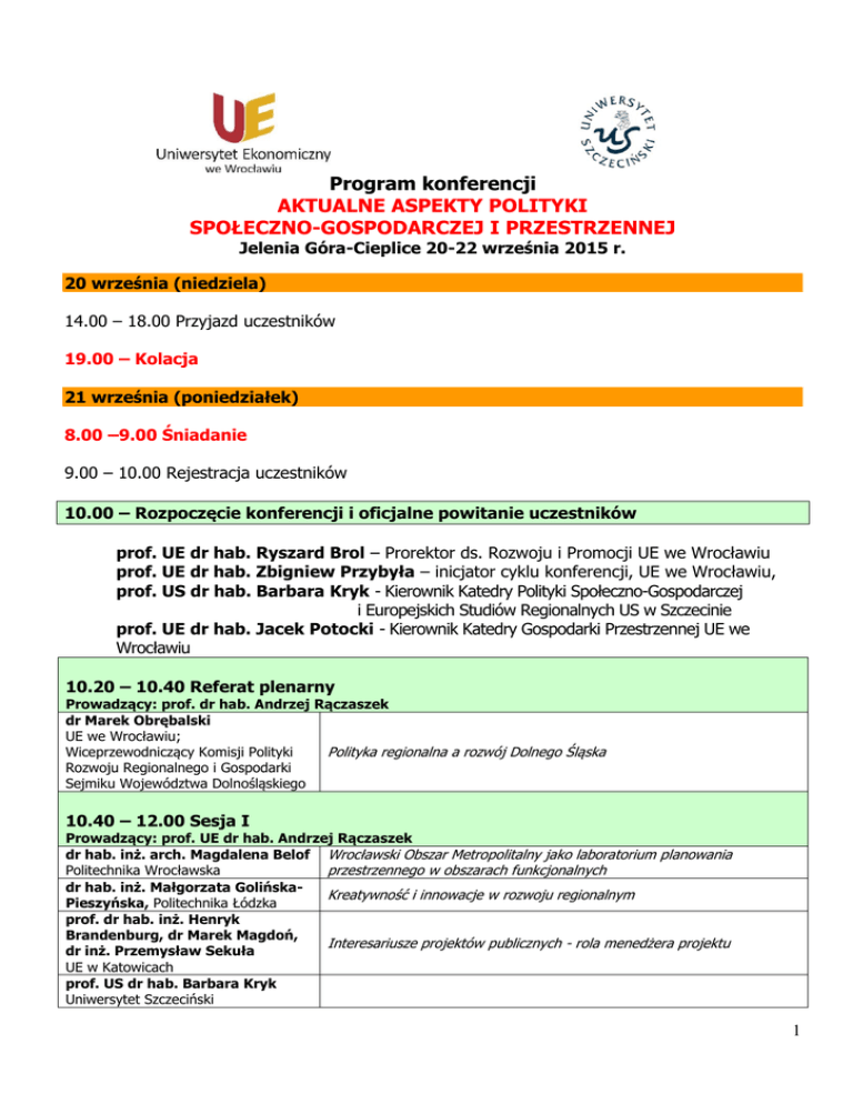 Program konferencji AKTUALNE ASPEKTY POLITYKI SPOŁECZNO-GOSPODARCZEJ I PRZESTRZENNEJ Jelenia Góra-Cieplice 20-22 września 2015 r. 20 września (niedziela) 14.00 – 18.00 Przyjazd uczestników 19.00 – Kolacja 21 września (poniedziałek) 8.00 –9.00 Śniadanie 9.00 – 10.00 Rejestracja uczestników 10.00 – Rozpoczęcie konferencji i oficjalne powitanie uczestników prof. UE dr hab. Ryszard Brol – Prorektor ds. Rozwoju i Promocji UE we Wrocławiu prof. UE dr hab. Zbigniew Przybyła – inicjator cyklu konferencji, UE we Wrocławiu, prof. US dr hab. Barbara Kryk - Kierownik Katedry Polityki Społeczno-Gospodarczej i Europejskich Studiów Regionalnych US w Szczecinie prof. UE dr hab. Jacek Potocki - Kierownik Katedry Gospodarki Przestrzennej UE we Wrocławiu 10.20 – 10.40 Referat plenarny Prowadzący: prof. dr hab. Andrzej Rączaszek dr Marek Obrębalski UE we Wrocławiu; Wiceprzewodniczący Komisji Polityki Polityka regionalna a rozwój Dolnego Śląska Rozwoju Regionalnego i Gospodarki Sejmiku Województwa Dolnośląskiego 10.40 – 12.00 Sesja I Prowadzący: prof. UE dr hab. Andrzej Rączaszek dr hab. inż. arch. Magdalena Belof Wrocławski Obszar Metropolitalny jako laboratorium planowania Politechnika Wrocławska przestrzennego w obszarach funkcjonalnych dr hab. inż. Małgorzata GolińskaKreatywność i innowacje w rozwoju regionalnym Pieszyńska, Politechnika Łódzka prof. dr hab. inż. Henryk Brandenburg, dr Marek Magdoń, Interesariusze projektów publicznych - rola menedżera projektu dr inż. Przemysław Sekuła UE w Katowicach prof. US dr hab. Barbara Kryk Uniwersytet Szczeciński 1 12.00 – 12.30 Przerwa kawowa 12.30 – 14.00 Sesja II Prowadzący: prof. US dr hab. Barbara Kryk dr Dariusz Klimek Wpływ imigracji zarobkowej do Polski na rozwój gospodarczy regionów Politechnika Łódzka dr inż. Jerzy Ładysz Uwarunkowania demograficzne planowania usług podstawowych i UE we Wrocławiu podstawowych centrotwórczych w obrębach powiatu wrocławskiego dr Zbigniew Piepiora Przeciwdziałanie skutkom klęsk żywiołowych w województwie lubelskim UP we Wrocławiu prof. UE dr hab. Jacek Potocki Tendencje zmian ludności w dawnych miastach wojewódzkich od 1999 do UE we Wrocławiu 2014 r. dr Arkadiusz Babczuk Aspekty finansowe marginalizacji byłych miast wojewódzkich UE we Wrocławiu 14.00 – 15.00 Obiad 15.00 – 17.30 Spacer do Muzeum Przyrodniczego w Jeleniej Górze-Cieplicach Prowadzący: prof. UE dr hab. Jacek Potocki (przewodnik sudecki, członek Zarządu Głównego PTTK), mgr Stanisław Firszt (dyrektor Muzeum Przyrodniczego w Jeleniej Górze) 17.30 – 18.00 Przerwa kawowa i sesja posterowa 17.30 – 18.00 Sesja posterowa (w trakcie przerwy na kawę) dr hab. inż. arch. Eleonora GondaSoroczyńska, UP we Wrocławiu prof. UE dr hab. Zbigniew Przybyła, UE we Wrocławiu, dr Katarzyna Przybyła UP we Wrocławiu dr Katarzyna Przybyła UP we Wrocławiu dr Alina Kulczyk-Dynowska UE we Wrocławiu dr inż. Jerzy Ładysz UE we Wrocławiu Klaster polski Radon elementem innowacyjnej współpracy na rzecz rozwoju turystyki uzdrowiskowej w województwie dolnośląskim Euroregiony jako kategoria historyczna Wpływ KSSEMP na rozwój Jeleniej Góry i wybranych gmin powiatu jeleniogórskiego Przestrzenne i finansowe aspekty obszaru chronionego na przykładzie Wolińskiego Parku Narodowego Metoda ankietowa planowania partycypacyjnego w polityce przestrzennej 19.00 – Uroczysta kolacja 2 22 września (wtorek) 8.00 – 9.30 Śniadanie 9.30 – 11.00 Sesja III Prowadzący: dr hab. inż. arch. Magdalena Belof prof. UE dr hab. Marian Kachniarz mgr Kacper Siwek UE we Wrocławiu dr Bartosz Bartosiewicz Uniwersytet Łódzki dr Marcin Feltynowski Uniwersytet Łódzki dr Beata Wieteska-Rosiak Uniwersytet Łódzki dr Lidia Kłos Uniwersytet Szczeciński Wydajność pracy w samorządzie terytorialnym Polityka przestrzenna na szczeblu lokalnym a proces kurczenia się małych miast Unsustainable land use planning - an example of gminas in Central region Kierunki rozwoju transportu zrównoważonego w miastach w kontekście zmian klimatu Rzeczowo-ekologiczne efekty realizacji Krajowego Programu Oczyszczania Ścieków Komunalnych 11.00-11.30 Przerwa kawowa 11.30 – 13.00 Sesja doktorancka Prowadzący: prof. dr hab. inż. Henryk Brandenburg mgr Zbigniew Forycki UE we Wrocławiu mgr Krzysztof Krzyżak UE we Wrocławiu mgr Ewa Gralik-Żmudzińska UE we Wrocławiu mgr Kacper Siwek UE we Wrocławiu mgr Olimpia Stanaszek UE we Wrocławiu Metody pomiaru efektywności projektów innowacyjnych Dysfunkcje w wykonywaniu usług publicznych - przykład budowy i eksploatacji oświetlenia miejsc publicznych Przekształcenie samodzielnego publicznego zespołu opieki zdrowotnej w procesie decyzyjnym organów władzy powiatu jeleniogórskiego Aglomeracja wałbrzyska w świetle teorii sieci – wybrane zagadnienia Wpływ zmian w zagospodarowaniu przestrzennym terenów o wysokiej wartości krajobrazowej na jakość życia 13.00 – 13.30 Podsumowanie konferencji prof. UE dr hab. Zbigniew Przybyła – Katedra Gospodarki Przestrzennej UE we Wrocławiu 14.00 – 15.00 Obiad 15.00 - Wyjazd uczestników 3