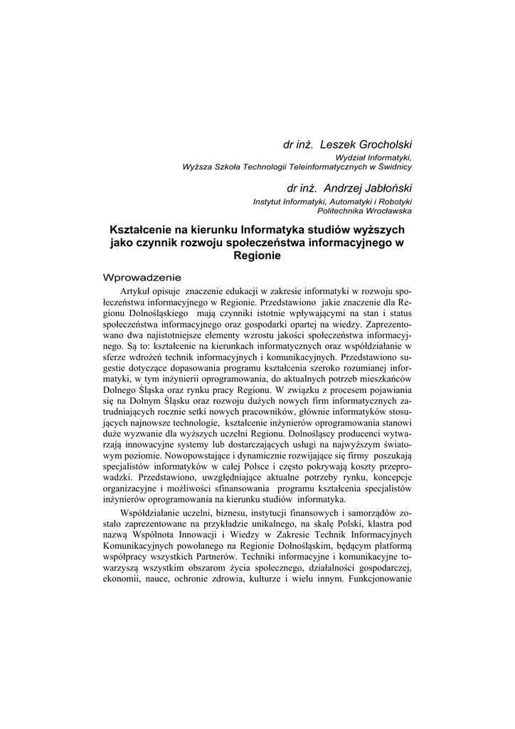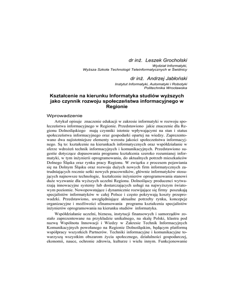 dr inż. Leszek Grocholski Wydział Informatyki, Wyższa Szkoła Technologii Teleinformatycznych w Świdnicy dr inż. Andrzej Jabłoński Instytut Informatyki, Automatyki i Robotyki Politechnika Wrocławska Kształcenie na kierunku Informatyka studiów wyższych jako czynnik rozwoju społeczeństwa informacyjnego w Regionie Wprowadzenie Artykuł opisuje znaczenie edukacji w zakresie informatyki w rozwoju społeczeństwa informacyjnego w Regionie. Przedstawiono jakie znaczenie dla Regionu Dolnośląskiego mają czynniki istotnie wpływającymi na stan i status społeczeństwa informacyjnego oraz gospodarki opartej na wiedzy. Zaprezentowano dwa najistotniejsze elementy wzrostu jakości społeczeństwa informacyjnego. Są to: kształcenie na kierunkach informatycznych oraz współdziałanie w sferze wdrożeń technik informacyjnych i komunikacyjnych. Przedstawiono sugestie dotyczące dopasowania programu kształcenia szeroko rozumianej informatyki, w tym inżynierii oprogramowania, do aktualnych potrzeb mieszkańców Dolnego Śląska oraz rynku pracy Regionu. W związku z procesem pojawiania się na Dolnym Śląsku oraz rozwoju dużych nowych firm informatycznych zatrudniających rocznie setki nowych pracowników, głównie informatyków stosujących najnowsze technologie, kształcenie inżynierów oprogramowania stanowi duże wyzwanie dla wyższych uczelni Regionu. Dolnośląscy producenci wytwarzają innowacyjne systemy lub dostarczających usługi na najwyższym światowym poziomie. Nowopowstające i dynamicznie rozwijające się firmy poszukają specjalistów informatyków w całej Polsce i często pokrywają koszty przeprowadzki. Przedstawiono, uwzględniające aktualne potrzeby rynku, koncepcje organizacyjne i możliwości sfinansowania programu kształcenia specjalistów inżynierów oprogramowania na kierunku studiów informatyka. Współdziałanie uczelni, biznesu, instytucji finansowych i samorządów zostało zaprezentowane na przykładzie unikalnego, na skalę Polski, klastra pod nazwą Wspólnota Innowacji i Wiedzy w Zakresie Technik Informacyjnych Komunikacyjnych powołanego na Regionie Dolnośląskim, będącym platformą współpracy wszystkich Partnerów. Techniki informacyjne i komunikacyjne towarzyszą wszystkim obszarom życia społecznego, działalności gospodarczej, ekonomii, nauce, ochronie zdrowia, kulturze i wielu innym. Funkcjonowanie 2 społeczeństwa informacyjnego i gospodarki opartej na wiedzy stało się faktem bezspornym. Było to możliwe poprzez nieustanny rozwój i wdrażanie innowacyjnych technologii we wszystkich możliwych dziedzinach. Dzięki znaczącemu potencjałowi Dolnego Śląska, Region stał się dominującym w Polsce obszarem wiedzy i innowacji w dziedzinie technologii informacyjnych i komunikacyjnych. Istniejąca i nieustannie rozwijana infrastruktura informatyczna i edukacyjna stwarza atrakcyjną platformę dla wprowadzenia innowacyjnych rozwiązań w każdej sferze życia gospodarczego i społecznego. Artykuł przedstawia szerszy punkt widzenia na powyższe kwestie. Inżynieria oprogramowania Produkcja i eksploatacja systemów teleinformatycznych są coraz bardziej skomplikowane. Śledzenie potrzeb rynku pracy wykazuje w całym świecie malejące zapotrzebowanie na specjalistów w wąskiej dziedzinie np. programistów. Firmy poszukują obecnie specjalistów informatyków potrafiących zapewnić zarówno wytwarzanie nowych oraz modyfikacje, wdrażanie i eksploatacje istniejących systemów tzw. inżynierów oprogramowania. W artykule ograniczono się do zilustrowania znaczenia kształcenia inżynierów oprogramowania jako czynnika rozwoju społeczeństwa informacyjnego w Regionie. Inżynieria oprogramowania jest młodą liczącą 40 lat dyscypliną techniczną odgrywającą obecnie podstawową rolę w funkcjonowaniu i rozwoju społeczeństwa informacyjnego. Powstawanie i stosowanie nowych technologii, zapotrzebowanie w krajach wysokiej cywilizacji na specjalistów z tej dziedziny, a także ciągłe tworzenie nowych firm oraz rozwój istniejących firm sektora IT w Regionie Dolny Śląsk powoduje stale niedobory odpowiednio przygotowanych kadr. Minister Nauki i Szkolnictwa Wyższego określił w załączniku do Zarządzenia z dnia 12 lipca 2007 r. [8] konieczność zaliczenia przez absolwenta kierunku informatyka przedmiotu „inżynieria oprogramowania” na studiach I stopnia. Na studiach II stopnia Minister zostawia uczelniom dużą swobodę w określeniu przedmiotów wymaganych do ukończenia studiów. Programów nauczania przedmiotów Minister nie określa. Daje to możliwość elastycznego definiowania zakresu kształcenia tak, aby spełniał on zapotrzebowanie rynku. W artykule zaproponowano podejście umożliwiające elastyczne dostosowywanie, sfinansowanie z zewnątrz, studiów na kierunku informatyka, które pozwoliłoby na dopasowywanie programów do potrzeb pracodawców. Pojęcie „inżynieria oprogramowania” pierwszy raz użyto na konferencji zorganizowanej przez NATO 40 lat temu. W 2004 r. IEEE Computer Society (Institute of Electrical and Electronics Engineers) [13] i ACM (Association for Computing Machinery) [14] zdefiniowały w SWEBOK ver. 1.0 – Guide to the Software Engineering Body of Knowledge [7] obszar i podobszary wiedzy inżynierii oprogramowania. 3 Inżynierię oprogramowania zdefiniowano jako: 1. Zastosowanie systematycznych, zdyscyplinowanych możliwych do ilościowej oceny podejść do wytwarzania, działania i pielęgnacji oprogramowania, tzn. zastosowania inżynierii do oprogramowania. 2. Badania nad podejściami wymienionymi w pkt. 1. SWEBOK jako kompendium wiedzy o inżynierii oprogramowania: 1. Zdefiniował podstawowe zakresy wiedzy i rekomendowane zasady działania ( recommended practice ). 2. Określił podstawowe programy edukacyjne ( educational curricula) dla szkół zawodowych i wyższych. W dodatku „D” SWEBOK, na podstawie taksonomii Blooma, podaje dla każdej dyscypliny inżynierii oprogramowa
