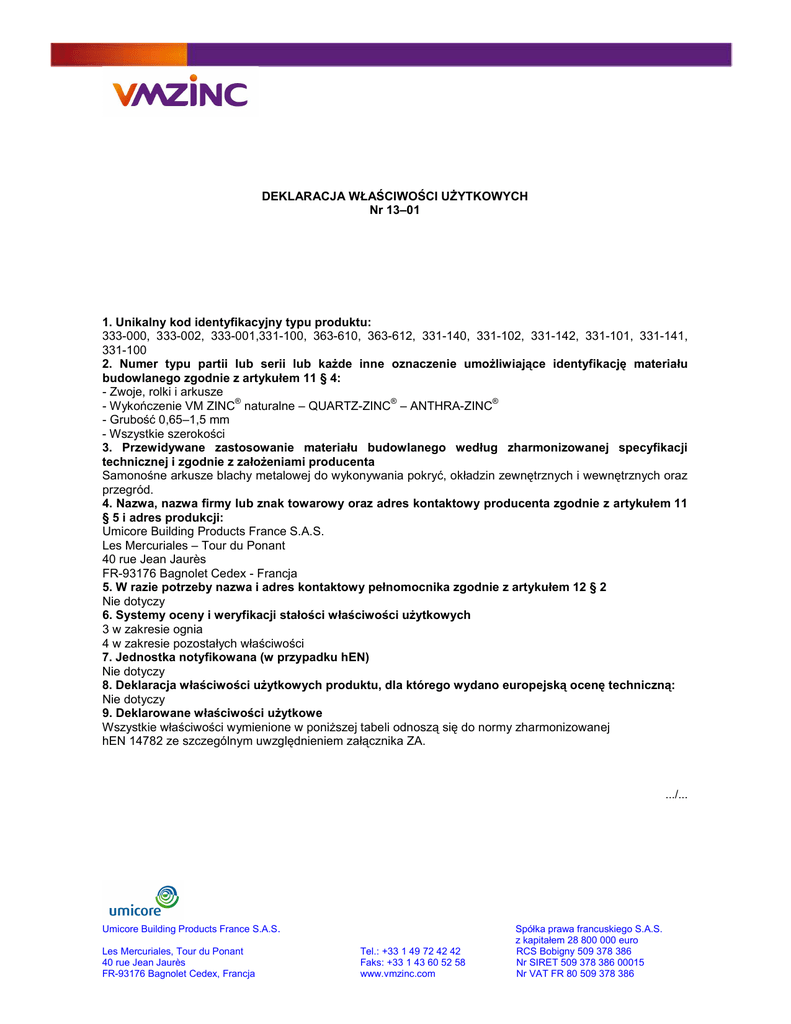 DEKLARACJA WŁAŚCIWOŚCI UŻYTKOWYCH Nr 13–01 1. Unikalny kod identyfikacyjny typu produktu: 333-000, 333-002, 333-001,331-100, 363-610, 363-612, 331-140, 331-102, 331-142, 331-101, 331-141, 331-100 2. Numer typu partii lub serii lub każde inne oznaczenie umożliwiające identyfikację materiału budowlanego zgodnie z artykułem 11 § 4: - Zwoje, rolki i arkusze - Wykończenie VM ZINC® naturalne – QUARTZ-ZINC® – ANTHRA-ZINC® - Grubość 0,65–1,5 mm - Wszystkie szerokości 3. Przewidywane zastosowanie materiału budowlanego według zharmonizowanej specyfikacji technicznej i zgodnie z założeniami producenta Samonośne arkusze blachy metalowej do wykonywania pokryć, okładzin zewnętrznych i wewnętrznych oraz przegród. 4. Nazwa, nazwa firmy lub znak towarowy oraz adres kontaktowy producenta zgodnie z artykułem 11 § 5 i adres produkcji: Umicore Building Products France S.A.S. Les Mercuriales – Tour du Ponant 40 rue Jean Jaurès FR-93176 Bagnolet Cedex - Francja 5. W razie potrzeby nazwa i adres kontaktowy pełnomocnika zgodnie z artykułem 12 § 2 Nie dotyczy 6. Systemy oceny i weryfikacji stałości właściwości użytkowych 3 w zakresie ognia 4 w zakresie pozostałych właściwości 7. Jednostka notyfikowana (w przypadku hEN) Nie dotyczy 8. Deklaracja właściwości użytkowych produktu, dla którego wydano europejską ocenę techniczną: Nie dotyczy 9. Deklarowane właściwości użytkowe Wszystkie właściwości wymienione w poniższej tabeli odnoszą się do normy zharmonizowanej hEN 14782 ze szczególnym uwzględnieniem załącznika ZA. .../... Umicore Building Products France S.A.S. Les Mercuriales, Tour du Ponant 40 rue Jean Jaurès FR-93176 Bagnolet Cedex, Francja Tel.: +33 1 49 72 42 42 Faks: +33 1 43 60 52 58 www.vmzinc.com Spółka prawa francuskiego S.A.S. z kapitałem 28 800 000 euro RCS Bobigny 509 378 386 Nr SIRET 509 378 386 00015 Nr VAT FR 80 509 378 386 Właściwości podstawowe Właściwości użytkowe Wytrzymałość mechaniczna (obciążenie skupione 1,2 kN) Wodoprzepuszczalność Zróżnicowanie wymiarów Uwalnianie kontrolowanych substancji niebezpiecznych Reakcja na ogień nie ustalono Zadowalająca (a) 22 x 10–6 K–1 Zadowalające (a) Zharmonizowane specyfikacje techniczne hEN 14782 hEN 14782 hEN 14782 (b) A1 Decyzje 96/603/WE i 2000/605/WE Decyzja 2000/553/WE hEN 14782 ogień na zewnątrz konstrukcji dachowej Zadowalająca Trwałość Zn (a) Dotyczy właściwości samego produktu (b) Powierzchnie pozostające w kontakcie z powietrzem atmosferycznym nie powinny uwalniać niebezpiecznych substancji kontrolowanych w ilościach przekraczających maksymalny dopuszczalny poziom określony w europejskich lub krajowych przepisach prawnych. Europejskie metody badań są obecnie opracowywane. Baza danych informacyjnych dotyczących rozporządzeń europejskich i krajowych dotyczących substancji kontrolowanych jest dostępna w części oficjalnego portalu Unii Europejskiej poświęconego budownictwu (dostępnej pod adresem http://ec.europa.eu/enterprise/construction/internal/dangsub/dangmain_en.htm) 10. Właściwości użytkowe produktu wskazane w punktach 1 i 2 są zgodne z deklarowanymi właściwościami użytkowymi przedstawionymi w punkcie 9. Niniejsza deklaracja właściwości użytkowych produktu została sporządzona na wyłączną odpowiedzialność producenta określonego w punkcie 4. Podpisano w imieniu producenta przez Pierre VAN DE BRUAENE, Prezes Bagnolet, 1 lipca 2013 Umicore Building Products France S.A.S. Les Mercuriales, Tour du Ponant 40 rue Jean Jaurès FR-93176 Bagnolet Cedex, Francja Tel.: +33 1 49 72 42 42 Faks: +33 1 43 60 52 58 www.vmzinc.com Spółka prawa francuskiego S.A.S. z kapitałem 28 800 000 euro RCS Bobigny 509 378 386 Nr SIRET 509 378 386 00015 Nr VAT FR 80 509 378 386