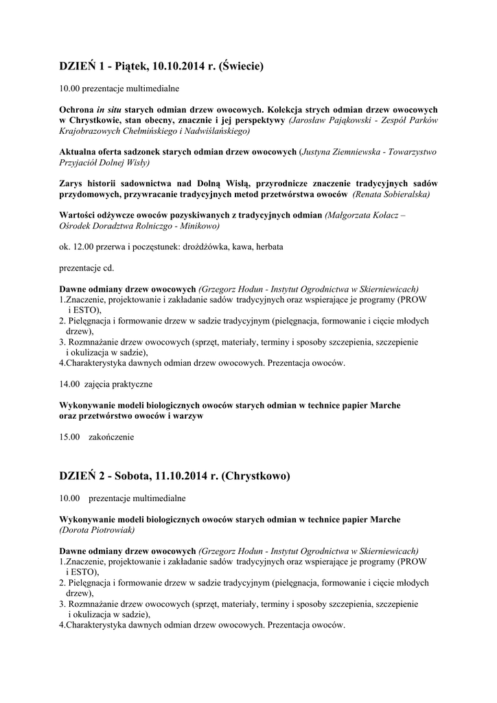 DZIEŃ 1 - Piątek, 10.10.2014 r. (Świecie) 10.00 prezentacje multimedialne Ochrona in situ starych odmian drzew owocowych. Kolekcja strych odmian drzew owocowych w Chrystkowie, stan obecny, znacznie i jej perspektywy (Jarosław Pająkowski - Zespół Parków Krajobrazowych Chełmińskiego i Nadwiślańskiego) Aktualna oferta sadzonek starych odmian drzew owocowych (Justyna Ziemniewska - Towarzystwo Przyjaciół Dolnej Wisły) Zarys historii sadownictwa nad Dolną Wisłą, przyrodnicze znaczenie tradycyjnych sadów przydomowych, przywracanie tradycyjnych metod przetwórstwa owoców (Renata Sobieralska) Wartości odżywcze owoców pozyskiwanych z tradycyjnych odmian (Małgorzata Kołacz – Ośrodek Doradztwa Rolniczgo - Minikowo) ok. 12.00 przerwa i poczęstunek: drożdżówka, kawa, herbata prezentacje cd. Dawne odmiany drzew owocowych (Grzegorz Hodun - Instytut Ogrodnictwa w Skierniewicach) 1.Znaczenie, projektowanie i zakładanie sadów tradycyjnych oraz wspierające je programy (PROW i ESTO), 2. Pielęgnacja i formowanie drzew w sadzie tradycyjnym (pielęgnacja, formowanie i cięcie młodych drzew), 3. Rozmnażanie drzew owocowych (sprzęt, materiały, terminy i sposoby szczepienia, szczepienie i okulizacja w sadzie), 4.Charakterystyka dawnych odmian drzew owocowych. Prezentacja owoców. 14.00 zajęcia praktyczne Wykonywanie modeli biologicznych owoców starych odmian w technice papier Marche oraz przetwórstwo owoców i warzyw 15.00 zakończenie DZIEŃ 2 - Sobota, 11.10.2014 r. (Chrystkowo) 10.00 prezentacje multimedialne Wykonywanie modeli biologicznych owoców starych odmian w technice papier Marche (Dorota Piotrowiak) Dawne odmiany drzew owocowych (Grzegorz Hodun - Instytut Ogrodnictwa w Skierniewicach) 1.Znaczenie, projektowanie i zakładanie sadów tradycyjnych oraz wspierające je programy (PROW i ESTO), 2. Pielęgnacja i formowanie drzew w sadzie tradycyjnym (pielęgnacja, formowanie i cięcie młodych drzew), 3. Rozmnażanie drzew owocowych (sprzęt, materiały, terminy i sposoby szczepienia, szczepienie i okulizacja w sadzie), 4.Charakterystyka dawnych odmian drzew owocowych. Prezentacja owoców. 12.00 przerwa, poczęstunek i degustacje 12.30 przejście do sadu i zrywanie jabłek Przejście do kolekcji starych odmian drzew owocowych przy zabytkowej chacie w Chrystkowie i pokaz sadzenia, cięcia i formowania drzew, szczepienia i okulizacji, prezentacja dawnych odmian jabłoni w kolekcji (Grzegorz Hodun - Instytut Ogrodnictwa w Skierniewicach) Pokaz tłoczenia soków z owoców starych odmian (Jacek Pamuła) 15.00 zakończenie