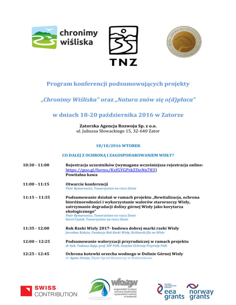 Program konferencji podsumowujących projekty „Chronimy Wiśliska” oraz „Natura znów się o(d)płaca” w dniach 18-20 października 2016 w Zatorze Zatorska Agencja Rozwoju Sp. z o.o. ul. Juliusza Słowackiego 15, 32-640 Zator 18/10/2016 WTOREK CO DALEJ Z OCHRONĄ I ZAGOSPODAROWANIEM WISŁY? 10:30 - 11:00 Rejestracja uczestników (wymagana wcześniejsza rejestracja online: https://goo.gl/forms/KxfGYGPskZDoNn783) Powitalna kawa 11:00 - 11:15 Otwarcie konferencji 11:15 – 11:35 Podsumowanie działań w ramach projektu „Rewitalizacja, ochrona bioróżnorodności i wykorzystanie walorów starorzeczy Wisły, zatrzymanie degradacji doliny górnej Wisły jako korytarza ekologicznego” Piotr Rymarowicz, Towarzystwo na rzecz Ziemi Piotr Rymarowicz, Towarztstwo na rzecz Ziemi Karol Ciężak, Towarzystwo na rzecz Ziemi 11:35 - 12:00 Rok Rzeki Wisły 2017- budowa dobrej marki rzeki Wisły 12:00 – 12:25 Podsumowanie waloryzacji przyrodniczej w ramach projektu 12:25 - 12:45 Ochrona kotewki orzecha wodnego w Dolinie Górnej Wisły Jarosław Kałuża, Fundacja Rok Rzeki Wisły, Królewski flis na Wisle dr hab. Tadeusz Zając prof. IOP PAN, Instytut Ochrony Przyrody PAN dr Agata Smieja, Śląski Ogród Botaniczny w Radzionkowie 12:45 - 13:05 Dobre praktyki w ochronie płazów w procesie rewitalizacji starorzeczy na terenie Górnej Wisły Małgorzata Łaciak, Towarzystwo na rzecz Ziemi, Instytyt Ochrony Przyrody PAN 13.05 – 14:00 Obiad 14:00 - 14:20 Działania na rzecz ochrony bioróżnorodności Doliny Górnej Wisły i perspektywa kontynuacji Wojciech Gałosz, Towarzystwo na rzecz Ziemi 14:20 - 14:45 Ocena wpływu wybranych działań rewitalizacyjnych na możliwości poprawy bezpieczeństwa powodziowego w dolinie górnej Wisły Robert Wawręty, Towarzystwo na rzecz Ziemi 14:45 – 15:10 Konflikt między ochroną przyrody a ochrona przeciwpowodziową – modelowe rozwiązanie na przykładzie Małopolskiego Przelomu Wisły prof. dr hab. inż. Wojciech Bartnik, Uniwersytet Rolniczy w Krakowie dr hab. Tadeusz Zając prof. IOP PAN, Instytut Ochrony Przyrody PAN 15:10 – 15:35 Wpływ przegrodzenia Wisły przy Elektrowni w Kozienicach na ekosystem Wisły i obszary Natura 2000 prof. dr hab. Tomasz Mikołajczyk, Fundacja Salmonidae, Pracownia Ekspertyz i Badań Ichtiologicznych PEBI 15:35 – 16:05 Przerwa kawowa 16:05 – 16:30 Wiślana Trasa Rowerowa w Małopolsce – doświadczenia z realizacji projektu Marek Zając, Zarząd Dróg Wojewódzkich w Krakowie 16:30 – 16:55 Flis galarem po Wiśle – bariery i progi żeglugi 16:55 – 17:20 Apel organizacji pozarządowych, naukowców, samorządów dotyczący planów rozwoju żeglugi śródlądowej na polskich rzekach Józef Ratajczak, Towarzystwo na rzecz Ziemi Ewa Sufin, Fundacja Strefa Zieleni 17:20 – 18:00 Podsumowanie I dnia konferencji, dyskusja 18:00 – 18:30 Zakwaterowanie* 18:30 – 20:00 Kolacja Piotr Rymarowicz, Towarzystwo na rzecz Ziemi Ośrodek Rekreacyjno-Wypoczynkowy „Karpik” w Graboszycach 19/10/2016 ŚRODA EKSPLOATACJA SUROWCÓW MINERALNYCH A NATURA 2000 I OCHRONA PRZYRODY 8:30 - 9:30 Śniadanie* 9:30 – 10:00 Rejestracja uczestników (wymagana wcześniejsza rejestracja online: Ośrodek Rekreacyjno-Wypoczynkowy „Karpik” w Graboszycach https://goo.gl/forms/KxfGYGPskZDoNn783) Powitalna kawa 10:00 – 10:15 Otwarcie II dnia konferencji 10:15 – 10:40 Podsumowanie działań w ramach projektu „Natura znów się o(d)płaca” 10:40 – 11:10 Walory przyrodnicze terenów poeksploatacyjnych 11:10 – 11:50 Kluczowe wymagania prawne z zakresu ochrony środowiska w świetle planowanej eksploatacji kruszyw na obszarach Natura 2000 Przepisy regulujące zasady rekultywacji terenów po eksploatacji kruszyw, w szczególności w kierunku przyrodniczym Piotr Rymarowicz, Towarzystwo na rzecz Ziemi Piotr Rymarowicz, Towarzystwo na rzecz Ziemi dr hab. Tadeusz Zając prof. IOP PAN, Instytut Ochrony Przyrody PAN Mariusz Dyka, Starostwo Powiatowe w Gliwicach 11:50 – 12:20 Przerwa kawowa 12:20 – 12:50 Projektowanie eksploatacji i rekultywacji w kierunku przyrodniczym 12:50 – 13:20 Ochrona ptaków na zbiornikach poeksploatacyjnych - przykłady kopalni Górażdże/HeidelbergCement w Polsce dr hab. Tadeusz Zając prof. IOP PAN, Instytut Ochrony Przyrody PAN Tomasz Wilk, Ogólnopolskie Towarzystwo Ochrony Ptaków 13:20 – 14:20 Obiad 14:20 – 14:50 Konflikty społeczno-środowiskowe związane z dzialalnością górnictwa 14:50 – 15:10 Współpraca ornitologów z Krakowskimi Zakładami Eksploatacji Kruszywa, czyli jak prowadzić inwestycje potencjalnie zagrażające ptakom w obszarze Natura 2000. dr Jarosław Badera, Uniwersytet Śląski w Katowicach dr Jacek Betleja, Muzeum Górnośląskie w Bytomiu dr Mateusz Ledwoń, Instytyt Systematyki i Ewolucji Zwierząt PAN 15:10 – 15:40 Przerwa kawowa 15:40 – 16:00 Ochrona siedlisk ptaków wodno-błotnych w Dolinie Górnej Wisły – działania w ramach planowanego projektu LIFE+, ze szczególnym uwzględnieniem zbiorników żwirowni Katrzyna Paciora, Regionalna Dyrekcja Ochrony Środowiska w Krakowie Wojciech Gałosz, Towarzystwo na rzecz Ziemi 16:00 – 16:30 Zagrożenia środowiska gruntowo - wodnego związane z rekultywacją żwirowni odpadami pogórniczymi Dominika Dąbrowska, dr inż. Marek Sołtysiak, Uniwersytet Śląski w Katowicach, Polskie Towarzystwo Lizymetryczne, Stowarzyszenie Hydrogeologów Polskich 16:30 – 17:20 Podsumowanie II dnia konferencji, dyskusja 17:20 – 18:00 Zakwaterowanie* 18:00 – 19:30 Kolacja Piotr Rymarowicz, Towarzystwo na rzecz Ziemi Ośrodek Rekreacyjno-Wypoczynkowy „Karpik” w Graboszycach 20/10/2016 CZWARTEK WIZYTA STUDYJNA PO DOLINIE KARPIA 8:30 - 9:30 Śniadanie* 9:30 – 10:00 Rejestracja uczestników (wymagana wcześniejsza rejestracja online: Ośrodek Rekreacyjno-Wypoczynkowy „Karpik” w Graboszycach https://goo.gl/forms/KxfGYGPskZDoNn783) Powitalna kawa 10:00 – 13:00 Wycieczka z ornitologiem po kompleksach stawowych w Spytkowicach Sp