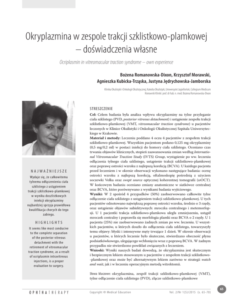 Okryplazmina w zespole trakcji szklistkowo-plamkowej – doświadczenia własne Ocriplasmin in vitreomacular traction syndrome – own experience Bożena Romanowska-Dixon, Krzysztof Morawski, Agnieszka Kubicka-Trząska, Justyna Jędrychowska-Jamborska Klinika Okulistyki i Onkologii Okulistycznej, Katedra Okulistyki, Uniwersytet Jagielloński, Collegium Medicum Kierownik Kliniki: prof. dr hab. n. med. Bożena Romanowska-Dixon STRESZCZENIE NA JWAŻNIEJSZE Wydaje się, że całkowitemu tylnemu odłączenieniu ciała szklistego z ustąpieniem trakcji szklistkowo-plamkowej w wyniku doszlistkowych iniekcji okryplazminy najbardziej sprzyja prawidłowa kwalifikacja chorych do tego zabiegu. HIGHLIGHTS It seems like most conducive to the complete separation of the posterior vitreous detachment with the retirement of vitreomacular traction syndrome, as a result of ocriplasmin intravitreous injections, is a proper evaluation to surgery. Cel: Celem badania była analiza wpływu okryplazminy na tylne przyleganie ciała szklistego (PVD, posterior vitreous detachment) i ustąpienie zespołu trakcji szklistkowo-plamkowej (VMT, vitreomacular traction syndrome) u pacjentów leczonych w Klinice Okulistyki i Onkologii Okulistycznej Szpitala Uniwersyteckiego w Krakowie. Materiał i metody: Leczeniu poddano 4 oczu 4 pacjentów z zespołem trakcji szklistkowo-plamkowej. Wszystkim pacjentom podano 0,125 mg okryplazminy (0,5 mg/0,2 ml) w postaci iniekcji do komory ciała szklistego. Oceniano czas trwania objawów klinicznych, stopień zaawansowania zmian według International Vitreomacular Traction Study (IVTS) Group, wystąpienie po ww. leczeniu odłączenia tylnego ciała szklistego, ustąpienie trakcji szklistkowo-plamkowej oraz poprawę ostrości wzroku z najlepszą korekcją (BCVA). U każdego pacjenta przed leczeniem i w okresie obserwacji wykonano następujące badania: ocenę ostrości wzroku z najlepszą korekcją, oftalmoskopię pośrednią z użyciem soczewki Volka oraz swept source optycznej koherentnej tomografii (ssOCT). W końcowym badaniu oceniano zmiany anatomiczne w siatkówce centralnej oraz BCVA, które porównywano z wynikami badania wyjściowego. Wyniki: W 2 spośród 4 przypadków (50%) zaobserwowano całkowite tylne odłączenie ciała szklistego z ustąpieniem trakcji szklistkowo-plamkowej. U tych pacjentów odnotowano największą poprawę ostrości wzroku, średnio o 3 rzędy, oraz ustąpienie objawów subiektywnych: mroczka centralnego i metemorfopsji. U 1 pacjentki trakcja szklistkowo-plamkowa uległa zmniejszeniu, ustąpił mroczek centralny i poprawiła się morfologia plamki oraz BCVA o 2 rzędy. U 1 pacjenta (25%) nie zaobserwowano żadnych zmian po ww. leczeniu. U wszystkich pacjentów, u których doszło do odłączenia ciała szklistego, towarzyszyły temu objawy: błyski i intensywne męty trwające 1 dzień. W okresie obserwacji u pacjentów, u których leczenie było skuteczne, stwierdzano obecność płynu podsiatkówkowego, ulegającego wchłonięciu wraz z poprawą BCVA. W żadnym przypadku nie stwierdzono powikłań związanych z leczeniem. Wnioski: Wyniki naszych badań dowodzą, że okryplazmina jest skutecznym i bezpiecznym lekiem stosowanym u pacjentów z zespołem trakcji szklistkowo-plamkowej oraz może być alternatywnym lekiem zarówno w strategii watch and wait, jak i w leczeniu operacyjnym metodą witrektomii. Słowa kluczowe: okryplazmina, zespół trakcji szklistkowo-plamkowej (VMT), tylne odłączenie ciała szklistego (PVD), złącze szklistkowo-plamkowe Co py rig ht © Medical Educatio n Vo l. 2/Nr 1(5)/2015 (s. 65-70) 65 Okryplazmina w zespole trakcji szklistkowo-plamkowej – doświadczenia własne B. Romanowska-Dixon, K. Morawski, A. Kubicka-Trząska, J. Jędrychowska-Jamborska ABSTRACT Ocriplasmin influence on posterior vitreous detachment (PVD) and vitreomacular traction (VMT) at patients treated in Ophthalmology and Ocular Oncology Clinic of University Hospital was evaluated. The paper presents results of the best corrected visual acuity (BCVA), images of swept source optic coherence tomography (OCT) and our experiences related with employment ocriplasmin at 4 patients. Patients were evaluated according to new classification of Vitreomacular Interface (VMI). Material and methods: Four patients (4 eyes with vitreomacular traction) were treated with 0,125 mg ocriplasmin (jetrea 0,5 mg/0,2 ml) intravitreal iniection. Duration of clinical signs of symptoms, the degree of disease severity (according to International Traction Study, IVTS, Group), presence of posterior vitreous detachment and resolution of vitreomacular traction and best corrected visual acuity (BCVA) improvement were evaluated. BCVA, ophthalmoscopy using Volk lens and swept source optical coherent tomography (OCT) were performed in all patients. Results: In 2 eyes (50%) total posterior vitreous detachment and vitreomacular traction was achieved. The BCVA improvement, withdrawn of symptoms, central scotomas and metamorphopsies were observed in patients. It has undergone decrease of vitreomacular traction after treatment at one patient 25%, central scotomas and metamorphopsies. We observe no changes at one patient after employed treatment (25%). The vitreous body detachment events (lasting 1 day vitreous floaters, photopsia, floaters) appeared in all treated patients. Subretinal fluid absorption and BCVA improvement were observed in effective treated patients during follow-up. No one patient had present treatment related complications. Conclusions: Enzymatic vitreolysis with ocriplasmin for vitreomacular traction is effective and safe treatment, which can be alternative management for both strategies: “watch and wait” or vitrectomy. Key words: ocriplasmin, vitreomacular traction syndrome (VMT), posterior vitreous detachment (PVD), vitreomacular interface WSTĘP Zespół trakcji szklistkowo-plamkowej (VMT) został po raz pierwszy opisany przez Reese i wsp. w 1970 r. [1]. Częstość wyst