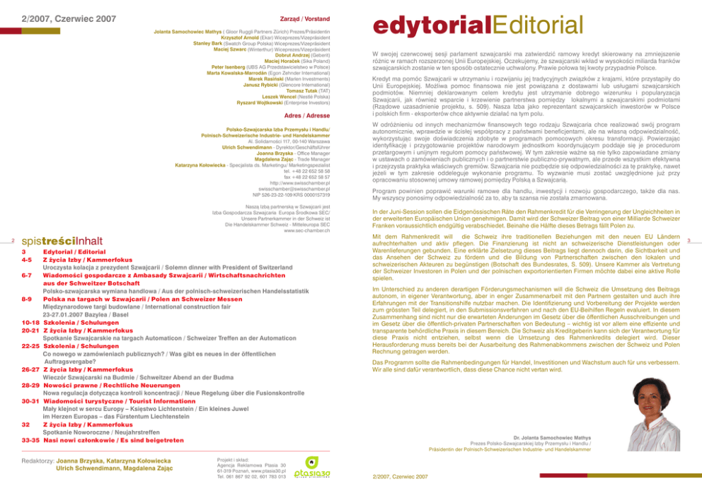 2/2007, Czerwiec 2007 Zarząd / Vorstand Jolanta Samochowiec Mathys ( Gloor Ruggli Partners Zürich) Prezes/Präsidentin Krzysztof Arnold (Ekar) Wiceprezes/Vizepräsident Stanley Bark (Swatch Group Polska) Wiceprezes/Vizepräsident Maciej Szwarc (Winterthur) Wiceprezes/Vizepräsident Dobrut Andrzej (Geberit) Maciej Horaček (Sika Poland) Peter Isenberg (UBS AG Przedstawicielstwo w Polsce) Marta Kowalska-Marrodán (Egon Zehnder International) Marek Rasiński (Marlen Investments) Janusz Rybicki (Glencore International) Tomasz Tutak (TAT) Leszek Wencel (Nestlé Polska) Ryszard Wojtkowski (Enterprise Investors) Adres / Adresse Polsko-Szwajcarska Izba Przemysłu i Handlu/ Polnisch-Schweizerische Industrie- und Handelskammer Al. Solidarności 117, 00-140 Warszawa Ulrich Schwendimann - Dyrektor/Geschäftsführer Joanna Brzyska - Office Manager Magdalena Zając - Trade Manager Katarzyna Kołowiecka - Specjalista ds. Marketingu/ Marketingspezialist tel. +48 22 652 58 58 fax +48 22 652 58 57 http://www.swisschamber.pl [email protected] NIP 526-23-22-109 KRS 0000157319 Naszą Izbą partnerską w Szwajcarii jest Izba Gospodarcza Szwajcaria Europa Środkowa SEC/ Unsere Partnerkammer in der Schweiz ist Die Handelskammer Schweiz - Mitteleuropa SEC www.sec-chamber.ch 2 spistreściInhalt 3 4-5 6-7 8-9 10-18 20-21 22-25 26-27 28-29 30-31 32 33-35 Edytorial / Editorial Z życia Izby / Kammerfokus Uroczysta kolacja z prezydent Szwajcarii / Solemn dinner with President of Switzerland Wiadomości gospodarcze z Ambasady Szwajcarii / Wirtschaftsnachrichten aus der Schweitzer Botschaft Polsko-szwajcarska wymiana handlowa / Aus der polnisch-schweizerischen Handelsstatistik Polska na targach w Szwajcarii / Polen an Schweizer Messen Międzynarodowe targi budowlane / International construction fair 23-27.01.2007 Bazylea / Basel Szkolenia / Schulungen Z życia Izby / Kammerfokus Spotkanie Szwajcarskie na targach Automaticon / Schweizer Treffen an der Automaticon Szkolenia / Schulungen Co nowego w zamówieniach publicznych? / Was gibt es neues in der öffentlichen Auftragsvergabe? Z życia Izby / Kammerfokus Wieczór Szwajcarski na Budmie / Schweitzer Abend an der Budma Nowości prawne / Rechtliche Neuerungen Nowa regulacja dotycząca kontroli koncentracji / Neue Regelung über die Fusionskontrolle Wiadomości turystyczne / Tourist Informationn Mały klejnot w sercu Europy – Księstwo Lichtenstein / Ein kleines Juwel im Herzen Europas – das Fürstentum Liechtenstein Z życia Izby / Kammerfokus Spotkanie Noworoczne / Neujahrstreffen Nasi nowi członkowie / Es sind beigetreten Redaktorzy: Joanna Brzyska, Katarzyna Kołowiecka Ulrich Schwendimann, Magdalena Zając Projekt i skład: Agencja Reklamowa Ptasia 30 61-319 Poznań, www.ptasia30.pl Tel. 061 867 92 02, 601 783 013 edytorialEditorial W swojej czerwcowej sesji parlament szwajcarski ma zatwierdzić ramowy kredyt skierowany na zmniejszenie różnic w ramach rozszerzonej Unii Europejskiej. Oczekujemy, że szwajcarski wkład w wysokości miliarda franków szwajcarskich zostanie w ten sposób ostatecznie uchwalony. Prawie połowa tej kwoty przypadnie Polsce. Kredyt ma pomóc Szwajcarii w utrzymaniu i rozwijaniu jej tradycyjnych związków z krajami, które przystąpiły do Unii Europejskiej. Możliwa pomoc finansowa nie jest powiązana z dostawami lub usługami szwajcarskich podmiotów. Niemniej deklarowanym celem kredytu jest utrzymanie dobrego wizerunku i popularyzacja Szwajcarii, jak również wsparcie i krzewienie partnerstwa pomiędzy lokalnymi a szwajcarskimi podmiotami (Rządowe uzasadnienie projektu, s. 509). Nasza Izba jako reprezentant szwajcarskich inwestorów w Polsce i polskich firm - eksporterów chce aktywnie działać na tym polu. W odróżnieniu od innych mechanizmów finansowych tego rodzaju Szwajcaria chce realizować swój program autonomicznie, wprawdzie w ścisłej współpracy z państwami beneficjentami, ale na własną odpowiedzialność, wykorzystując swoje doświadczenia zdobyte w programach pomocowych okresu transformacji. Powierzając identyfikację i przygotowanie projektów narodowym jednostkom koordynującym poddaje się je procedurom przetargowym i unijnym regułom pomocy państwowej. W tym zakresie ważne są nie tylko zapowiadane zmiany w ustawach o zamówieniach publicznych i o partnerstwie publiczno-prywatnym, ale przede wszystkim efektywna i przejrzysta praktyka właściwych gremiów. Szwajcaria nie pozbędzie się odpowiedzialności za tę praktykę, nawet jeżeli w tym zakresie oddeleguje wykonanie programu. To wyzwanie musi zostać uwzględnione już przy opracowaniu stosownej umowy ramowej pomiędzy Polską a Szwajcarią. Program powinien poprawić warunki ramowe dla handlu, inwestycji i rozwoju gospodarczego, także dla nas. My wszyscy ponosimy odpowiedzialność za to, aby ta szansa nie została zmarnowana. In der Juni-Session sollen die Eidgenössischen Räte den Rahmenkredit für die Verringerung der Ungleichheiten in der erweiterten Europäischen Union genehmigen. Damit wird der Schweizer Beitrag von einer Milliarde Schweizer Franken voraussichtlich endgültig verabschiedet. Beinahe die Hälfte dieses Betrags fällt Polen zu. Mit dem Rahmenkredit will die Schweiz ihre traditionellen Beziehungen mit den neuen EU Ländern aufrechterhalten und aktiv pflegen. Die Finanzierung ist nicht an schweizerische Dienstleistungen oder Warenlieferungen gebunden. Eine erklärte Zielsetzung dieses Beitrags liegt dennoch darin, die Sichtbarkeit und das Ansehen der Schweiz zu fördern und die Bildung von Partnerschaften zwischen den lokalen und schweizerischen Akteuren zu begünstigen (Botschaft des Bundesrates, S. 509). Unsere Kammer als Vertretung der Schweizer Investoren in Polen und der polnischen exportorientierten Firmen möchte dabei eine aktive Rolle spielen. Im Unterschied zu anderen derartigen Förderungsmechanismen will die Schweiz die Umsetzung des Beitrags autonom, in eigener Verantwortung, aber in enger Zusammenarbeit mit d