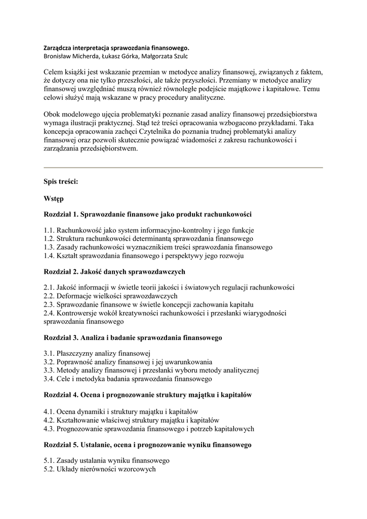 Zarządcza interpretacja sprawozdania finansowego. Bronisław Micherda, Łukasz Górka, Małgorzata Szulc Celem książki jest wskazanie przemian w metodyce analizy finansowej, związanych z faktem, że dotyczy ona nie tylko przeszłości, ale także przyszłości. Przemiany w metodyce analizy finansowej uwzględniać muszą również równoległe podejście majątkowe i kapitałowe. Temu celowi służyć mają wskazane w pracy procedury analityczne. Obok modelowego ujęcia problematyki poznanie zasad analizy finansowej przedsiębiorstwa wymaga ilustracji praktycznej. Stąd też treści opracowania wzbogacono przykładami. Taka koncepcja opracowania zachęci Czytelnika do poznania trudnej problematyki analizy finansowej oraz pozwoli skutecznie powiązać wiadomości z zakresu rachunkowości i zarządzania przedsiębiorstwem. Spis treści: Wstęp Rozdział 1. Sprawozdanie finansowe jako produkt rachunkowości 1.1. Rachunkowość jako system informacyjno-kontrolny i jego funkcje 1.2. Struktura rachunkowości determinantą sprawozdania finansowego 1.3. Zasady rachunkowości wyznacznikiem treści sprawozdania finansowego 1.4. Kształt sprawozdania finansowego i perspektywy jego rozwoju Rozdział 2. Jakość danych sprawozdawczych 2.1. Jakość informacji w świetle teorii jakości i światowych regulacji rachunkowości 2.2. Deformacje wielkości sprawozdawczych 2.3. Sprawozdanie finansowe w świetle koncepcji zachowania kapitału 2.4. Kontrowersje wokół kreatywności rachunkowości i przesłanki wiarygodności sprawozdania finansowego Rozdział 3. Analiza i badanie sprawozdania finansowego 3.1. Płaszczyzny analizy finansowej 3.2. Poprawność analizy finansowej i jej uwarunkowania 3.3. Metody analizy finansowej i przesłanki wyboru metody analitycznej 3.4. Cele i metodyka badania sprawozdania finansowego Rozdział 4. Ocena i prognozowanie struktury majątku i kapitałów 4.1. Ocena dynamiki i struktury majątku i kapitałów 4.2. Kształtowanie właściwej struktury majątku i kapitałów 4.3. Prognozowanie sprawozdania finansowego i potrzeb kapitałowych Rozdział 5. Ustalanie, ocena i prognozowanie wyniku finansowego 5.1. Zasady ustalania wyniku finansowego 5.2. Układy nierówności wzorcowych 5.3. Modele analityczne rentowności 5.4. Rachunek progów rentowności i jego wykorzystanie Rozdział 6. Pomiar i ocena płynności finansowej 6.1. Znaczenie płynności finansowej 6.2. Statyczny pomiar i ocena płynności finansowej 6.3. Dynamiczny pomiar i ocena płynności finansowej 6.4. Planowanie przepływów pieniężnych Rozdział 7. Kontynuacja działalności i modele ostrzegające przed upadłością 7.1. Kontynuacja działalności przedsiębiorstwa 7.2. Modele dyskryminacyjne 7.3. Współczesne metody oceny zagrożeń kontynuacji działalności Spis tabel Spis rysunków, wykresów, schematów Bibliografia