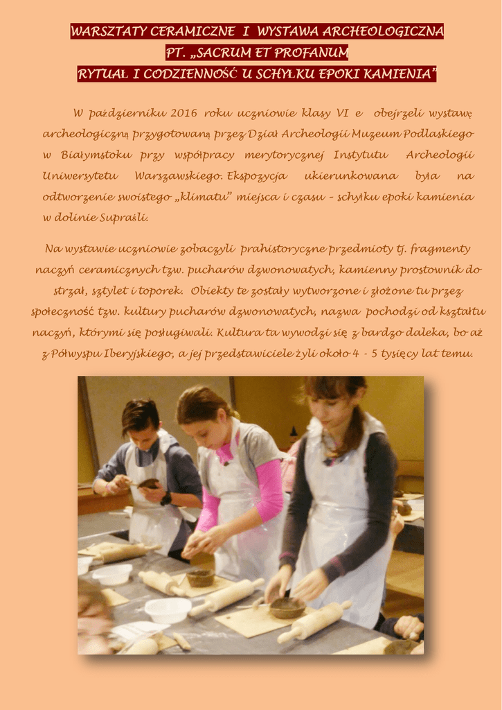 WARSZTATY CERAMICZNE I WYSTAWA ARCHEOLOGICZNA PT. „SACRUM ET PROFANUM RYTUAŁ I CODZIENNOŚĆ U SCHYŁKU EPOKI KAMIENIA” W październiku 2016 roku uczniowie klasy VI e obejrzeli wystawę archeologiczną przygotowaną przez Dział Archeologii Muzeum Podlaskiego w Białymstoku przy współpracy merytorycznej Instytutu Uniwersytetu Warszawskiego. Ekspozycja ukierunkowana Archeologii była na odtworzenie swoistego „klimatu” miejsca i czasu – schyłku epoki kamienia w dolinie Supraśli. Na wystawie uczniowie zobaczyli prahistoryczne przedmioty tj. fragmenty naczyń ceramicznych tzw. pucharów dzwonowatych, kamienny prostownik do strzał, sztylet i toporek. Obiekty te zostały wytworzone i złożone tu przez społeczność tzw. kultury pucharów dzwonowatych, nazwa pochodzi od kształtu naczyń, którymi się posługiwali. Kultura ta wywodzi się z bardzo daleka, bo aż z Półwyspu Iberyjskiego, a jej przedstawiciele żyli około 4 - 5 tysięcy lat temu. Po obejrzeniu wystawy uczniowie klasy VI e mieli okazję ubrudzić się gliną oraz poznać sposoby lepienia z tego materiał. Podczas warsztatów ceramicznych przygotowanych przez instruktorów z Muzeum Podlaskiego w Białymstoku każdy uczeń mógł spróbować samodzielnie stworzyć własne gliniane naczynie inspirowane ceramicznymi wykopaliskami. Celem warsztatów było ulepienie miseczki z gliny i ozdobienie jej symetrycznym ornamentem według własnego pomysłu. Uczniowie pracowali w skupieniu i z wielkim zaangażowaniem , a po skończonej pracy mogli zabrc swoje gliniane dzieła ze sobą na pamiątkę. Warsztaty wprowadziły uczniów krok po kroku w niezwykły świat ceramiki, nauczyły pracy z gliną oraz podstawowymi technikami zdobienia naczyń ceramicznych . Opracowała: Katarzyna Weiss