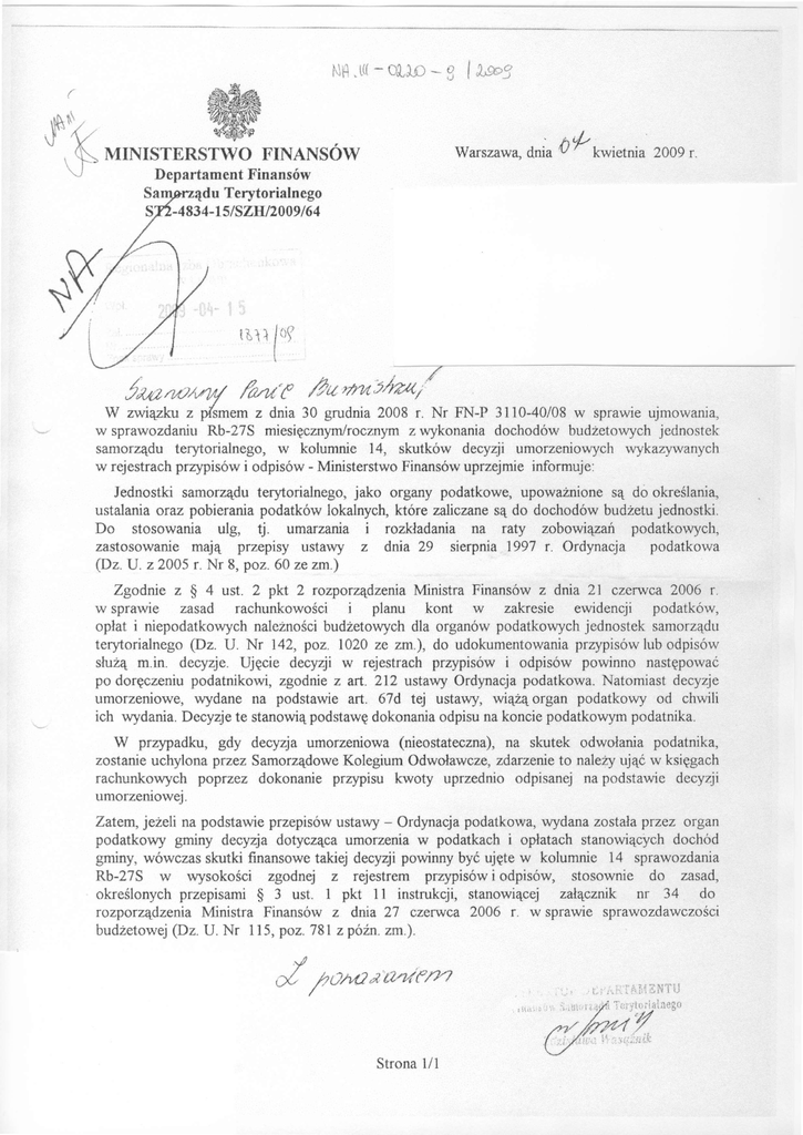 W zwięku z 1smem z dnia 30 grudnia2008 r. Nr FN-P 3110-40/08w sprawieujmowania,
