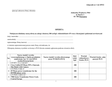 Załącznik nr 1 do SIWZ ___________________________ (pieczęć adresowa firmy oferenta) Jednostka Wojskowa 3964 ul. Bystra 1 03–700 Warszawa OFERTA Niniejszym składamy naszą ofertę na zakup i dostawę 200 szt/kpl. wideotelefonów IP wraz z licencjami i pakietami serwisowymi imię i nazwisko: ............................................................................................................................... zamieszkały: ..................................................................................................................................... reprezentując firmę (nazwa): ............................................................................................................ w imieniu reprezentowanej przeze mnie firmy oświadczam, że: Oferujemy dostawę wyrobów za kwotę w PLN (kwota zostanie ogłoszona podczas otwarcia ofert). Nazwa /model/ wyrobu wyszczególnionego w Opisie przedmiotu Lp. zamówienia /zał. Nr 4 do SIWZ/ ZAMAWIAJĄCEGO CP-9971 -CL-CAM-K9= 1 Cisco Unified IP Phone 9971, Charcoal, Slm Hndst with Camera CP-PWR-CUBE-4= 2 IP Phone power transformer for the 89/9900 phone series CP-PWR-CORD-CE= 3 7900 Series Transformer Power Cord, Central Europe Nazwa /model/ wyrobu oferowanego przez WYKONAWCĘ Ilość sztuk /kpl/ 200 200 200 1 Wartość Wartość brutto całej jednostkowa pozycji /PLN/ brutto /PLN/ 7 R-CUWL-STD-K9 Unified Workspace Licensing - Top Level for STD CUP9-ONPREM-OPT Included CUCM IM and Presence for on-premise use NEW-UWL-STD-SLED New CUWL Standard Edition Usr SLED/Govt/Edu Only 1 Usr JAB9-DSK-UWL Jabber for Desktop 9,x for CUWL Only 8 U C-AP PS-SW-9.0-K9 Version 9.0 Software Kit 4 5 6 Wartość zamówienia wynosi: wartość netto (bez VAT) __ __ __ __ __ __ cena brutto (z VAT) słownie 200 200 200 200 200 podatek VAT _ _ _ _ % __ __ __ __ __ _ cena brutto (z VAT) __ __ __ __ __ __ __ ........................................................................................................................ Udzielamy gwarancji na ….….. miesiące. Oświadczamy, że zapoznaliśmy się z projektem umowy /Załącznik nr 5 do SIWZ/ i nie wnosimy do niej zastrzeżeń. Zamówienie zobowiązujemy się wykonać w terminie do 30 dni od podpisania umowy. Oświadczamy, że uważamy się za związanych niniejszą ofertą przez okres 30 dni. Usługę objętą zamówieniem wykonamy sami / z udziałem podwykonawców *; Wykaz czynności, które będzie wykonywał podwykonawca…………………………………………………………………………………..…….. ………………………………………………………………………..………………………………………………………………………………... (nazwa i adres podwykonawcy) .......................................................... /podpis upoważnionego przedstawiciela/ Miejscowość............................................ data:............................ 2