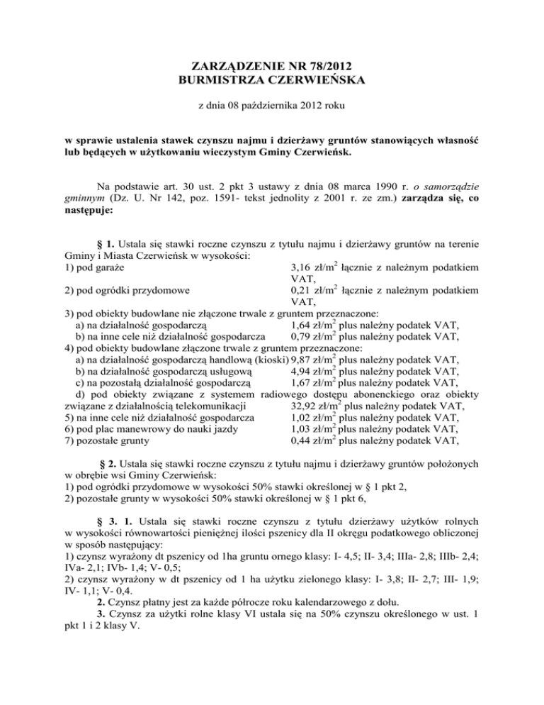 ZARZĄDZENIE NR 78/2012 BURMISTRZA CZERWIEŃSKA z dnia 08 października 2012 roku w sprawie ustalenia stawek czynszu najmu i dzierżawy gruntów stanowiących własność lub będących w użytkowaniu wieczystym Gminy Czerwieńsk. Na podstawie art. 30 ust. 2 pkt 3 ustawy z dnia 08 marca 1990 r. o samorządzie gminnym (Dz. U. Nr 142, poz. 1591- tekst jednolity z 2001 r. ze zm.) zarządza się, co następuje: § 1. Ustala się stawki roczne czynszu z tytułu najmu i dzierżawy gruntów na terenie Gminy i Miasta Czerwieńsk w wysokości: 1) pod garaże 3,16 zł/m2 łącznie z należnym podatkiem VAT, 2) pod ogródki przydomowe 0,21 zł/m2 łącznie z należnym podatkiem VAT, 3) pod obiekty budowlane nie złączone trwale z gruntem przeznaczone: a) na działalność gospodarczą 1,64 zł/m2 plus należny podatek VAT, b) na inne cele niż działalność gospodarcza 0,79 zł/m2 plus należny podatek VAT, 4) pod obiekty budowlane złączone trwale z gruntem przeznaczone: a) na działalność gospodarczą handlową (kioski) 9,87 zł/m2 plus należny podatek VAT, b) na działalność gospodarczą usługową 4,94 zł/m2 plus należny podatek VAT, c) na pozostałą działalność gospodarczą 1,67 zł/m2 plus należny podatek VAT, d) pod obiekty związane z systemem radiowego dostępu abonenckiego oraz obiekty związane z działalnością telekomunikacji 32,92 zł/m2 plus należny podatek VAT, 5) na inne cele niż działalność gospodarcza 1,02 zł/m2 plus należny podatek VAT, 6) pod plac manewrowy do nauki jazdy 1,03 zł/m2 plus należny podatek VAT, 7) pozostałe grunty 0,44 zł/m2 plus należny podatek VAT, § 2. Ustala się stawki roczne czynszu z tytułu najmu i dzierżawy gruntów położonych w obrębie wsi Gminy Czerwieńsk: 1) pod ogródki przydomowe w wysokości 50% stawki określonej w § 1 pkt 2, 2) pozostałe grunty w wysokości 50% stawki określonej w § 1 pkt 6, § 3. 1. Ustala się stawki roczne czynszu z tytułu dzierżawy użytków rolnych w wysokości równowartości pieniężnej ilości pszenicy dla II okręgu podatkowego obliczonej w sposób następujący: 1) czynsz wyrażony dt pszenicy od 1ha gruntu ornego klasy: I- 4,5; II- 3,4; IIIa- 2,8; IIIb- 2,4; IVa- 2,1; IVb- 1,4; V- 0,5; 2) czynsz wyrażony w dt pszenicy od 1 ha użytku zielonego klasy: I- 3,8; II- 2,7; III- 1,9; IV- 1,1; V- 0,4. 2. Czynsz płatny jest za każde półrocze roku kalendarzowego z dołu. 3. Czynsz za użytki rolne klasy VI ustala się na 50% czynszu określonego w ust. 1 pkt 1 i 2 klasy V. 4. Cenę pszenicy przyjmuje się na podstawie średniej krajowej ceny skupu pszenicy publikowanej przez GUS za każde półrocze roku kalendarzowego. 5. Jeżeli naliczony czynsz według zasad określonych w § 3 ust. 1 pkt 1 i 2 będzie wynosił mniej niż 10,00 zł półrocznie, ustala się minimalną stawkę w wysokości 0,09 zł/m2. § 4. 1. Ustala się stawki roczne czynszu za dzierżawę rowów z przeznaczeniem na rekreację w wysokości 10% stawki szacunkowej wyrażonej w dt żyta dla 1 ha użytków zielonych klasy VI określonej i obliczonej zgodnie z Rozporządzeniem Ministra Rolnictwa i Rozwoju Wsi z dnia 17 lutego 2010 r. w sprawie szczegółowego trybu sprzedaży nieruchomości Zasobu Własności Rolnej Skarbu Państwa i ich części składowych, warunków rozkładania ceny sprzedaży na raty oraz stawek szacunkowych gruntów. 2. Cenę żyta przyjmuje się na podstawie średniej krajowej ceny skupu żyta publikowanej przez prezesa GUS za okres pierwszych trzech kwartałów poprzedniego roku. § 5. 1. Stawki czynszu , o którym mowa w § 1, § 3 i § 4 ustala się na okres jednego roku, a w przypadku, gdy najem lub dzierżawa trwa krócej niż jeden rok, wysokość czynszu ustala się proporcjonalnie do okresu zajęcia gruntu. 2. W każdym następnym roku najmu lub dzierżawy czynsz ulega zwiększeniu w stosunku do roku poprzedniego o wskaźnik inflacji przyjęty w projekcie budżetu państwa. § 6. W przypadku zmiany stawki czynszu za 1 m2 nieruchomości ustalonej przez Burmistrza Czerwieńska należy od następnego roku najmu lub dzierżawy określonego w umowie, dokonać zmiany ustalonej stawki czynszu. § 7. Za bezumowne korzystanie z gruntu określonego w § 1, § 3 i § 4 nalicza się wynagrodzenie w wysokości stawek czynszu obowiązujących na dzień ustalenia tego wynagrodzenia. § 8. Tracą moc zarządzenia: 1) Nr 74/2011 Burmistrza Czerwieńska z dnia 12 października 2011 roku w sprawie ustalenia stawek czynszu najmu i dzierżawy gruntów stanowiących własność lub będących w użytkowaniu wieczystym Gminy Czerwieńsk, 2) Nr 3/2012 Burmistrza Czerwieńska z dnia 16 stycznia 2012 roku zmieniające zarządzenie w sprawie ustalenia stawek czynszu najmu i dzierżawy gruntów stanowiących własność lub będących w użytkowaniu wieczystym Gminy Czerwieńsk § 9. Wykonanie zarządzenia powierza się Kierownikowi Referatu Gospodarki Gruntami, Rolnictwa i Ochrony Środowiska. § 10. Zarządzenie wchodzi w życie z dniem podpisania i obowiązuje od dnia 01 stycznia 2013 roku.