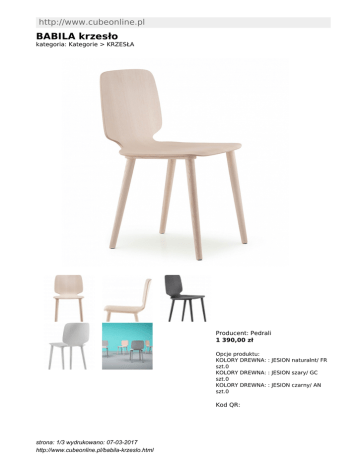 http://www.cubeonline.pl BABILA krzesło kategoria: Kategorie > KRZESŁA Producent: Pedrali 1 390,00 zł Opcje produktu: KOLORY DREWNA: : JESION naturalnt/ FR szt.0 KOLORY DREWNA: : JESION szary/ GC szt.0 KOLORY DREWNA: : JESION czarny/ AN szt.0 Kod QR: strona: 1/3 wydrukowano: 07-03-2017 http://www.cubeonline.pl/babila-krzeslo.html BABILA jest krzesłem z dużymi dradycjami. Siedzisko wykonane ze sklejki fornirowanej i solidne, drewniane nogi stanowią o komforcie siedzenia na drenianym krześle. Występuje w kilu kolorach drewna. WYMIARY (cm): strona: 2/3 wydrukowano: 07-03-2017 http://www.cubeonline.pl/babila-krzeslo.html wysokość siedziska- 46,50 wysokość całkowita- 79 szerokość- 44 głębokość- 52,50 MATERIAŁ: drewno naturlane lub drewno lakierowane Inne produkty Pedrali: http://www.cubeonline.pl/manufacturer/pedrali strona: 3/3 wydrukowano: 07-03-2017 http://www.cubeonline.pl/babila-krzeslo.html