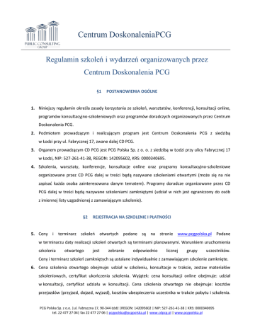 Centrum DoskonaleniaPCG Regulamin szkoleń i wydarzeń organizowanych przez Centrum Doskonalenia PCG §1 POSTANOWIENIA OGÓLNE 1. Niniejszy regulamin określa zasady korzystania ze szkoleń, warsztatów, konferencji, konsultacji online, programów konsultacyjno-szkoleniowych oraz programów doradczych organizowanych przez Centrum Doskonalenia PCG. 2. Podmiotem prowadzącym i realizującym program jest Centrum Doskonalenia PCG z siedzibą w Łodzi przy ul. Fabrycznej 17, zwane dalej CD PCG. 3. Organem prowadzącym CD PCG jest PCG Polska Sp. z o. o. z siedzibą w Łodzi przy ulicy Fabrycznej 17 w Łodzi, NIP: 527-261-41-38, REGON: 142095602, KRS: 0000340695. 4. Szkolenia, warsztaty, konferencje, konsultacje online oraz programy konsultacyjno-szkoleniowe organizowane przez CD PCG dalej w treści będą nazywane szkoleniami otwartymi (może się na nie zapisać każda osoba zainteresowana danym tematem). Programy doradcze organizowane przez CD PCG dalej w treści będą nazywane szkoleniami zamkniętymi (udział w nich jest ograniczony do osób z imiennej listy uzgodnionej z zamawiającym szkolenie). §2 5. Ceny i terminarz REJESTRACJA NA SZKOLENIE I PŁATNOŚCI szkoleń otwartych podane są na stronie www.pcgpolska.pl Podane w terminarzu daty realizacji szkoleń otwartych są terminami planowanymi. Warunkiem uruchomienia szkolenia otwartego jest zebranie odpowiednio licznej grupy uczestników. Ceny i terminarz szkoleń zamkniętych są ustalane indywidualnie z zamawiającym szkolenie zamknięte. 6. Cena szkolenia otwartego obejmuje: udział w szkoleniu, konsultacje w trakcie, zestaw materiałów szkoleniowych, certyfikat ukończenia szkolenia. Wyjątek: cena konsultacji online obejmuje: udział w konsultacji, certyfikat udziału w konsultacji. Cena szkolenia otwartego nie obejmuje: kosztów przejazdów (przyjazd, dojazd, wyjazd), kosztów ubezpieczenia uczestnika w trakcie pobytu i szkolenia. PCG Polska Sp. z o.o. |ul. Fabryczna 17, 90-344 Łódź |REGON: 142095602 | NIP: 527-261-41-38 | KRS: 0000340695 tel. 22 477 27 04| fax 22 477 27 06 | [email protected] | www.cdpcg.pl | www.pcgpolska.pl Centrum DoskonaleniaPCG Szczegółowe informacje dotyczące części składowych szkolenia otwartego zawarte są w ogłoszeniu szkolenia na stronie internetowej www.pcgpolska.pl. Cena szkolenia zamkniętego oraz jej części składowe są ustalane indywidualnie z zamawiającym szkolenie zamknięte. 7. Warunkiem uczestnictwa w szkoleniu otwartym lub zamkniętym jest wypełnienie elektronicznej wersji formularza rejestracji na stronie www.pcgpolska.pl oraz wniesienie pełnej opłaty na minimum 5 dni przed rozpoczęciem szkolenia lub na minimum 5 dni przed rozpoczęciem pierwszej konsultacje online z wykupionego pakietu. CD PCG prześle fakturę VAT określającą wysokość kwoty do dokonania wpłaty (uwzględniającą ewentualne zniżki lub promocje). Każda osoba zamawiająca szkolenie otwarte lub zamknięte akceptuje i wyraża zgodę na postanowienia niniejszego regulaminu. 8. Wpłat należności za udział w szkoleniach otwartych lub zamkniętych należy dokonywać wyłącznie przelewem lub przekazem pocztowym na rachunek firmy: mBank S.A. 36 1140 1010 0000 5293 5500 1001 PCG Polska Sp. z o. o., ul. Fabryczna 17, 90-344 Łódź. W tytule przelewu prosimy zamieścić numer faktury, nazwę szkolenia oraz imię i nazwisko. CD PCG nie przyjmuje wpłat gotówkowych. Ceny wszystkich szkoleń otwartych i zamkniętych, organizowanych przez CD PCG są cenami brutto. 9. Faktura VAT zostanie wystawiona w ciągu 2 dni od zgłoszenia na szkolenia otwarte i zamknięte z 2 tygodniowym terminem płatności. Po otrzymaniu zapłaty za szkolenie otwarte lub zamknięte będzie możliwe do zrealizowania (za termin otrzymania płatności uważa się dzień uznania na rachunku firmy). Faktura VAT jest wystawiana tylko na dane wskazane na formularzu zgłoszenia. Nie ma możliwości zmiany tych danych po wystawieniu Faktury VAT. 10. Najpóźniej na 3 dni przed terminem rozpoczęcia szkolenia otwartego lub zamkniętego CD PCG prześle, za pośrednictwem poczty elektronicznej, do zarejestrowanych uczestników potwierdzenie udziału w szkoleniu wraz z dodatkowymi informacjami organizacyjnymi dotyczącymi szkolenia. 11. O przyjęciu na szkolenie otwarte decyduje kolejność zgłoszeń. CD PCG zastrzega sobie prawo do odmowy przyjęcia zgłoszenia, jeżeli lista uczestników w danym terminie szkolenia otwartego będzie już zamknięta oraz w przypadku nie zgłoszenia się minimalnej liczby osób na szkolenie, skutkujące jego odwołaniem. Imienna lista uczestników szkolenia zamkniętego jest ustalana indywidualnie z zamawiającym szkolenie zamknięte. PCG Polska Sp. z o.o. |ul. Fabryczna 17, 90-344 Łódź |REGON: 142095602 | NIP: 527-261-41-38 | KRS: 0000340695 tel. 22 477 27 04| fax 22 477 27 06 | [email protected] | www.cdpcg.pl | www.pcgpolska.pl Centrum DoskonaleniaPCG 12. CD PCG zastrzega sobie prawo do odwołania szkolenia otwartego lub zamkniętego oraz zmiany jego terminu na 3 dni przed terminem jego organizacji, o czym poinformuje w tym dniu uczestnika w formie mailowej lub telefonicznej. 13. W przypadku odwołania przez CD PCG szkolenia otwartego lub zamkniętego, wszelkie kwoty wpłacone tytułem zapłaty za udział w szkoleniu zostaną zwrócone w całości w ciągu 7 dni roboczych od daty przekazania stosownej informacji do uczestnika szkolenia. Szczegóły w tym zakresie zostaną każdorazowo uzgodnione i przesłane między stronami w formie mailowej. §3 REZYGNACJA ZE SZKOLENIA 14. Rezygnacja z udziału w szkoleniu otwartym lub zamkniętym na więcej niż 5 dni przed planowanym terminem rozpoczęcia szkolenia nie pociąga za sobą żadnych obciążeń finansowych, pod warunkiem przesłania przez uczestnika szkolenia informacji o rezygnacji z udziału w szkoleniu na adres e-mail: [email protected] W takim przypadku uczestnikowi szkolenia (w przypadku zgłoszeń od osób fizycznych) lub firmie (w przypadku osób pra