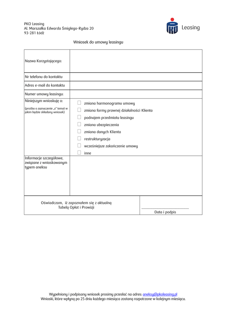 PKO Leasing Al. Marszałka Edwarda Śmigłego-Rydza 20 93-281 Łódź Wniosek do umowy leasingu Nazwa Korzystającego: Nr telefonu do kontaktu Adres e-mail do kontaktu Numer umowy leasingu: Niniejszym wnioskuję o: (prośba o zaznaczenie „x” temat w jakim będzie składany wniosek) zmiana harmonogramu umowy zmiana formy prawnej działalności Klienta podnajem przedmiotu leasingu zmiana ubezpieczenia zmiana danych Klienta restrukturyzacja wcześniejsze zakończenie umowy inne Informacje szczegółowe, związane z wnioskowanym typem aneksu Oświadczam, iż zapoznałem się z aktualną Tabelą Opłat i Prowizji ……………………………………………………… Data i podpis Wypełniony i podpisany wniosek prosimy przesłać na adres: [email protected] Wnioski, które wpłyną po 25 dniu każdego miesiąca zostaną rozpatrzone w kolejnym miesiącu.