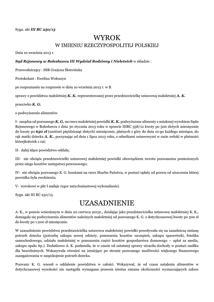 Sygn. akt III RC 250/13 WYROK W IMIENIU RZECZYPOSPOLITEJ POLSKIEJ Dnia 10 września 2013 r. Sąd Rejonowy w Bolesławcu III Wydział Rodzinny i Nieletnich w składzie : Przewodniczący : SSR Grażyna Słotwińska Protokolant : Ewelina Wołoszyn po rozpoznaniu na rozprawie w dniu 10 września 2013 r. w B. sprawy z powództwa małoletniej K. K. reprezentowanej przez przedstawicielkę ustawową małoletniej A. K. przeciwko K. G. o podwyższenie alimentów I- zasądza od pozwanego K. G. na rzecz małoletniej powódki K. K. podwyższone alimenty z ustalonej wyrokiem Sądu Rejonowego w Bolesławcu z dnia 30 stycznia 2013 roku w sprawie IIIRC 358/12 kwoty po 500 złotych miesięcznie do kwoty po 650 zł (sześćset pięćdziesiąt złotych) miesięcznie, płatnych z góry do dnia 10-go każdego miesiąca, do rąk matki dziecka A. K., poczynając od dnia 1 lipca 2013 roku, z odsetkami ustawowymi w razie zwłoki w płatności którejkolwiek z rat; II- dalej idące powództwo oddala; III- nie obciąża przedstawicielki ustawowej małoletniej powódki obowiązkiem zwrotu pozwanemu poniesionych przez niego kosztów zastępstwa procesowego; IV- nie obciąża pozwanego K. G. kosztami na rzecz Skarbu Państwa, w postaci opłaty od pozwu od uiszczenia której powódka była zwolnienia; V- wyrokowi w pkt I nadaje rygor natychmiastowej wykonalności. Sygn. akt III RC 250/13 UZASADNIENIE A. K., w pozwie wniesionym w dniu 20 czerwca 2013r., działając jako przedstawicielka ustawowa małoletniej K. K., domagała się podwyższenia alimentów należnych małoletniej od pozwanego K. G. z dotychczasowej kwoty po 500 zł do kwoty po 1.200 zł miesięcznie. W uzasadnieniu powództwa przedstawicielka ustawowa małoletniej powódki powoływała się na zasadniczą zmianę potrzeb dziecka (potrzebę zakupu nowej odzieży, ponoszenia kosztów szczepień, zakupu spacerówki, fotelika samochodowego, udziału małoletniej w ponoszeniu części kosztów gospodarstwa domowego – opłat za media, zakupu opału itp.). Dodatkowo A. K. podnosiła, że w czasie od ostatniej sprawy utraciła dochody w postaci zasiłku dla bezrobotnych. Wskazywała również na istniejące po stronie pozwanego możliwości większego finansowego zaangażowania w zaspokojenie potrzeb dziecka. Pozwany K. G. wnosił o oddalenie powództwa w całości. Wskazywał, że od czasu ustalenia alimentów w dotychczasowej wysokości nie nastąpiła wymagana prawem istotna zmiana okoliczności wyznaczających zakres obowiązku alimentacyjnego. Ostatecznie zadeklarował, że może pokrywać „extra” wydatki typu zakup spacerówki, fotelika samochodowego, koszty zakupu szczepionek czy leków w razie choroby dziecka. Rodzaj i górna granicach tych wydatków mogłaby zostać ustalona w ugodzie sądowej, a zapłata należności następowałaby po okazaniu dowodu poniesienia wydatku przez matkę dziecka. Przedstawicielka ustawowa małoletniej nie zaakceptowała propozycji ugody, twierdząc, że ona zna aktualne potrzeby dziecka i chciałaby móc je zaspokajać z regularnie otrzymywanych alimentów. Po przeprowadzeniu w sprawie postępowania dowodowego Sąd ustalił w sprawie co następuje: Sąd Rejonowy w Bolesławcu wyrokiem z dnia 30 stycznia 2013r. zobowiązał pozwanego K. G. do łożenia na utrzymanie córki alimentów w kwocie po 500 zł miesięcznie poczynając od 01 września 2012r. Wyrok uwzględniał zgłoszone przez matkę dziecka żądanie w całości. Pozwany nie stawiał się na rozprawy. W aktach brak ustaleń co do wysokości dochodu uzyskiwanego przez K. G. w tym okresie. Matka małoletniej A. K., w dacie wyrokowania pobierała zasiłek dla bezrobotnych w kwocie 460 zł miesięcznie. Miesięczny koszt utrzymania dziecka jego przedstawicielka ustawowa liczyła na minimum 500 zł miesięcznie, uwzględniając wydatki na pampersy, ubrania, szczepionki i witaminy, kosmetyki, koszt dożywiania dziecka ponad karmienie piersią ale także koszty utrzymania wspólnego gospodarstwa domowego przypadające na powódkę. Dowód: akta tutejszego Sądu III RC 358/12. K. K. w maju 2013r. ukończyła rok. Matka małoletniej ponosi typowe dla dziecka w tym wieku koszty utrzymania. Małoletnia jest dzieckiem zdrowym. Sporadycznie zdarzają się jej infekcje. Miesięczny koszt utrzymania dziecka A. K. liczy na ponad 1.000 zł (100-150 zł pampersy, 400 zł jedzenie, 100-150 zł kosmetyki, 250-300 ubrania i obuwie, 100 zł witaminy i suplementy, 50 zł drobne akcesoria typu smoczki, butelki, kubki plus opłaty za media i koszty komunikacji). Aktualnie matka małoletniej A. K. jest osobą bezrobotną, bez dochodów. Prawo do pobieranego wcześniej zasiłku dla bezrobotnych utraciła w maju 2013r. Z uwagi na potrzebę osobistej pieczy nad dwójką małych dzieci, nie jest w stanie podjąć pracy zarobkowej. A. K., poza małoletnią córką stron wychowuje starszą córkę w wieku 4 lat, na która pobiera alimenty w wysokości 500 zł miesięcznie, Ojciec tego dziecka – według relacji matki - angażuje się dodatkowo w jego utrzymanie. A. K. wraz z dziećmi mieszka u swojej matki. Rachunki za media, opał dzielone są na dwie bądź trzy części (w budynku zamieszkuje również ojciec A. K., ale on prowadzi odrębne gospodarstwo domowe). Co miesiąc, półtora jest wywożone szambo, co kosztuje 200 zł, 50 zł miesięcznie kosztuje gaz, do tego dochodzi opłata za energię elektryczną i koszt zakupu opału, który za ubiegły sezon matka małoletniej liczy na 5.000 zł (2.000 zł węgiel i drzewo oraz koszt wymiany pieca). Pozwany płaci do rąk matki dziecka ustalone alimenty po 500 zł miesięcznie. W kwietniu bieżącego roku dodatkowo na utrzymanie dziecka przekazał 500 zł. Ponadto w utrzymaniu dziecka nie pomaga. Dowody: zeznania A. K. k.18-18 (12-12verte). Pozwany K. G. od czterech lat prowadzi działalność gospodarczą (...) zarejestrowaną na terenie (...) Pracuje sam, nie zatrudnia pracowników Jego roczny dochód waha się w granicach 9.000-1.000