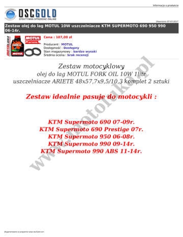 Informacje o produkcie Utworzono 07-03-2017 Zestaw olej do lag MOTUL 10W uszczelniacze KTM SUPERMOTO 690 950 990 06-14r. Cena : 107,00 zł Producent : MOTUL Dostępność : Dostępny Stan magazynowy : bardzo wysoki Średnia ocena : brak recenzji a. pl Zestaw motocyklowy uk olej do lag MOTUL FORK OIL 10W 1litr uszczelniacze ARIETE 48x57,7x9,5/10,3 komplet 2 sztuki ot ol Zestaw idealnie pasuje do motocykli : w w w .m KTM Supermoto 690 07-09r. KTM Supermoto 690 Prestige 07r. KTM Supermoto 950 06-08r. KTM Supermoto 990 09-14r. KTM Supermoto 990 ABS 11-14r. Wygenerowano w programie www.oscGold.com a. pl uk w w w .m ot ol Jeśli potrzebujesz innej lepkości oleju: wybierz 5W, 15W lub 20W i zaznacz w informacji przy zakupie.