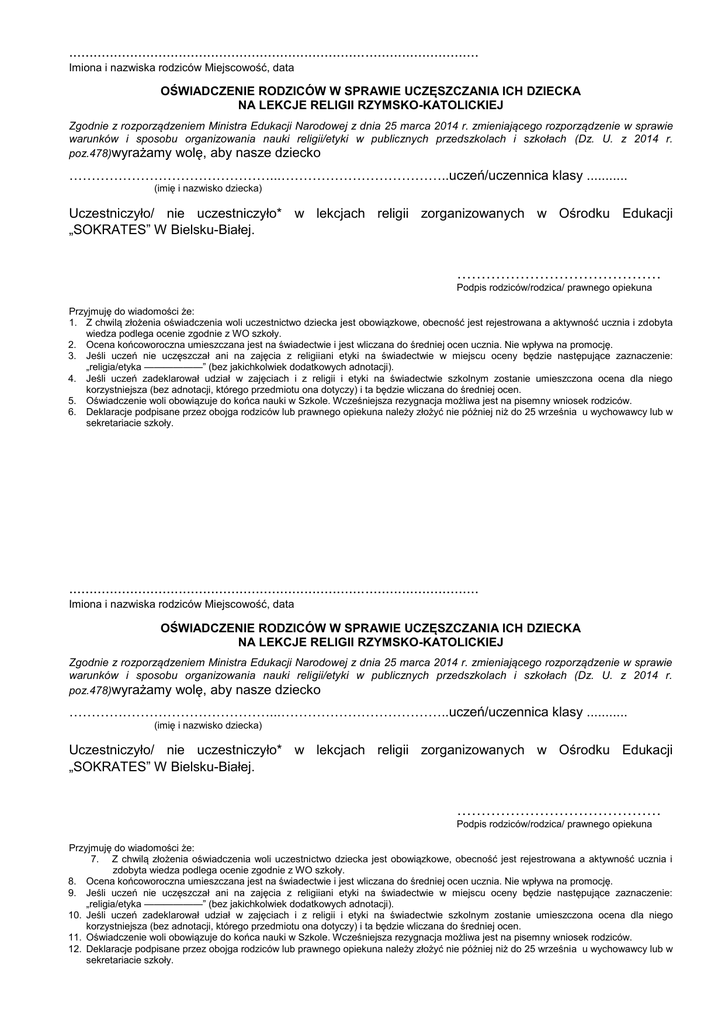 ..................................................................................................... Imiona i nazwiska rodziców Miejscowość, data OŚWIADCZENIE RODZICÓW W SPRAWIE UCZĘSZCZANIA ICH DZIECKA NA LEKCJE RELIGII RZYMSKO-KATOLICKIEJ Zgodnie z rozporządzeniem Ministra Edukacji Narodowej z dnia 25 marca 2014 r. zmieniającego rozporządzenie w sprawie warunków i sposobu organizowania nauki religii/etyki w publicznych przedszkolach i szkołach (Dz. U. z 2014 r. poz.478)wyrażamy wolę, aby nasze dziecko ………………………………………...………………………………..uczeń/uczennica klasy ........... (imię i nazwisko dziecka) Uczestniczyło/ nie uczestniczyło* w lekcjach religii zorganizowanych w Ośrodku Edukacji „SOKRATES” W Bielsku-Białej. …………………………………… Podpis rodziców/rodzica/ prawnego opiekuna Przyjmuję do wiadomości że: 1. Z chwilą złożenia oświadczenia woli uczestnictwo dziecka jest obowiązkowe, obecność jest rejestrowana a aktywność ucznia i zdobyta wiedza podlega ocenie zgodnie z WO szkoły. 2. Ocena końcoworoczna umieszczana jest na świadectwie i jest wliczana do średniej ocen ucznia. Nie wpływa na promocję. 3. Jeśli uczeń nie uczęszczał ani na zajęcia z religiiani etyki na świadectwie w miejscu oceny będzie następujące zaznaczenie: „religia/etyka ——————” (bez jakichkolwiek dodatkowych adnotacji). 4. Jeśli uczeń zadeklarował udział w zajęciach i z religii i etyki na świadectwie szkolnym zostanie umieszczona ocena dla niego korzystniejsza (bez adnotacji, którego przedmiotu ona dotyczy) i ta będzie wliczana do średniej ocen. 5. Oświadczenie woli obowiązuje do końca nauki w Szkole. Wcześniejsza rezygnacja możliwa jest na pisemny wniosek rodziców. 6. Deklaracje podpisane przez obojga rodziców lub prawnego opiekuna należy złożyć nie później niż do 25 września u wychowawcy lub w sekretariacie szkoły. ..................................................................................................... Imiona i nazwiska rodziców Miejscowość, data OŚWIADCZENIE RODZICÓW W SPRAWIE UCZĘSZCZANIA ICH DZIECKA NA LEKCJE RELIGII RZYMSKO-KATOLICKIEJ Zgodnie z rozporządzeniem Ministra Edukacji Narodowej z dnia 25 marca 2014 r. zmieniającego rozporządzenie w sprawie warunków i sposobu organizowania nauki religii/etyki w publicznych przedszkolach i szkołach (Dz. U. z 2014 r. poz.478)wyrażamy wolę, aby nasze dziecko ………………………………………...………………………………..uczeń/uczennica klasy ........... (imię i nazwisko dziecka) Uczestniczyło/ nie uczestniczyło* w lekcjach religii zorganizowanych w Ośrodku Edukacji „SOKRATES” W Bielsku-Białej. …………………………………… Podpis rodziców/rodzica/ prawnego opiekuna Przyjmuję do wiadomości że: 7. Z chwilą złożenia oświadczenia woli uczestnictwo dziecka jest obowiązkowe, obecność jest rejestrowana a aktywność ucznia i zdobyta wiedza podlega ocenie zgodnie z WO szkoły. 8. Ocena końcoworoczna umieszczana jest na świadectwie i jest wliczana do średniej ocen ucznia. Nie wpływa na promocję. 9. Jeśli uczeń nie uczęszczał ani na zajęcia z religiiani etyki na świadectwie w miejscu oceny będzie następujące zaznaczenie: „religia/etyka ——————” (bez jakichkolwiek dodatkowych adnotacji). 10. Jeśli uczeń zadeklarował udział w zajęciach i z religii i etyki na świadectwie szkolnym zostanie umieszczona ocena dla niego korzystniejsza (bez adnotacji, którego przedmiotu ona dotyczy) i ta będzie wliczana do średniej ocen. 11. Oświadczenie woli obowiązuje do końca nauki w Szkole. Wcześniejsza rezygnacja możliwa jest na pisemny wniosek rodziców. 12. Deklaracje podpisane przez obojga rodziców lub prawnego opiekuna należy złożyć nie później niż do 25 września u wychowawcy lub w sekretariacie szkoły.